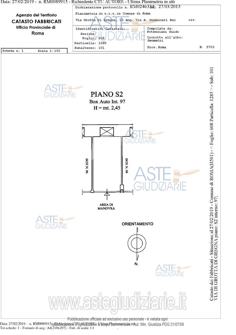 Vendita in attesa dell'emissione del nuovo bando d'asta. LOTTO 96: Proprietà piena ed esclusiva di box auto sito in comune di Roma (RM), quartiere "Collatino", municipio IV, via di Grotta di Gregna 23, piano S2, interno 97, posto all'interno di un edificio interrato con destinazione d'uso autorimessa, avente una superficie lorda di 13,30 mq. e un’altezza di circa 2,45 m. Ultimo prezzo base € 1.748,74 (offerta minima € 1.311,55). Giudice Dott. Bianca Ferramosca. Professionista delegato alla vendita Avv. Luca Bernardini. Custode Giudiziario Ivg Di Roma Srl - Email "pvp@visiteivgroma.it"; Tel. 0689569801. Rif. Tribunale di Roma - Esecuzione immobiliare post legge 80 n. 239/2018
