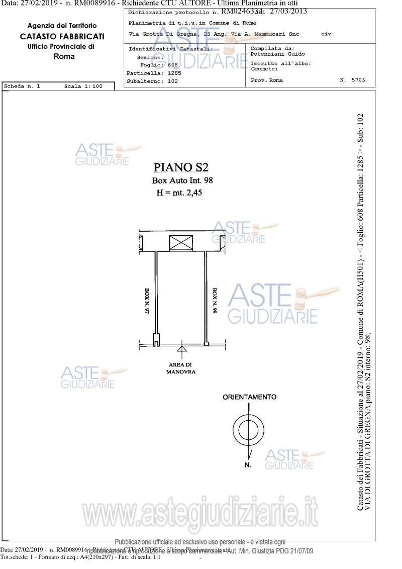 Vendita in attesa dell'emissione del nuovo bando d'asta. LOTTO 97: Proprietà piena ed esclusiva di box auto sito in comune di Roma (RM), quartiere "Collatino", municipio IV, via di Grotta di Gregna 23, piano S2, interno 98, posto all'interno di un edificio interrato con destinazione d'uso autorimessa, avente una superficie lorda di 13,20 mq. e un’altezza di circa 2,45 m. Ultimo prezzo base € 1.728,00 (offerta minima € 1.296,00). Giudice Dott. Bianca Ferramosca. Professionista delegato alla vendita Avv. Luca Bernardini. Custode Giudiziario Ivg Di Roma Srl - Email "pvp@visiteivgroma.it"; Tel. 0689569801. Rif. Tribunale di Roma - Esecuzione immobiliare post legge 80 n. 239/2018