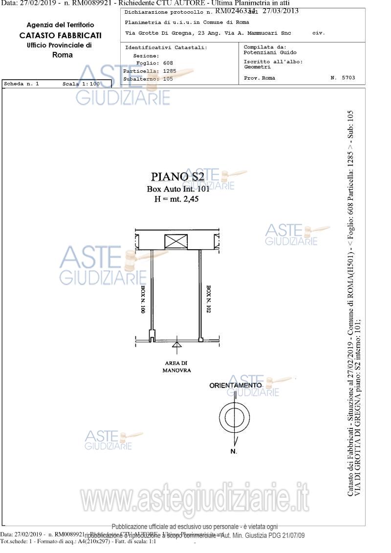 Vendita in attesa dell'emissione del nuovo bando d'asta. LOTTO 100: Proprietà piena ed esclusiva di box auto sito in comune di Roma (RM), quartiere "Collatino", municipio IV, via di Grotta di Gregna 23, piano S2, interno 101, posto all'interno di un edificio interrato con destinazione d'uso autorimessa, avente una superficie lorda di 13,50 mq. e un’altezza di circa 2,45 m. Ultimo prezzo base € 1.769,47 (offerta minima € 1.327,10). Giudice Dott. Bianca Ferramosca. Professionista delegato alla vendita Avv. Luca Bernardini. Custode Giudiziario Ivg Di Roma Srl - Email "pvp@visiteivgroma.it"; Tel. 0689569801. Rif. Tribunale di Roma - Esecuzione immobiliare post legge 80 n. 239/2018