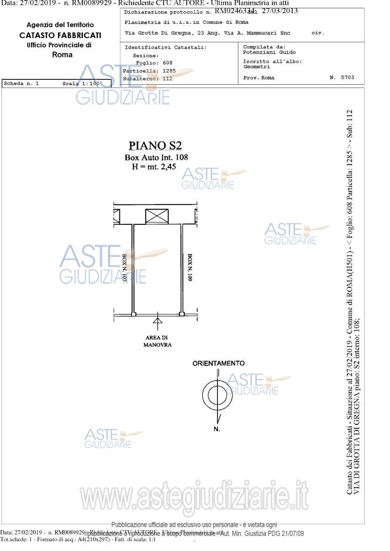Vendita in attesa dell'emissione del nuovo bando d'asta. LOTTO 107: Proprietà piena ed esclusiva di box auto sito in comune di Roma (RM), quartiere "Collatino", municipio IV, via di Grotta di Gregna 23, piano S2, interno 108, posto all'interno di un edificio interrato con destinazione d'uso autorimessa, avente una superficie lorda di 13,15 mq. e un’altezza di circa 2,45 m. Ultimo prezzo base € 1.728,00 (offerta minima € 1.296,00). Giudice Dott. Bianca Ferramosca. Professionista delegato alla vendita Avv. Luca Bernardini. Custode Giudiziario Ivg Di Roma Srl - Email "pvp@visiteivgroma.it"; Tel. 0689569801. Rif. Tribunale di Roma - Esecuzione immobiliare post legge 80 n. 239/2018