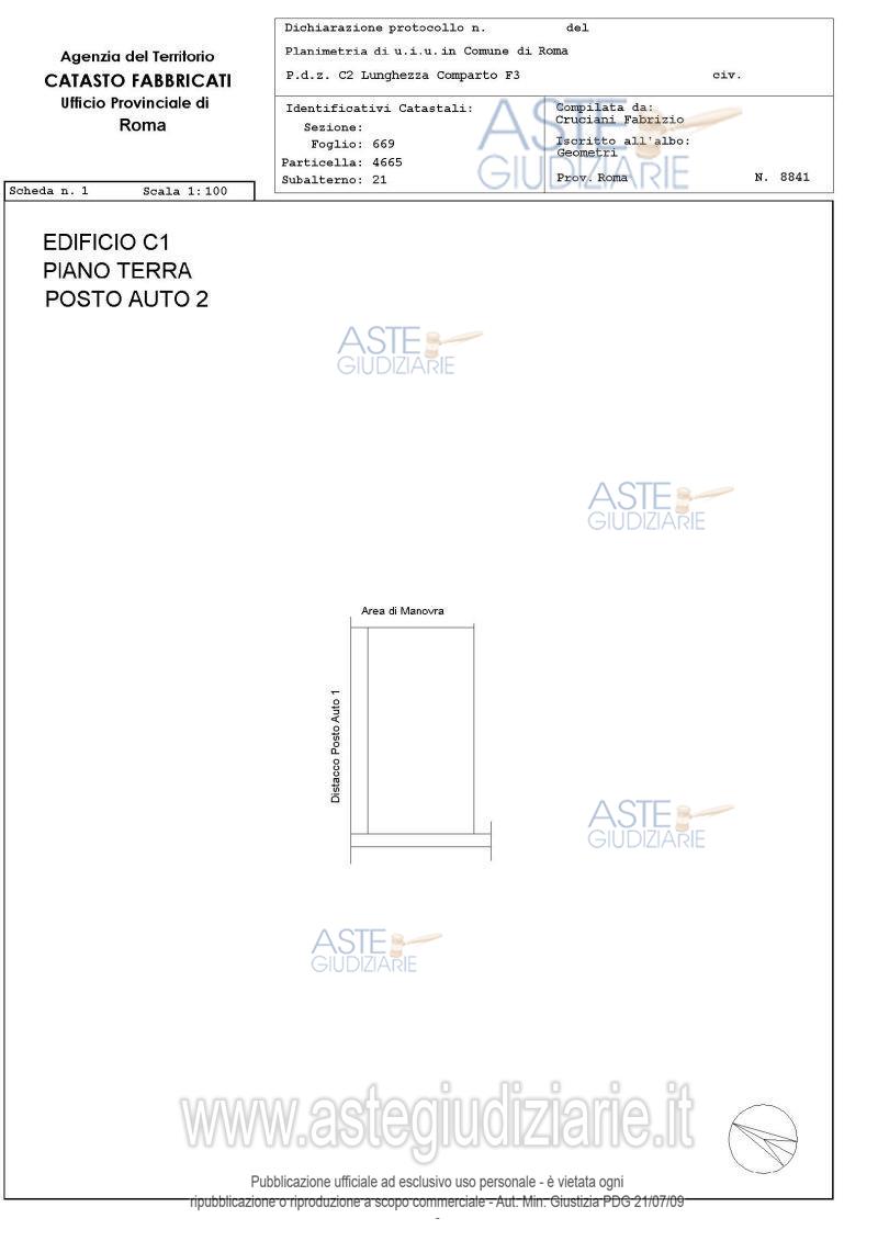 Vendita in attesa dell'emissione del nuovo bando d'asta. LOTTO 21: Posto auto ubicato a Roma (RM) - via Raffaello Liberti 115, edificio C1, piano terra. Ultimo prezzo base € 2.088,96 (offerta minima € 1.566,72). Giudice Bisceglie. Professionista delegato alla vendita Avv. Francesco Carluccio. Custode Giudiziario Ivg Di Roma Srl - Email "pvp@visiteivgroma.it"; Tel. 0689569801. Rif. Tribunale di Roma - Esecuzione immobiliare post legge 80 n. 398/2021