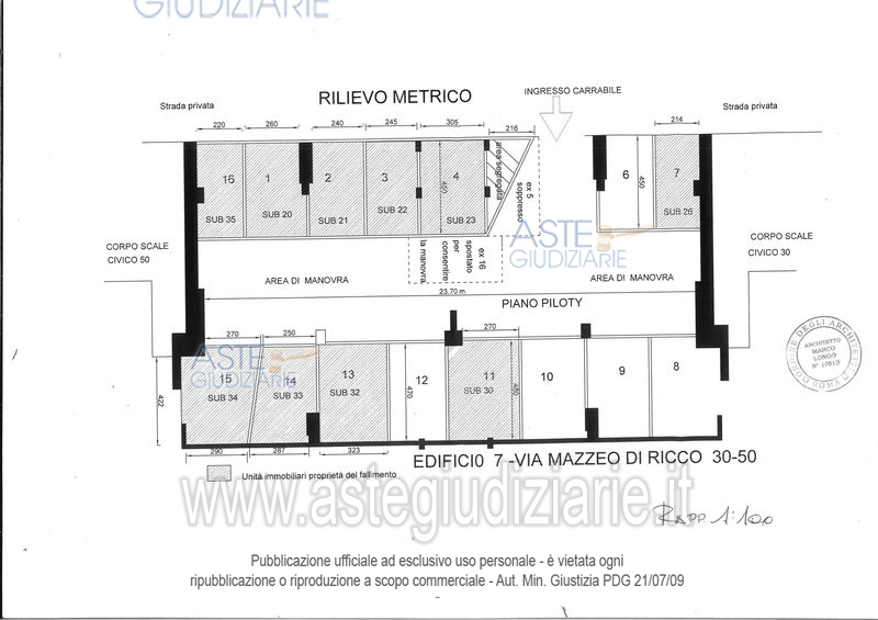 Vendita in attesa dell'emissione del nuovo bando d'asta. LOTTO 19: Posto auto coperto Piano piloty. Ultimo prezzo base € 675,00 (offerta minima € 550,00). Professionista delegato alla vendita Avv. Stefania Bellei. Curatore Avv. Filippo Silvestri. Rif. Tribunale di Roma - Fallimentare n. 563/2002