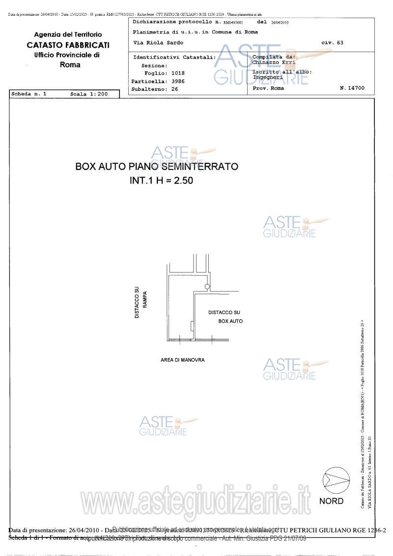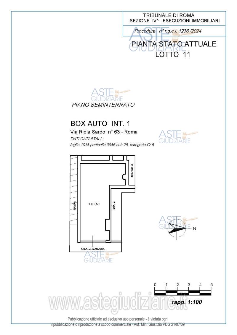 Vendita all'asta Senza incanto, con gara telematica asincrona - LOTTO 11: Garage ubicato a Roma (RM) - Via Riola Sardo n° 63 , interno 1, piano S1, per una superficie convenzionale complessiva di mq. 23,10 circa, . Prezzo base € 16.000,00 (offerta minima € 12.000,00). Data inizio operazioni di vendita: 26/05/2026 ore 10:00. Giudice Dott. Federica D'ambrosio. Professionista delegato alla vendita Avv. Roberto Tartaglia. Custode Giudiziario Ivg Di Roma Srl - Email "pvp@visiteivgroma.it"; Tel. 0689569801. Rif. Tribunale di Roma - Espropriazione immobiliare (cartabia) n. 1236/2024