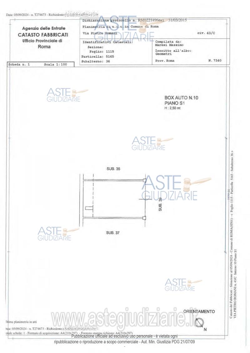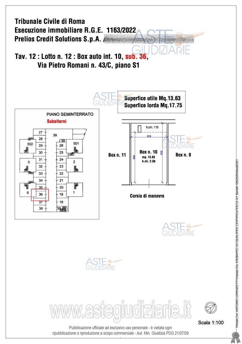 Vendita all'asta Senza incanto, con gara telematica asincrona - LOTTO 12: Quota pari al 100/100 (1/1) del diritto di piena proprietà sull’immobile sito in Roma composto da: Garage ubicato a Roma (RM) - Via Pietro Romani n. 43/A int. 10, interno 10, piano S1. Prezzo base € 20.000,00 (offerta minima € 15.000,00). Data inizio operazioni di vendita: 26/02/2026 ore 14:00. Giudice Dott. Fernando Scolaro. Professionista delegato alla vendita Avv. Gianfranco Buonocunto. Custode Giudiziario Ivg Di Roma Srl - Email "pvp@visiteivgroma.it"; Tel. 0689569801. Rif. Tribunale di Roma - Esecuzione immobiliare post legge 80 n. 1163/2022
