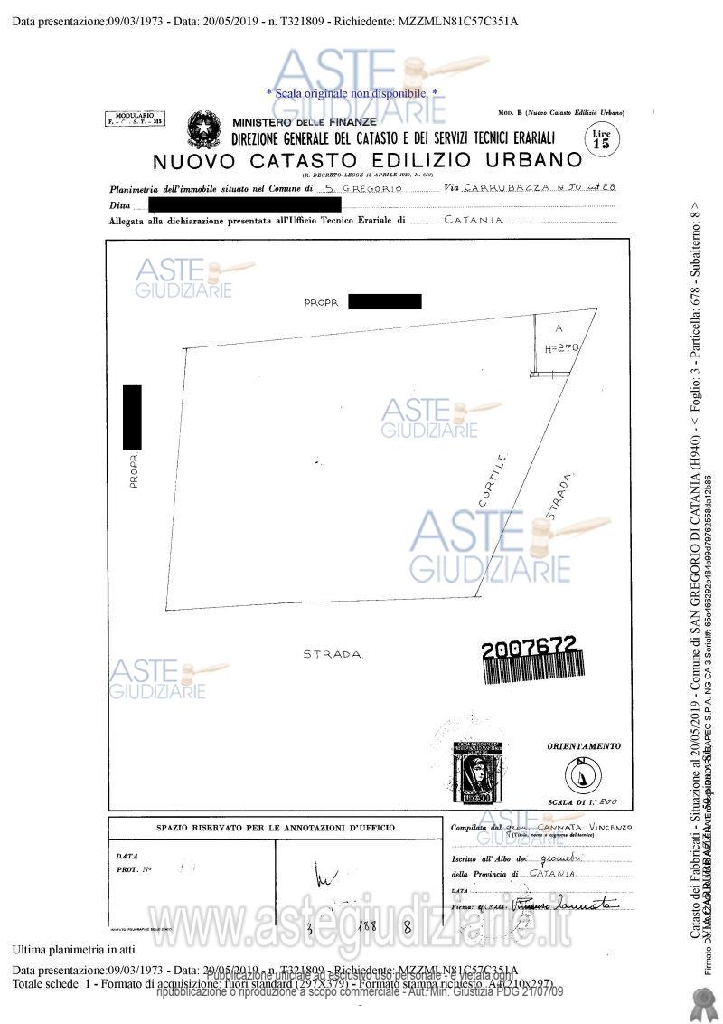 Vendita all'asta Senza incanto, con gara telematica sincrona - LOTTO 2: Garage nel Comune di San Gregorio di Catania (CT), posto al piano terra di un edificio a tre elevazioni, contrassegnato con la lettera “A”, avente accesso dal civico 20 della Via Leonardo Da Vinci (in catasto via Carrubbazza n. 50, piano seminterrato) tramite un cancello in ferro carrabile. Il tutto come censito nel N.C.E.U. al Foglio 3, particella 678, subalterno 8, Categoria catastale C/6 di classe 4, piano terra, consistenza mq. 28, rendita catastale € 49,17. Prezzo base € 10.846,00 (offerta minima € 8.135,00). Data vendita 16/06/2026 ore 16:00. Professionista delegato alla vendita: Avv. Saverio Vacirca - Email "visite@aavg.it"; Tel. 095/2163386.