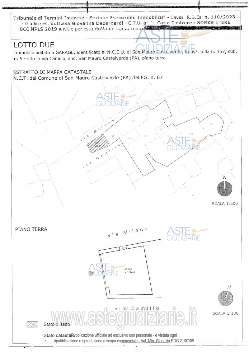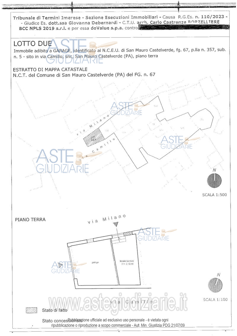 Vendita all'asta Senza incanto, con gara telematica sincrona - LOTTO 2: Garage sito in San Mauro Castelverde (PA), via Camillo, snc, piano T, ad una elevazione fuori terra, con affaccio sia su via Camillo, dove è posto l’ingresso al cespite, che su via Milano, esteso mq. 18,60 circa, costituito da un unico vano, identificato al N.C.E.U. del Comune di San Mauro Castelverde (PA), al foglio di mappa n. 67, part. n. 357, sub. n. 5. Prezzo base € 1.222,77 (offerta minima € 917,07). Data vendita 11/03/2026 ore 09:30. Professionista delegato alla vendita Avv. Giancarlo Lo Bello - Email "avvgiancarlolobello@libero.it"; Tel. 0918113722. Custode Giudiziario Avv. Giancarlo Lo Bello - Email "avvgiancarlolobello@libero.it"; Tel. 0918113722. Rif. Tribunale di Termini Imerese - Espropriazione immobiliare (cartabia) n. 110/2023