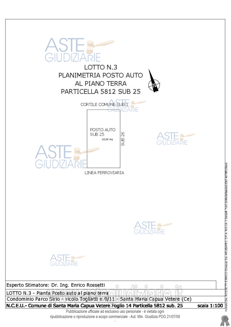 Vendita all'asta Senza incanto, con gara telematica asincrona - LOTTO 3: Piena ed intera proprietà di posto auto scoperto al piano terra appartenente al Condominio Parco Sirio ubicato in Santa Maria Capua Vetere (Ce) al vicolo Togliatti n.9/11. Prezzo base € 2.700,00 (offerta minima € 2.025,00). Data inizio operazioni di vendita: 23/06/2026 ore 10:30. Giudice Linda Catagna. Professionista delegato alla vendita Avv. Vincenzo Piccone - Email "picconevincenzo@outlook.it". Custode Giudiziario Avv. Vincenzo Piccone - Email "picconevincenzo@outlook.it". Rif. Tribunale di Santa Maria Capua Vetere - Esecuzione immobiliare post legge 80 n. 279/2024