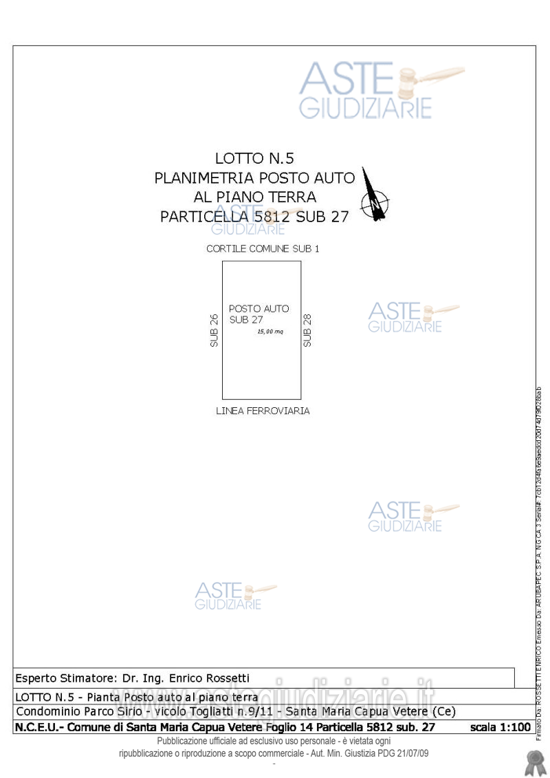 Vendita all'asta Senza incanto, con gara telematica asincrona - LOTTO 5: Piena ed intera proprietà di posto auto scoperto al piano terra appartenente al Condominio Parco Sirio ubicato in Santa Maria Capua Vetere (Ce) al vicolo Togliatti n.9/11. Prezzo base € 2.700,00 (offerta minima € 2.025,00). Data inizio operazioni di vendita: 23/06/2026 ore 10:30. Giudice Linda Catagna. Professionista delegato alla vendita Avv. Vincenzo Piccone - Email "picconevincenzo@outlook.it". Custode Giudiziario Avv. Vincenzo Piccone - Email "picconevincenzo@outlook.it". Rif. Tribunale di Santa Maria Capua Vetere - Esecuzione immobiliare post legge 80 n. 279/2024