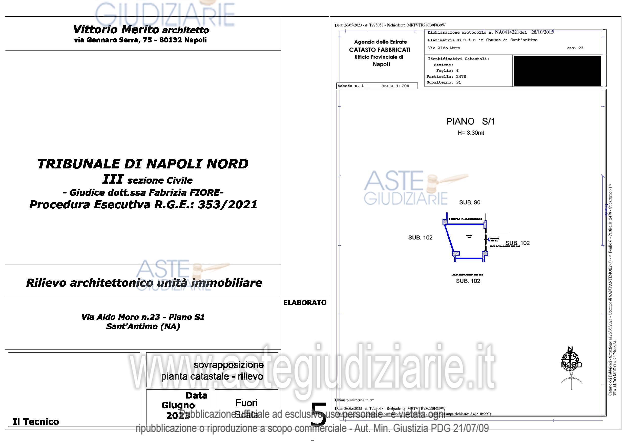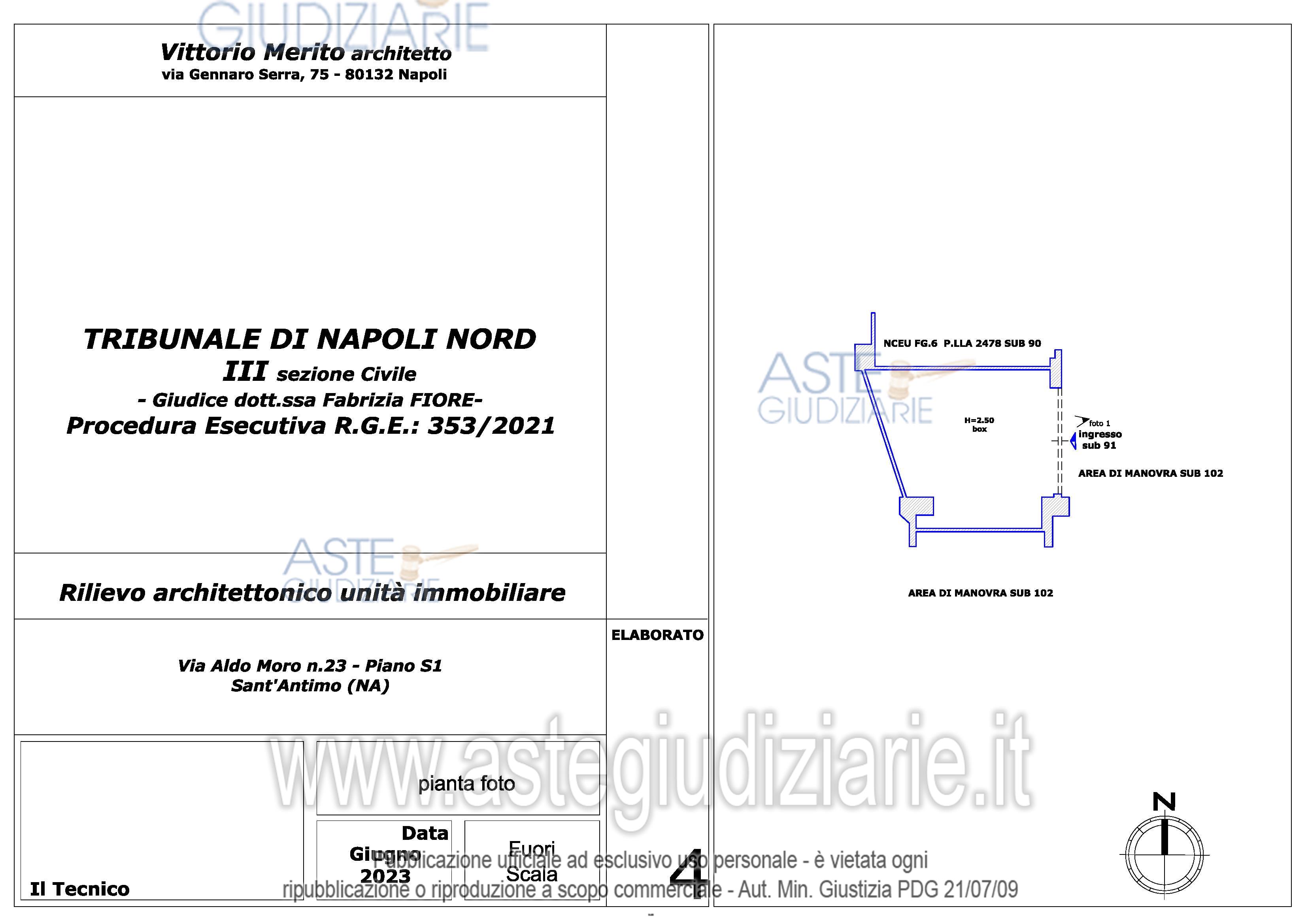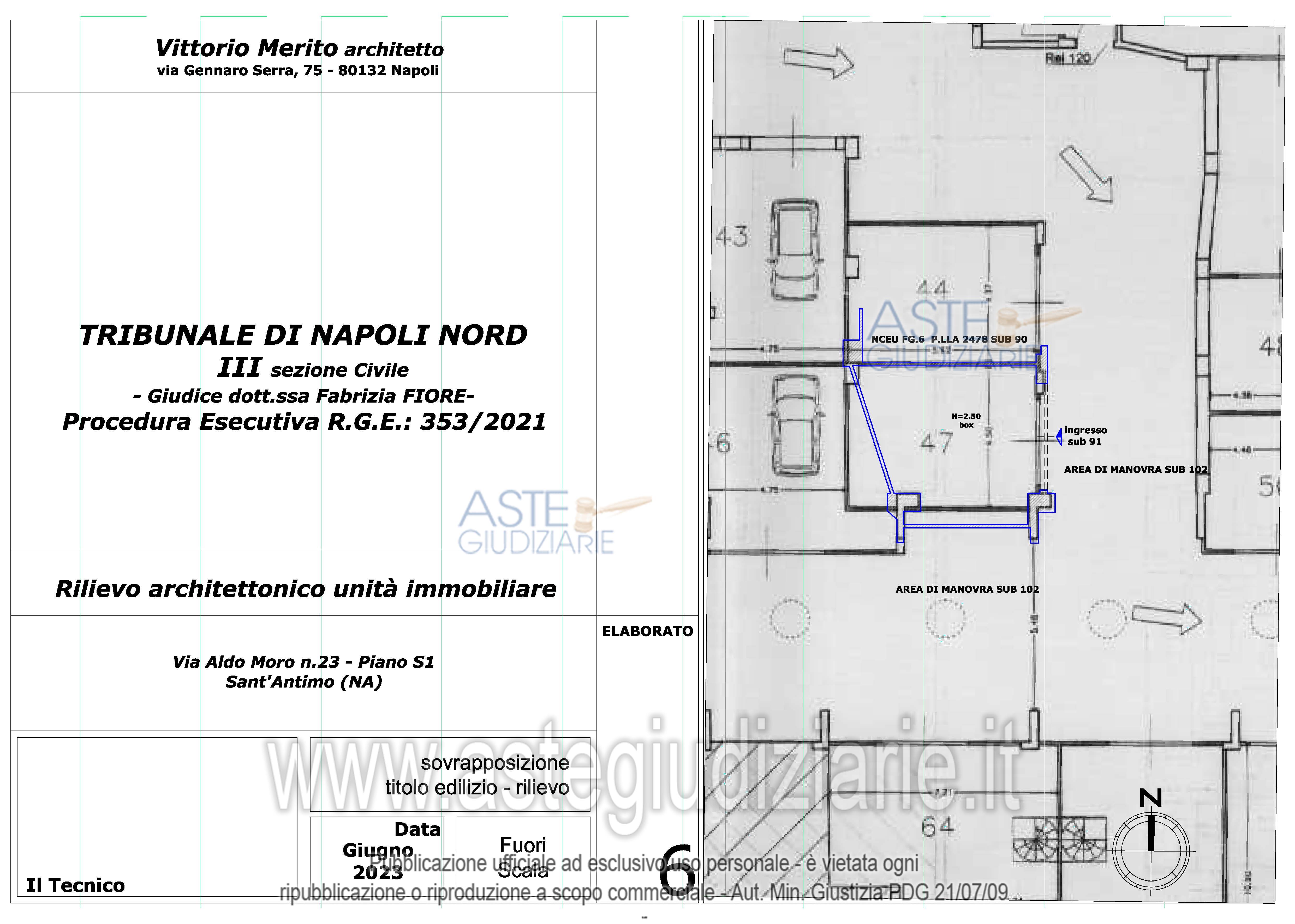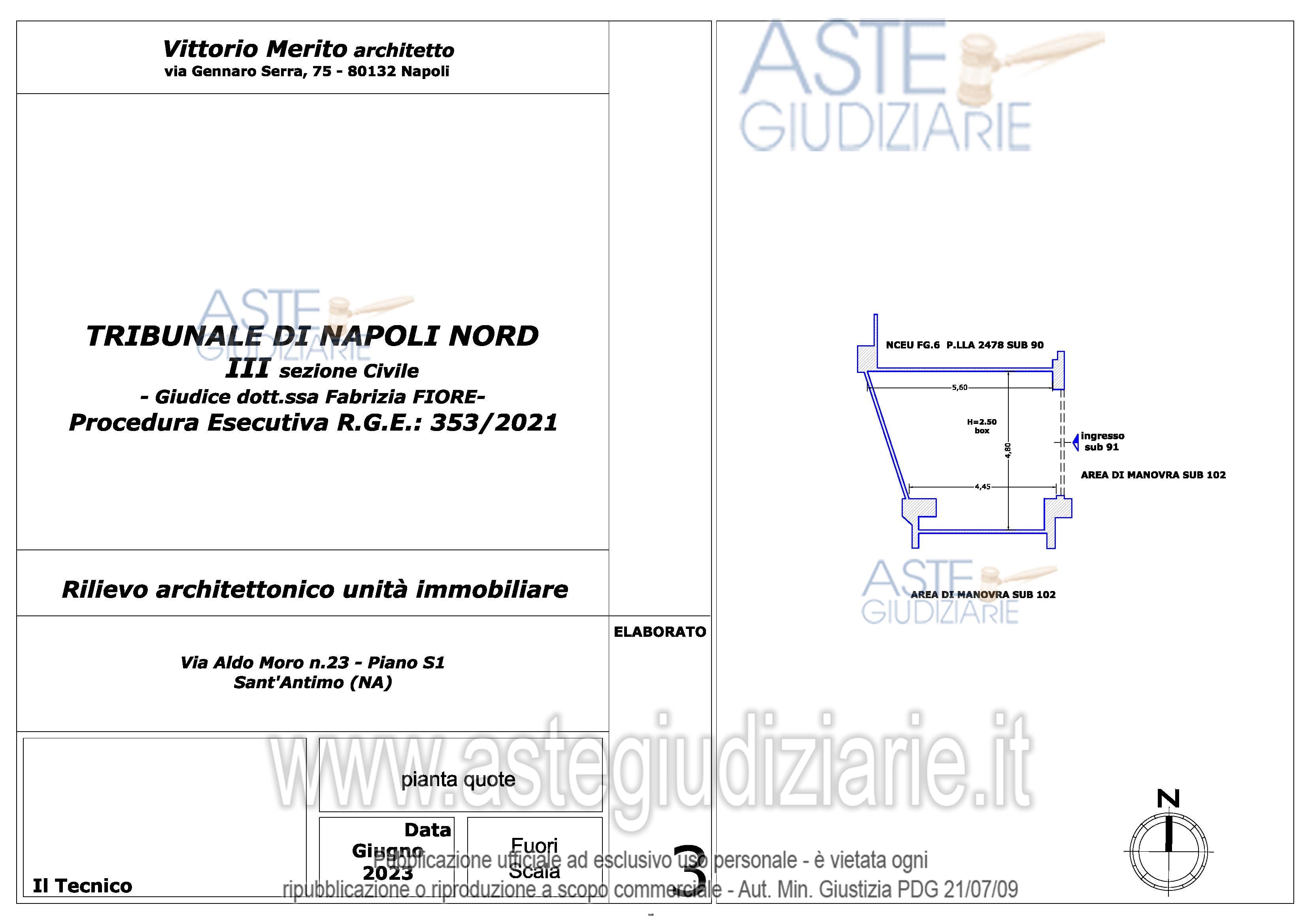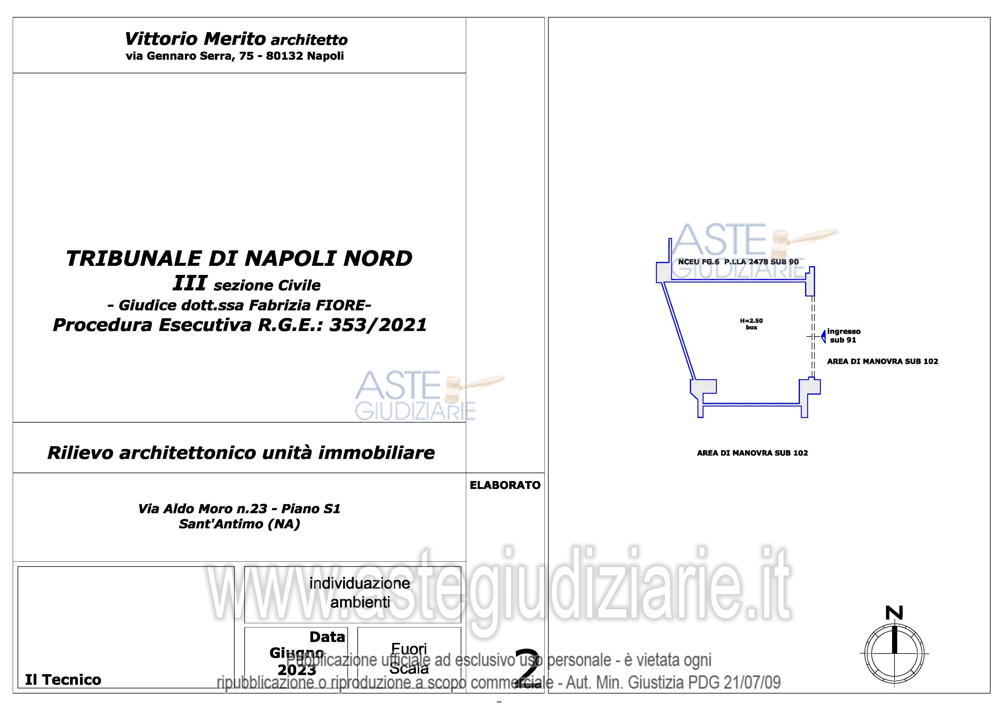 Vendita all'asta Senza incanto, con gara telematica asincrona - LOTTO 45: LOTTO QUARANTACINQUE - Garage , sito nel Comune di Sant’Antimo (Na) via Aldo Moro 21, piano S1 “Parco Omissis”, composto da un locale box; riportato nel NCEU del Comune di Sant’Antimo, foglio 6, particella 2478, sub. 91, cat. C/6, classe 3, consistenza 23 mq, sup. cat. 26 mq, rendita € 51,08 – via Aldo Moro n° 23 - piano S1; il descritto stato dei luoghi corrisponde alla consistenza catastale. Il bene de quo risulta libero e, per quanto dichiarato in sede di accesso, nella disponibilità dell’esecutato. . Prezzo base € 12.600,00 (offerta minima € 9.450,00). Data inizio operazioni di vendita: 27/11/2025 ore 16:00. Custode Giudiziario Dott. Francesco Russo - Email "studiocasillorusso@libero.it"; Tel. 0815404454. Rif. Tribunale di Napoli Nord - Esecuzione immobiliare post legge 80 n. 353/2021