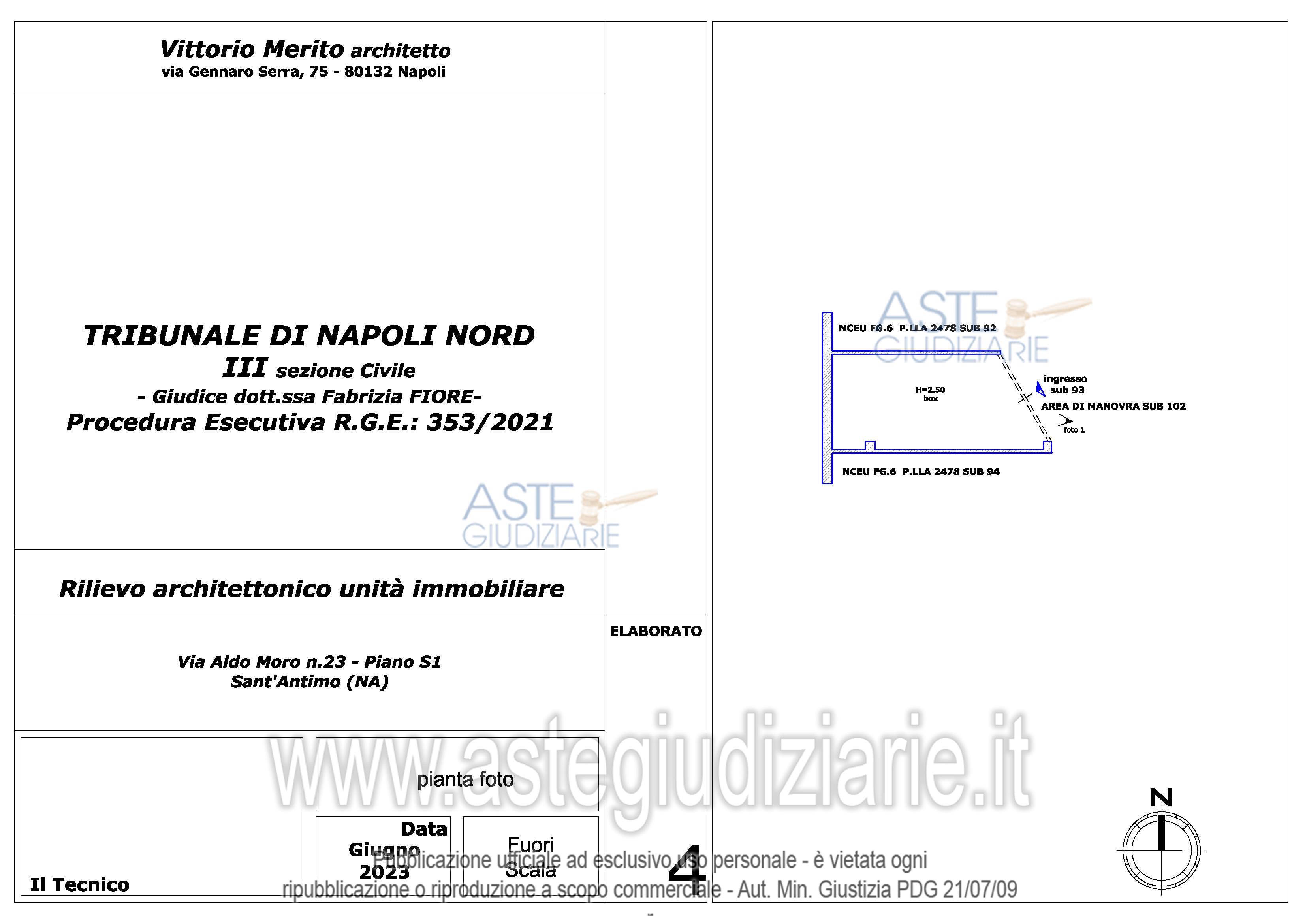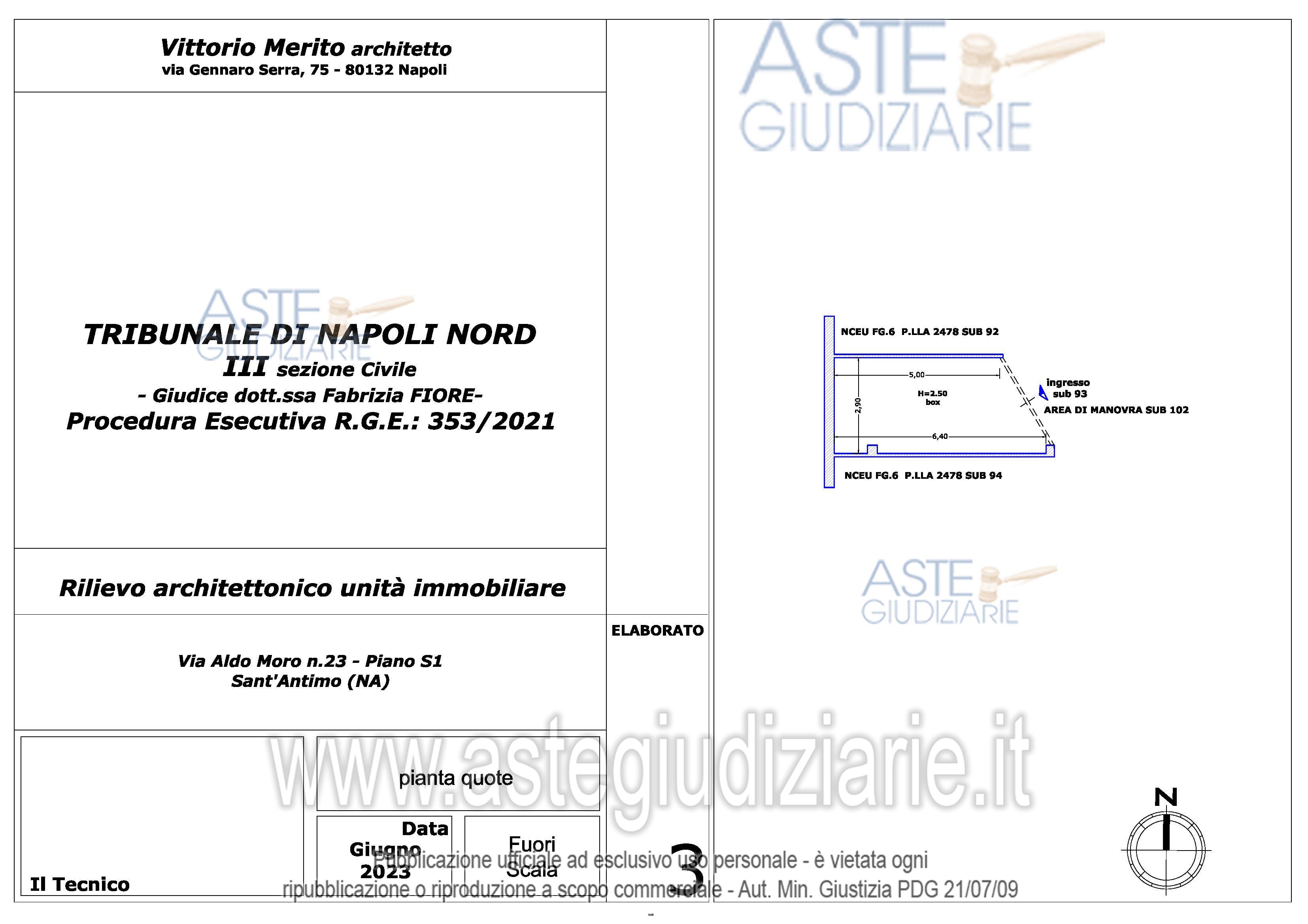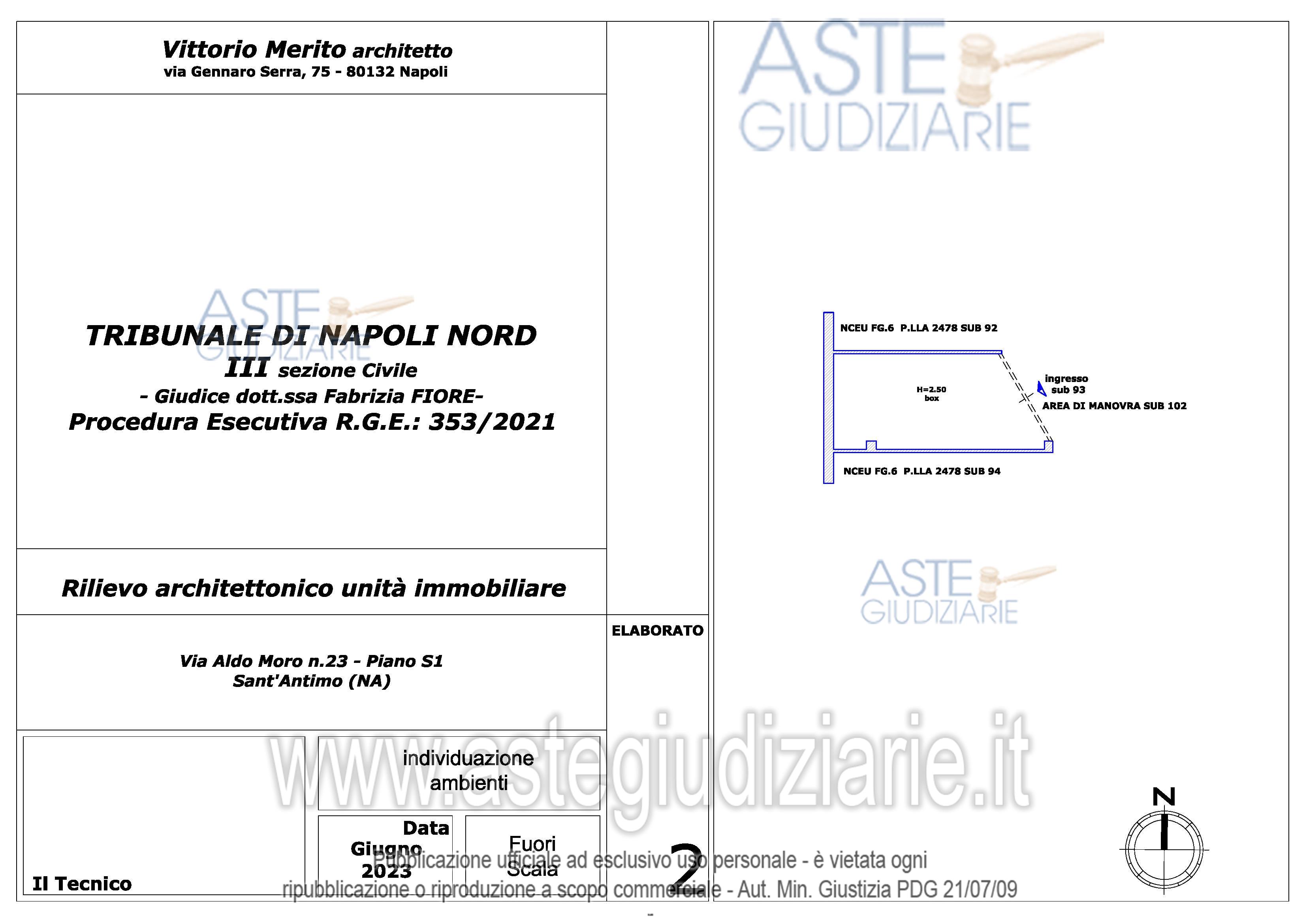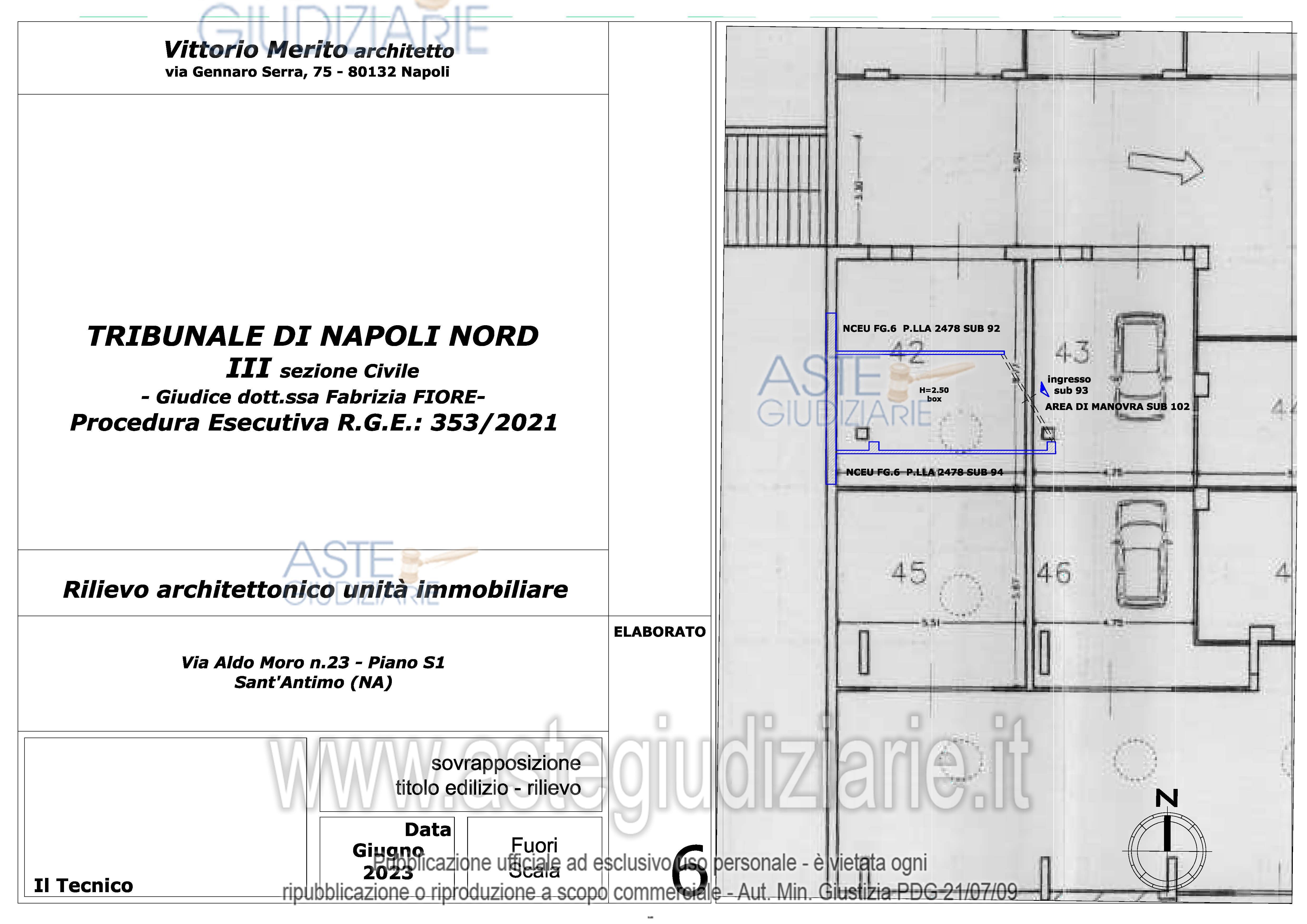 Vendita all'asta Senza incanto, con gara telematica asincrona - LOTTO 47: LOTTO QUARANTASETTE - Garage sito nel Comune di Sant’Antimo (Na) via Aldo Moro 21, piano S1 “Parco Omissis” composto da un locale box; riportato nel NCEU del Comune di Sant’Antimo, foglio 6, particella 2478, sub. 93, cat. C/6, classe 3, consistenza 17 mq, sup. cat. 19 mq, rendita € 37,75 – via Aldo Moro n° 23 - piano S1; il descritto stato dei luoghi corrisponde alla consistenza catastale. Il bene de quo è libero nella disponibilità dell'esecutato. Prezzo base € 8.800,00 (offerta minima € 6.600,00). Data inizio operazioni di vendita: 27/11/2025 ore 16:00. Custode Giudiziario Dott. Francesco Russo - Email "studiocasillorusso@libero.it"; Tel. 0815404454. Rif. Tribunale di Napoli Nord - Esecuzione immobiliare post legge 80 n. 353/2021