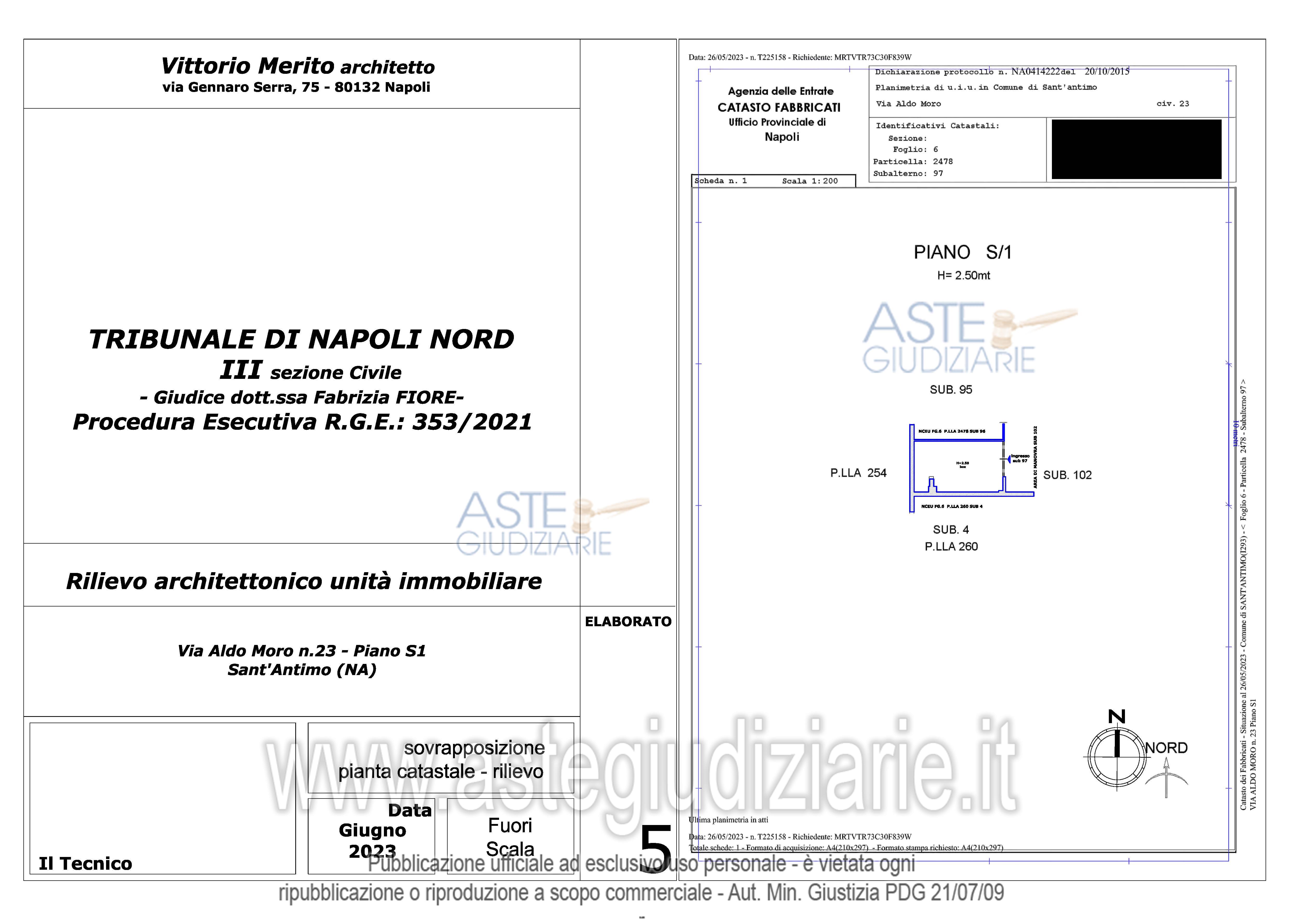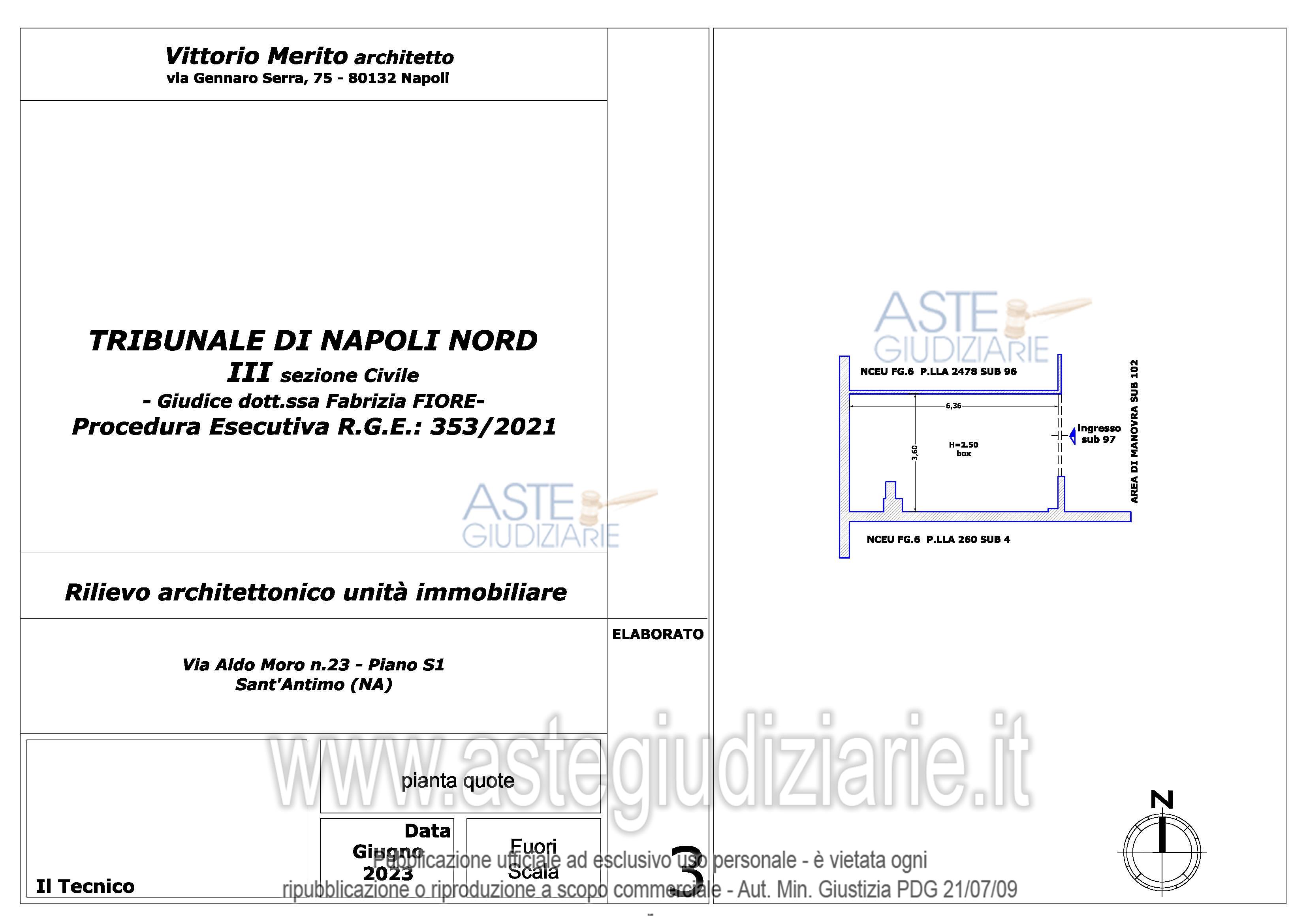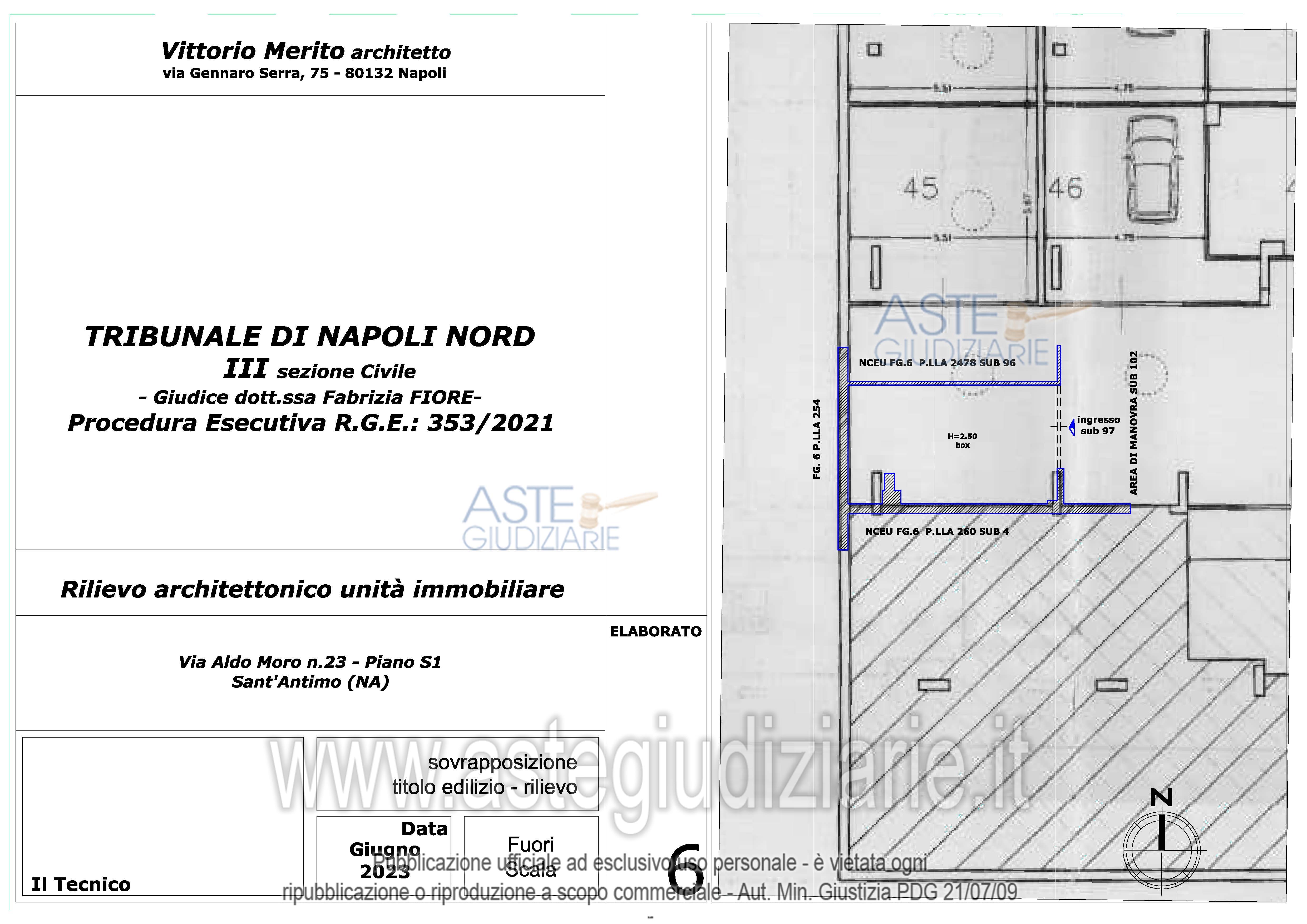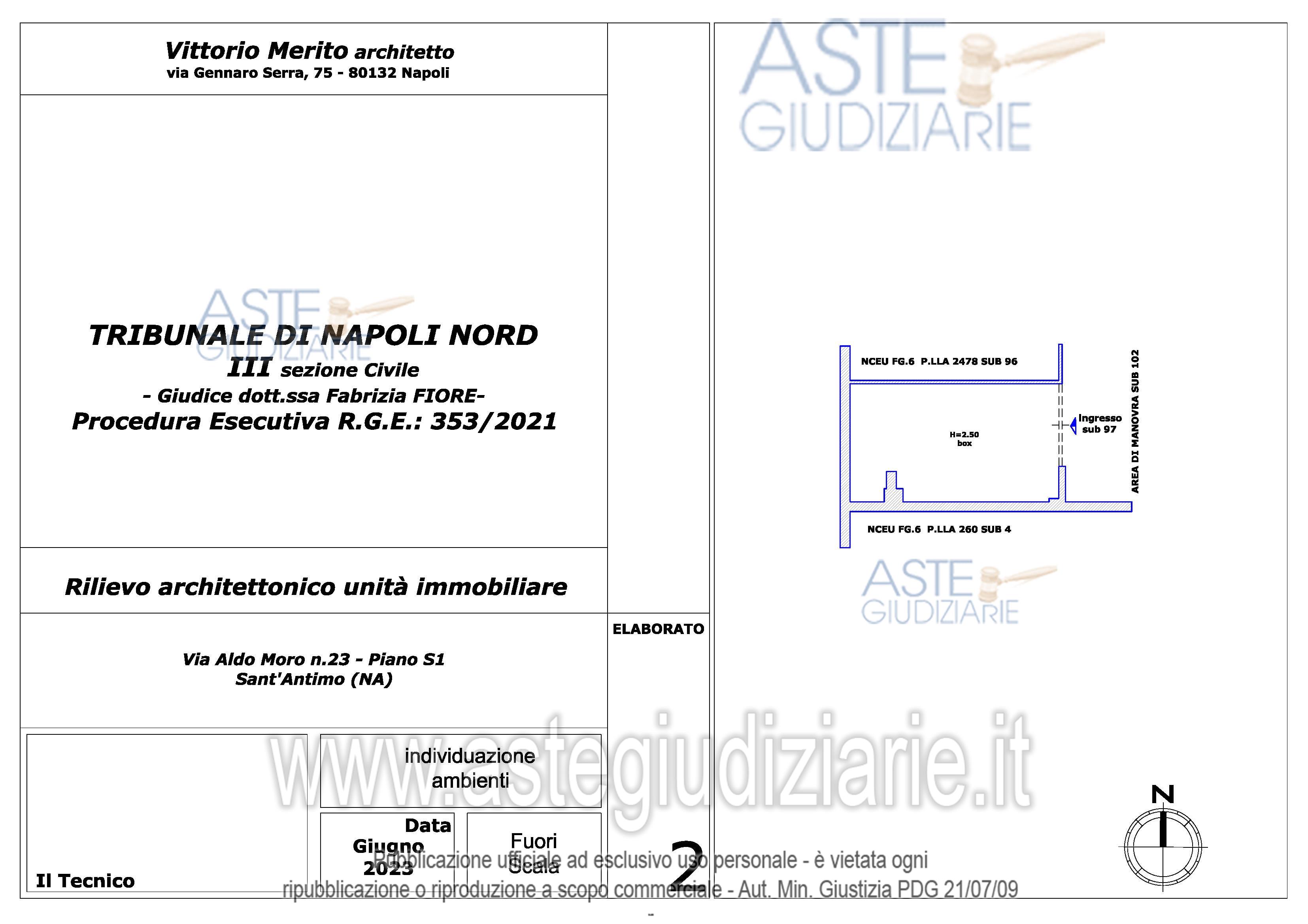 Vendita all'asta Senza incanto, con gara telematica asincrona - LOTTO 51: LOTTO CINQUANTUNO - Garage, sito nel Comune di Sant’Antimo (Na) via Aldo Moro 21, piano S1 – “Parco Omissis”, composto da un locale box; riportato nel NCEU del Comune di Sant’Antimo, foglio 6, particella 2478, sub. 97, cat. C/6, classe 3, consistenza 22 mq, sup. cat. 26 mq, rendita € 48,86 – via Aldo Moro n° 23 - piano S1; il descritto stato dei luoghi corrisponde alla consistenza catastale. Il bene de quo risulta libero e, per quanto dichiarato in sede di accesso, nella disponibilità dell’esecutato. Prezzo base € 12.000,00 (offerta minima € 9.000,00). Data inizio operazioni di vendita: 27/11/2025 ore 16:00. Custode Giudiziario Dott. Francesco Russo - Email "studiocasillorusso@libero.it"; Tel. 0815404454. Rif. Tribunale di Napoli Nord - Esecuzione immobiliare post legge 80 n. 353/2021