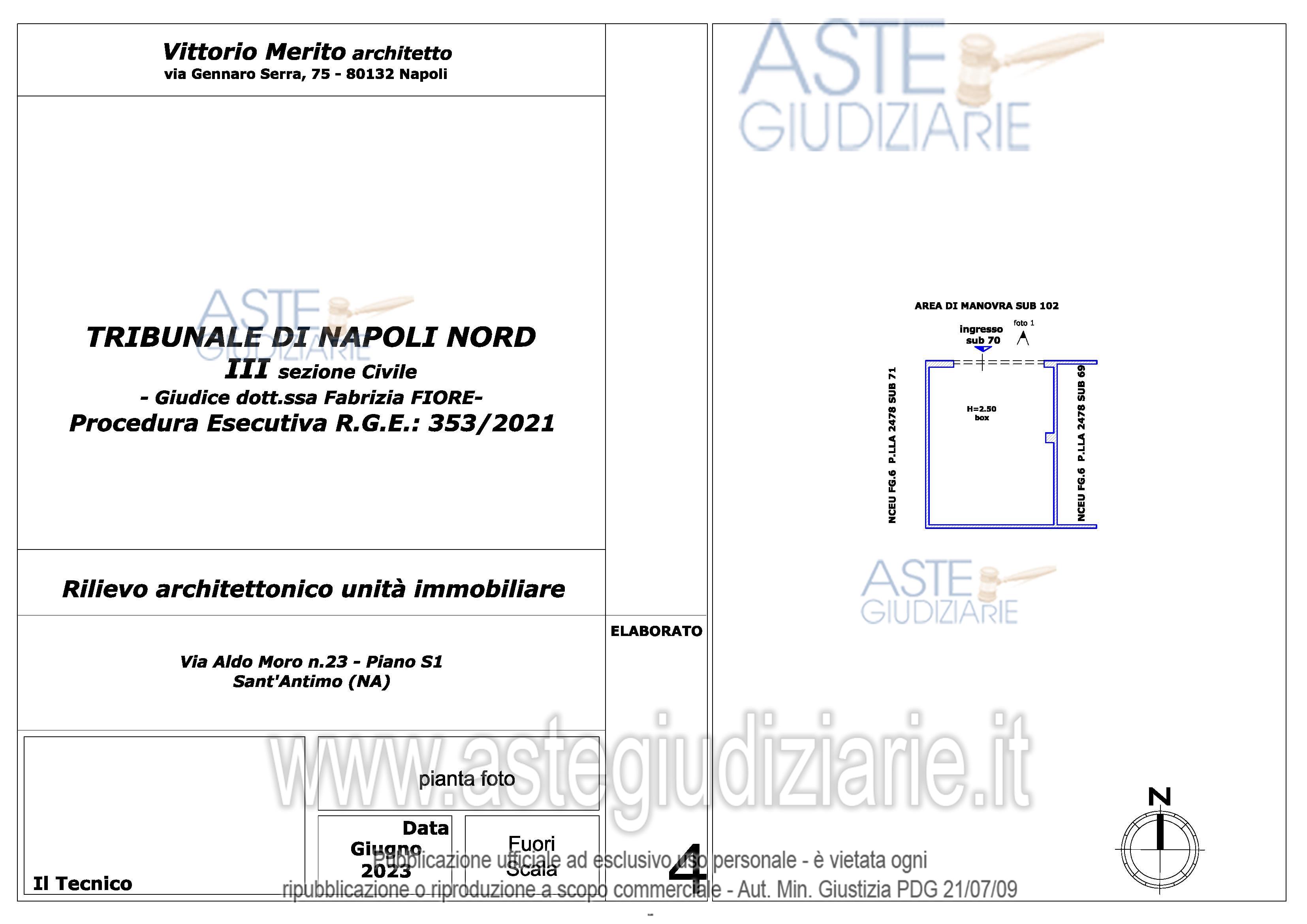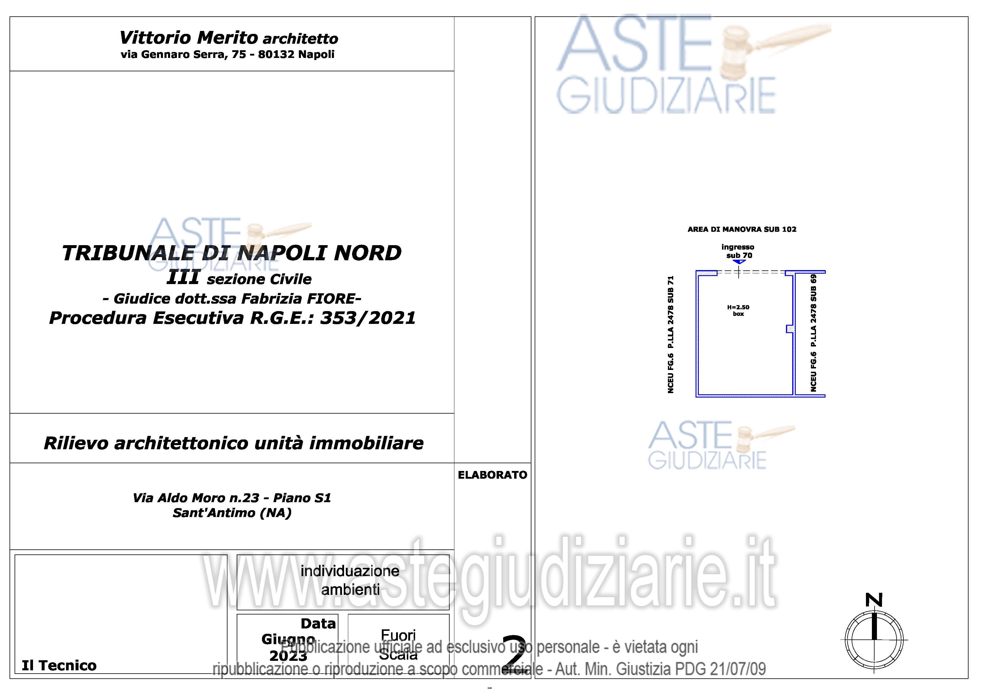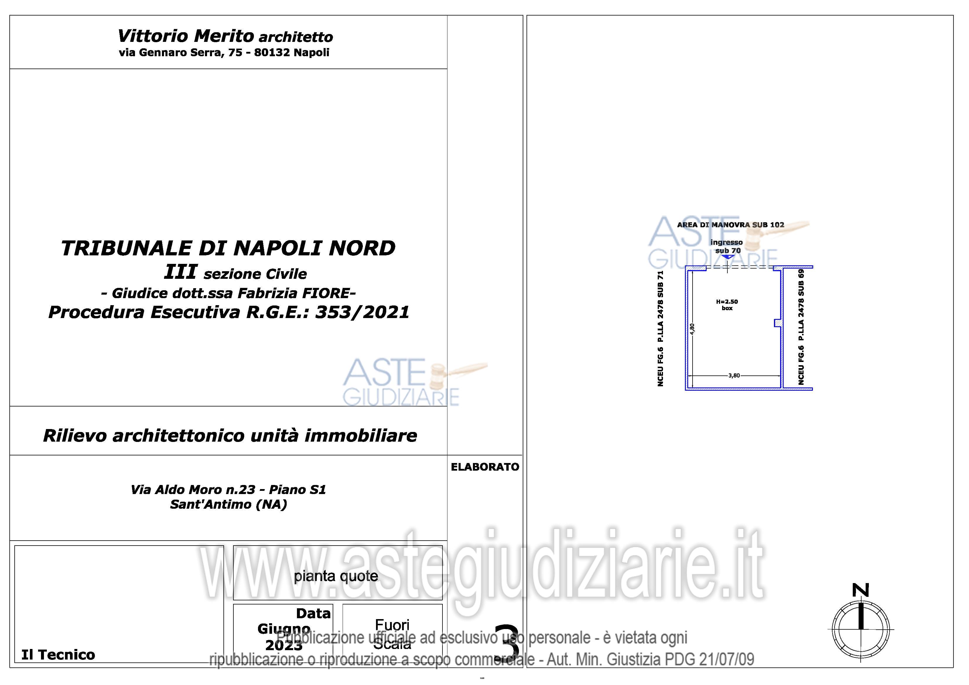 Vendita all'asta Senza incanto, con gara telematica asincrona - LOTTO 41: LOTTO QUARANTUNO - Garage sito nel Comune di Sant’Antimo (Na) via Aldo Moro 21, piano S1“Parco Omissis”, composto da un locale box; riportato nel NCEU del Comune di Sant’Antimo, foglio 6, particella 2478, sub. 70, cat. C/6, classe 3, consistenza 19 mq, sup. cat. 20 mq, rendita € 42,19 il descritto stato dei luoghi corrisponde alla consistenza catastale. Il bene de quo risulta libero e, per quanto dichiarato in sede di accesso, nella disponibilità dell’esecutato . Prezzo base € 9.400,00 (offerta minima € 7.050,00). Data inizio operazioni di vendita: 27/11/2025 ore 16:00. Custode Giudiziario Dott. Francesco Russo - Email "studiocasillorusso@libero.it"; Tel. 0815404454. Rif. Tribunale di Napoli Nord - Esecuzione immobiliare post legge 80 n. 353/2021