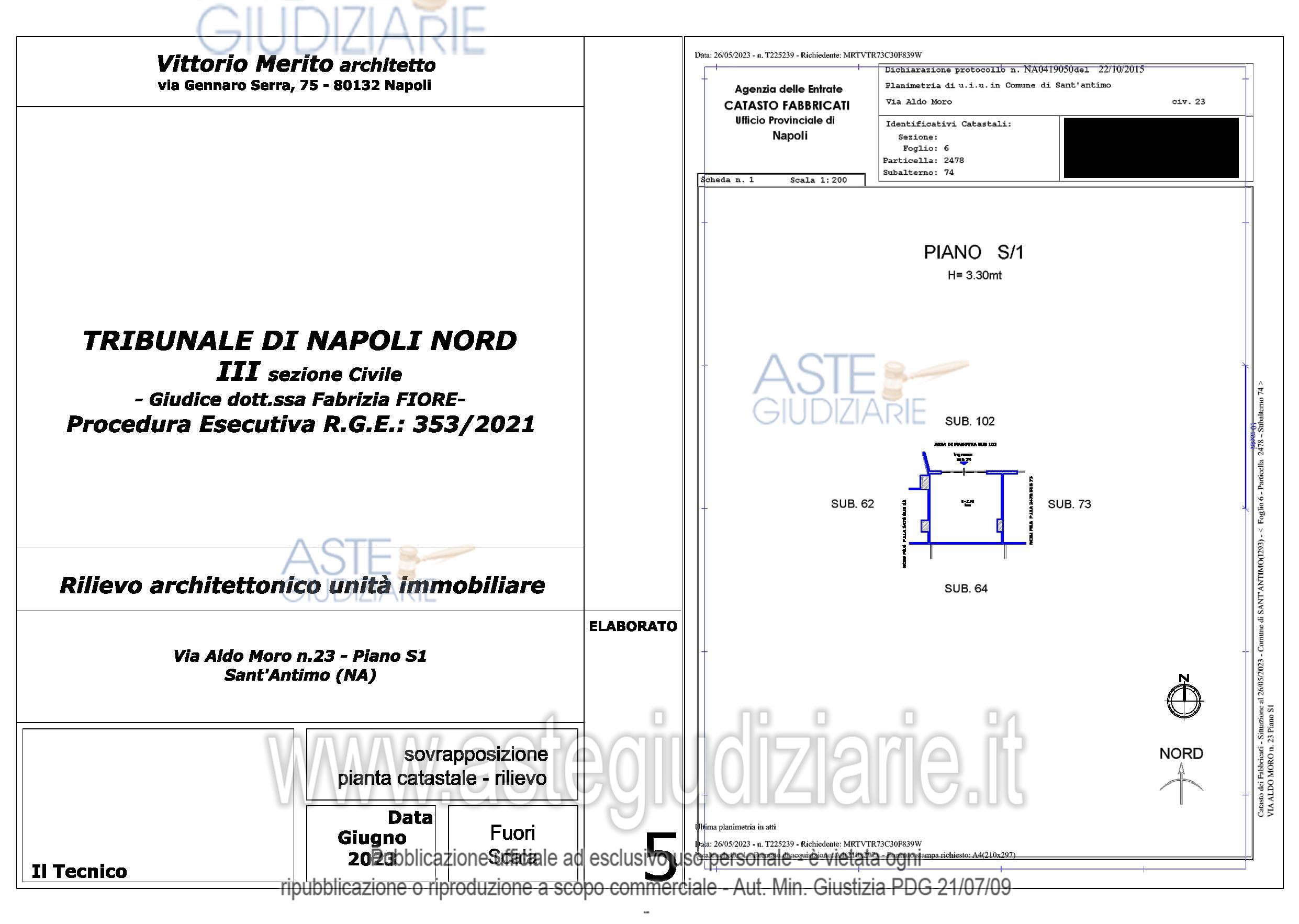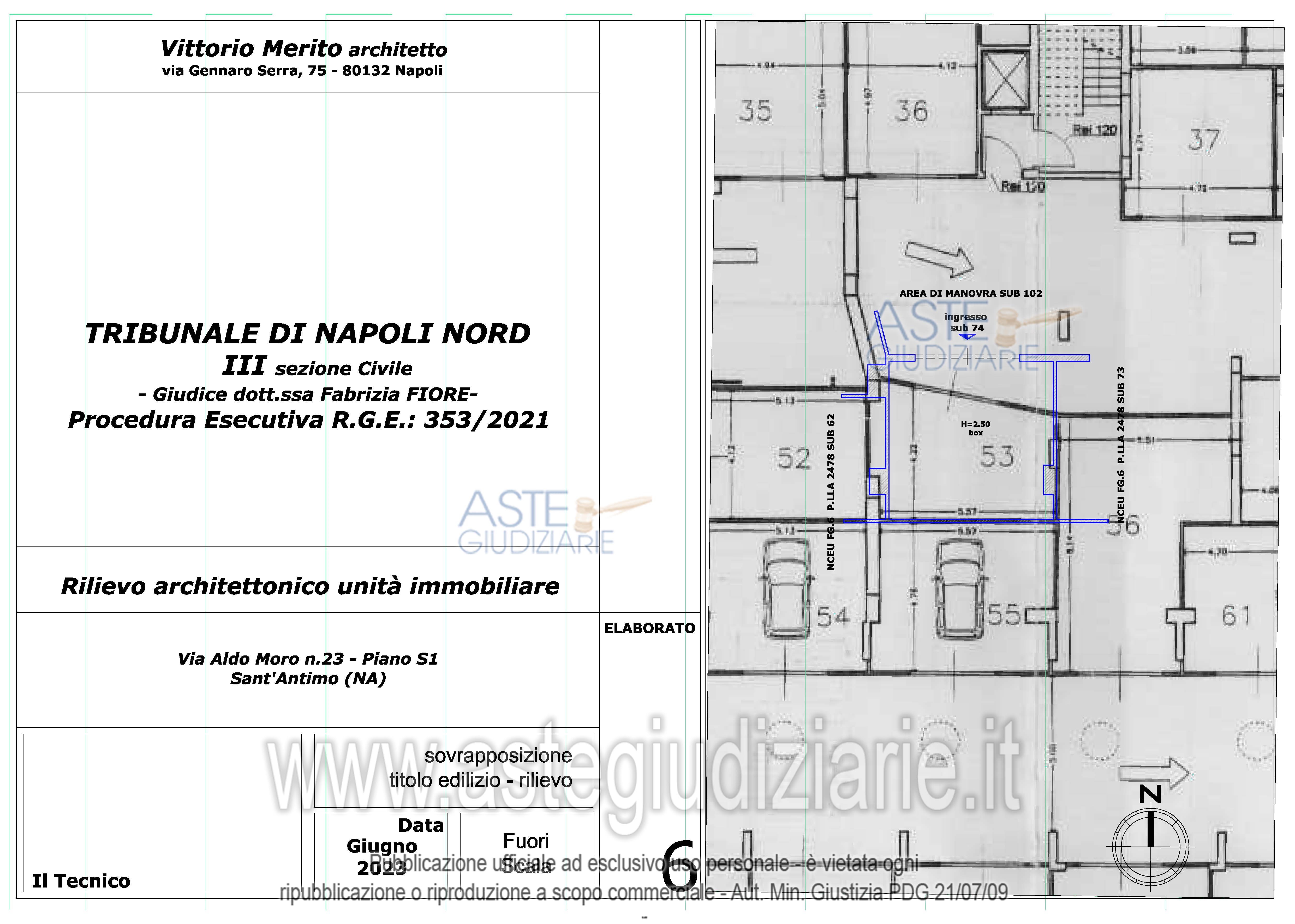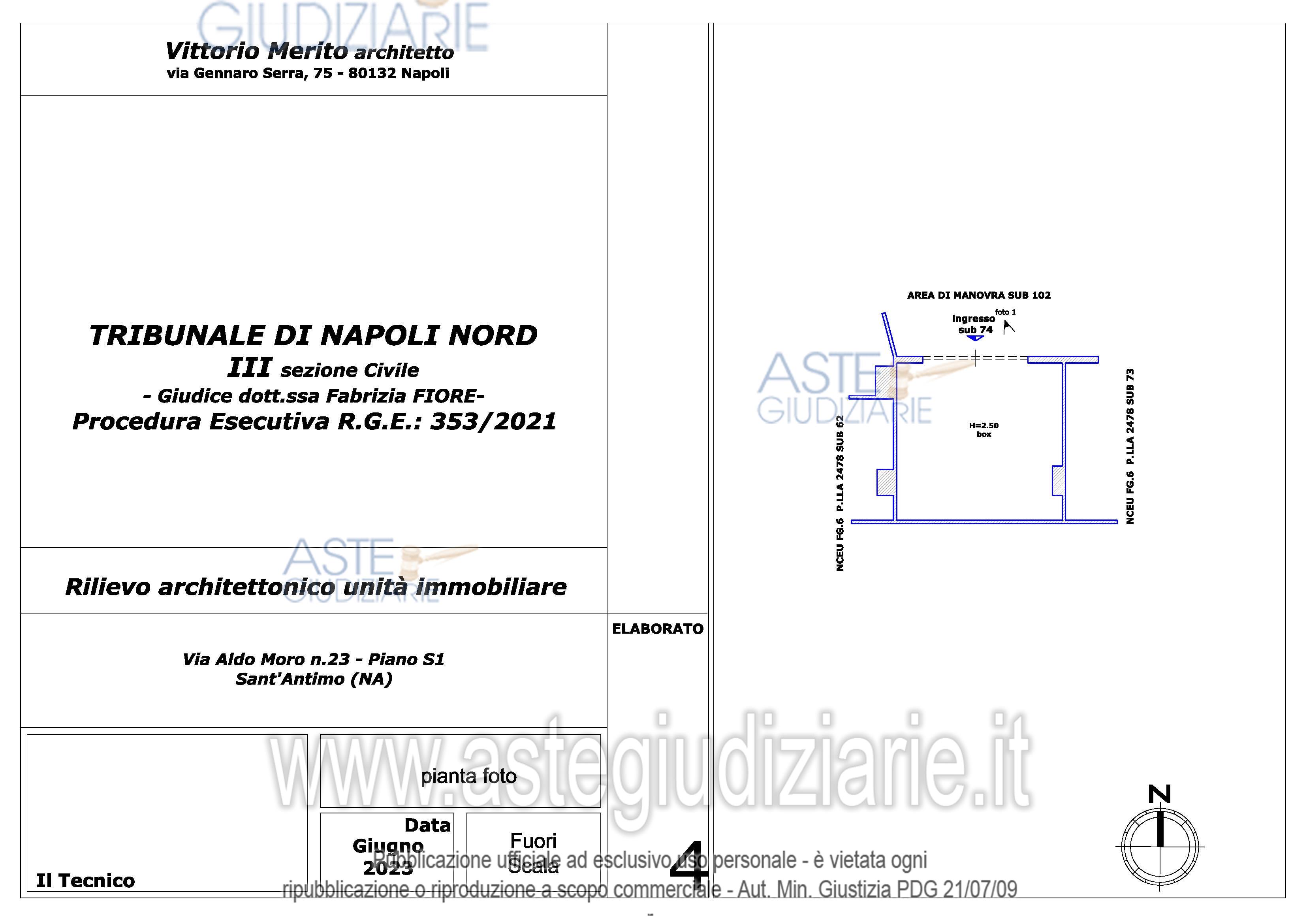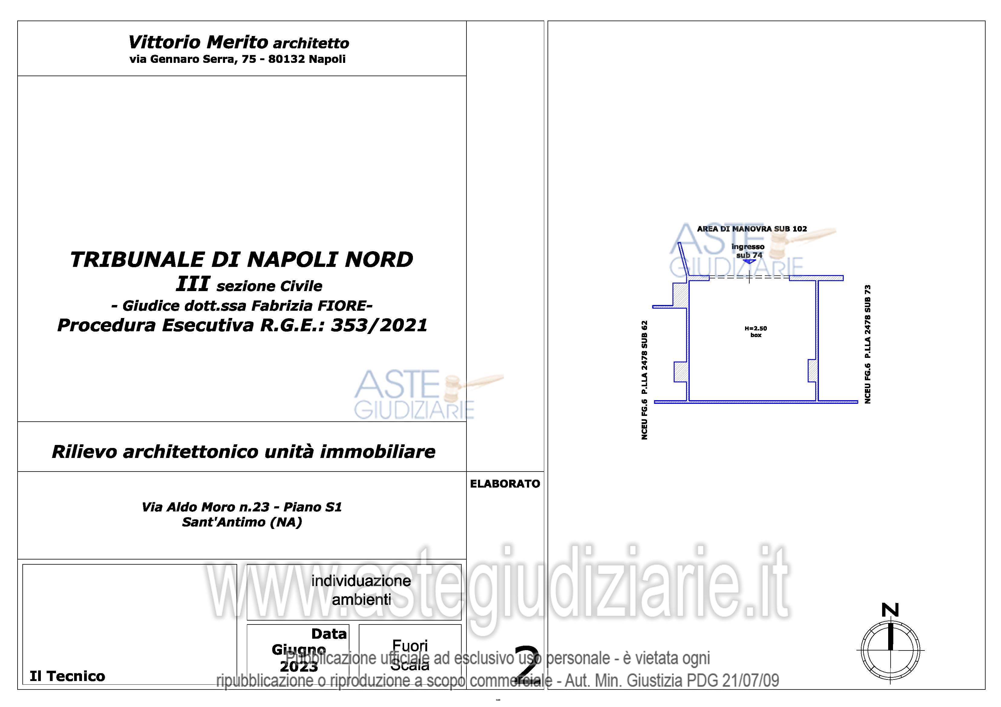 Vendita all'asta Senza incanto, con gara telematica asincrona - LOTTO 44: LOTTO QUARANTAQUATTRO - Garage sito nel Comune di Sant’Antimo (Na) via Aldo Moro 21, piano S1 “Parco Omissis”, composto da un locale box; riportato nel NCEU del Comune di Sant’Antimo, foglio 6, particella 2478, sub. 74, cat. C/6, classe 3, consistenza 24 mq, sup. cat. 26 mq, rendita € 53,30; il descritto stato dei luoghi corrisponde alla consistenza catastale. Il bene de quo risulta libero e, per quanto dichiarato in sede di accesso, nella disponibilità dell’esecutato. Prezzo base € 12.600,00 (offerta minima € 9.450,00). Data inizio operazioni di vendita: 27/11/2025 ore 16:00. Custode Giudiziario Dott. Francesco Russo - Email "studiocasillorusso@libero.it"; Tel. 0815404454. Rif. Tribunale di Napoli Nord - Esecuzione immobiliare post legge 80 n. 353/2021