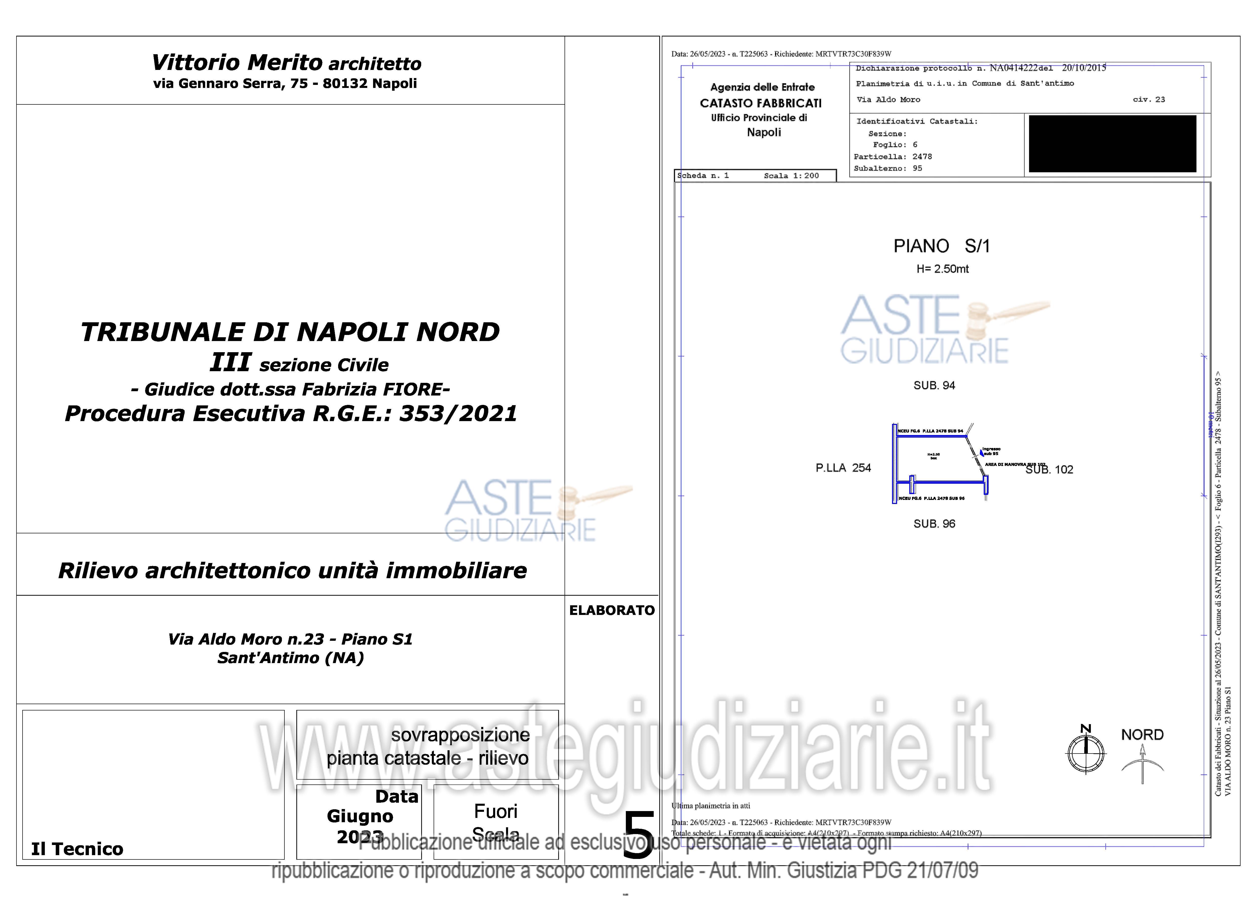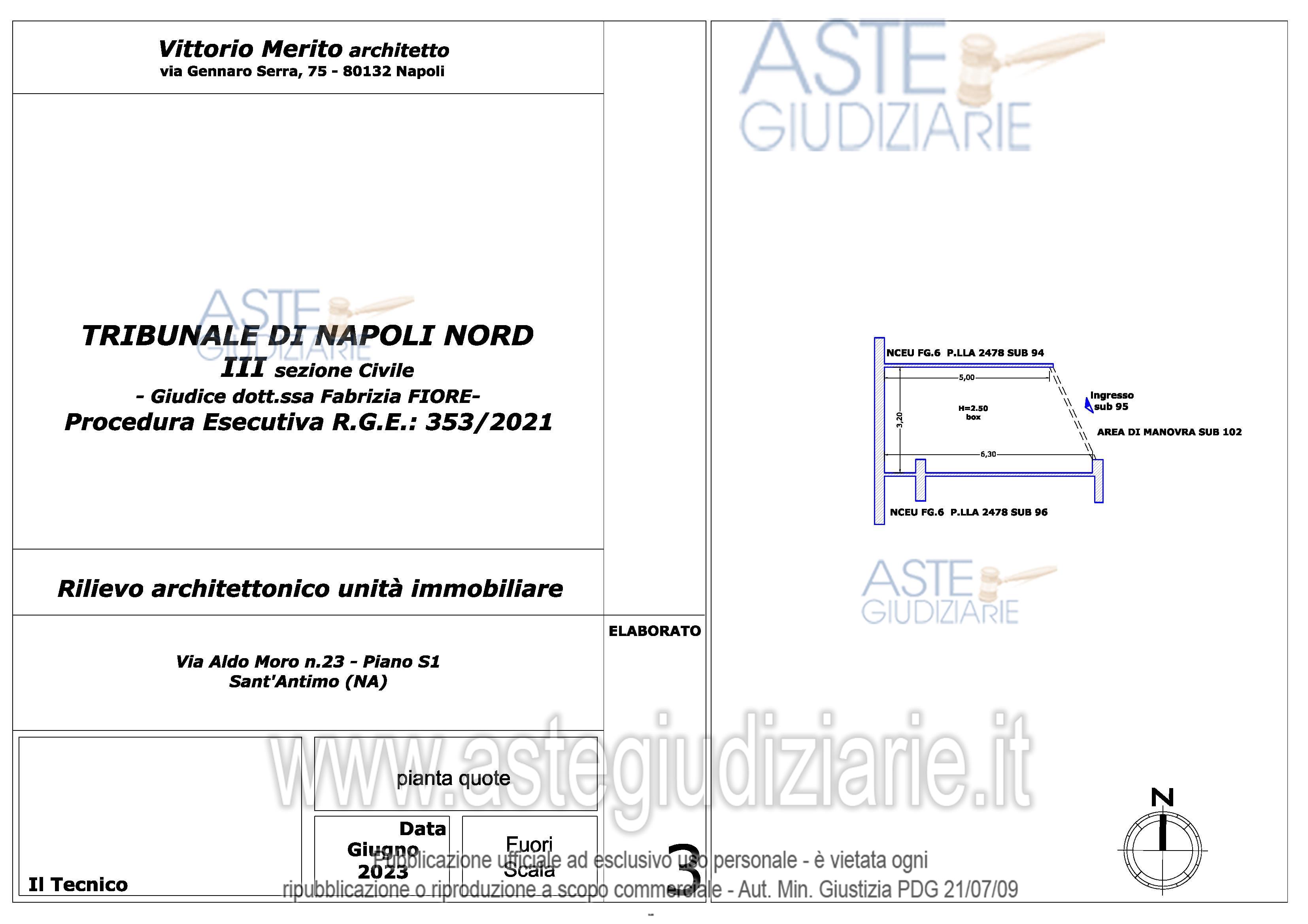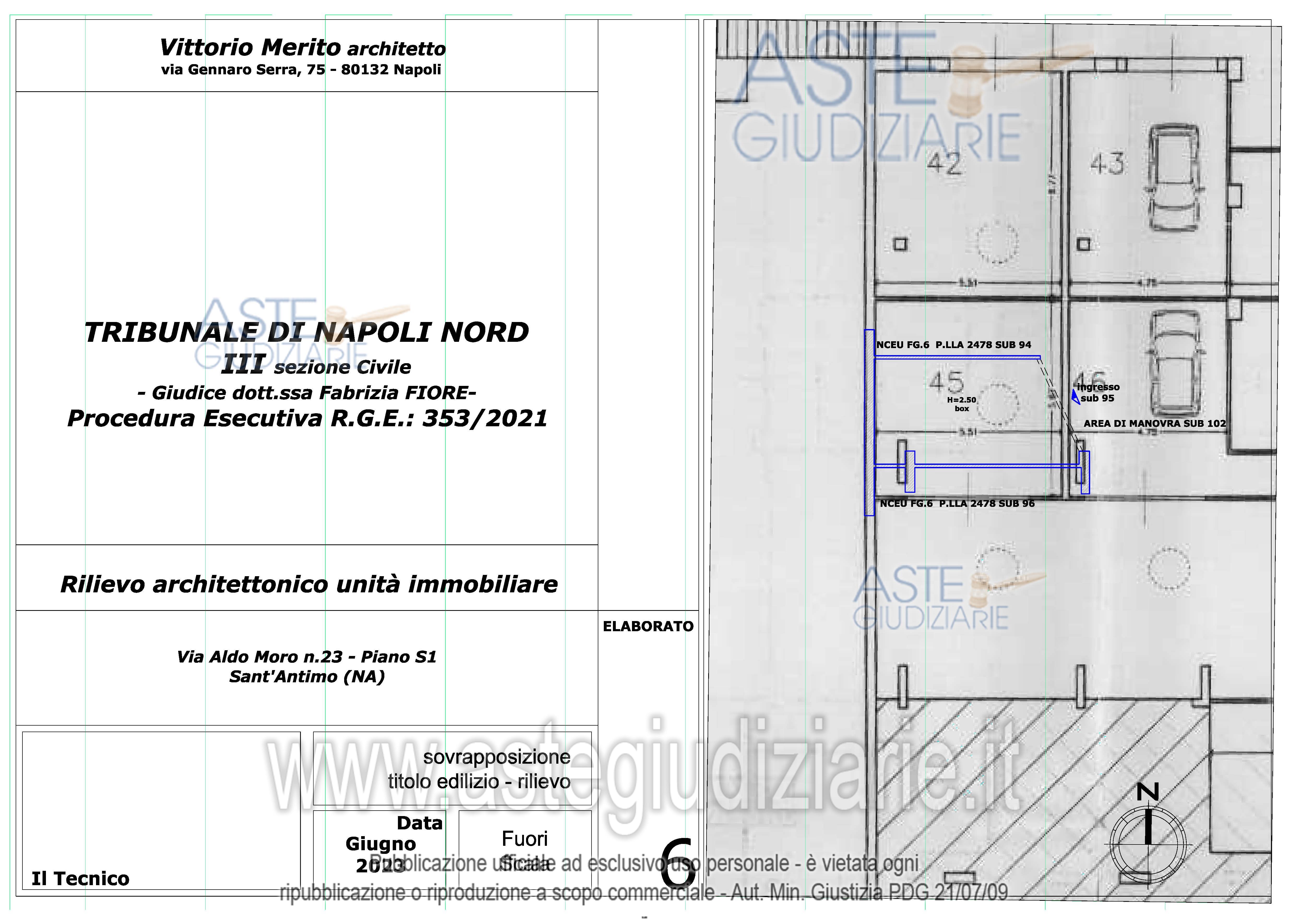 Vendita all'asta Senza incanto, con gara telematica asincrona - LOTTO 49: LOTTO QUARANTANOVE - Garage sito nel Comune di Sant’Antimo (Na) a via Aldo Moro 21, piano S1“Parco Omissis”, composto da un locale box; riportato nel NCEU del Comune di Sant’Antimo, foglio 6, particella 2478, sub. 95, cat. C/6, classe 3, consistenza 18 mq, sup. cat. 20 mq, rendita € 39,97 – via Aldo Moro n° 23 - piano S1; il descritto stato dei luoghi corrisponde alla consistenza catastale. Il bene de quo risulta libero nella disponibilità dell'esecutato. Prezzo base € 9.300,00 (offerta minima € 6.975,00). Data inizio operazioni di vendita: 27/11/2025 ore 16:00. Custode Giudiziario Dott. Francesco Russo - Email "studiocasillorusso@libero.it"; Tel. 0815404454. Rif. Tribunale di Napoli Nord - Esecuzione immobiliare post legge 80 n. 353/2021