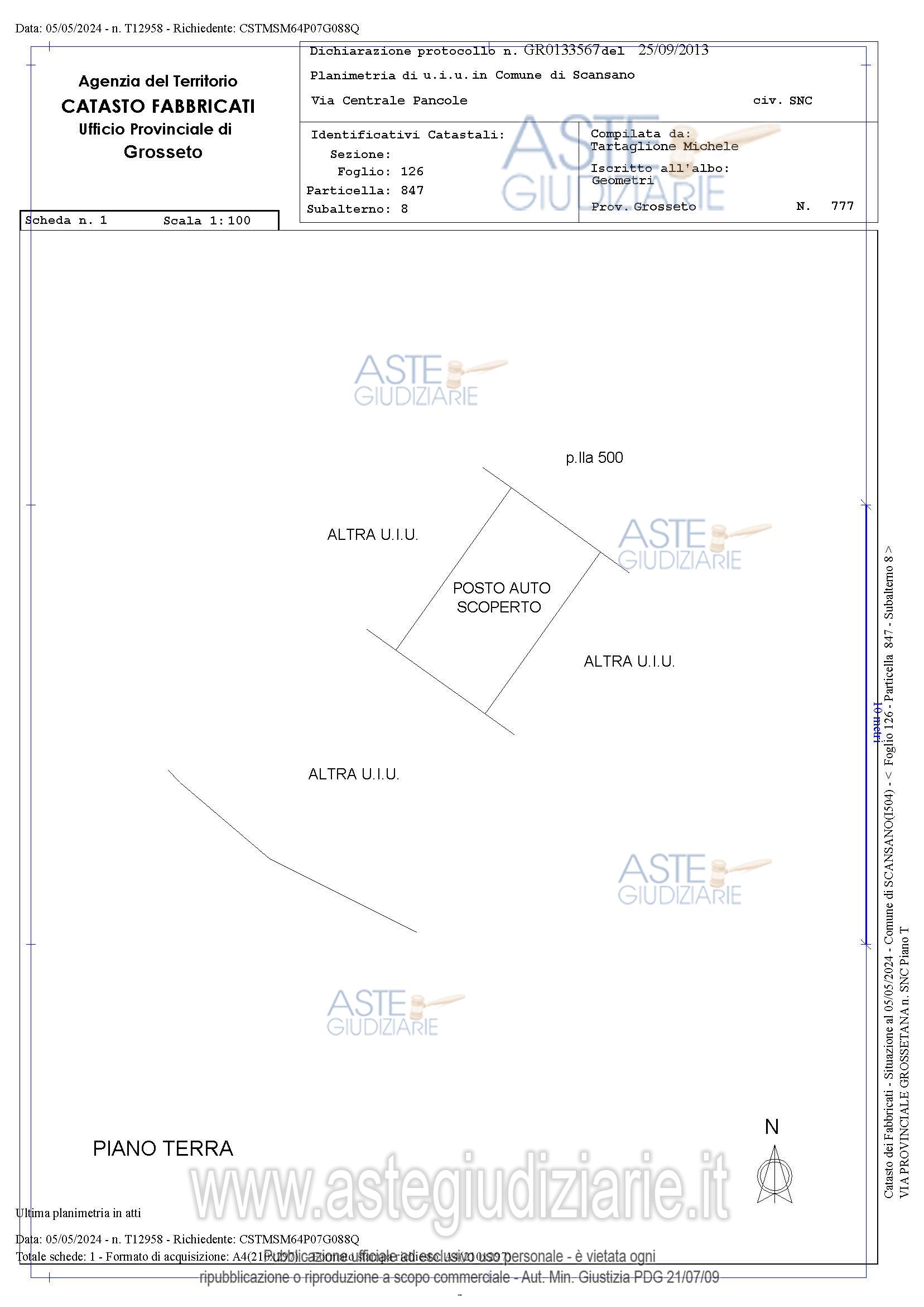 Vendita all'asta Senza incanto, con gara telematica asincrona - LOTTO 9: Posto auto scoperto. Detto immobile risulta attualmente censito nel Catasto Fabbricati del Comune di Scansano nel foglio 126, p.lla 847, sub. 8, Cat. C/6, Classe 2, consistenza 12 mq., superficie catastale 11 mq, rendita €. 15,49. Prezzo base € 3.300,00 (offerta minima € 2.400,00). Data inizio operazioni di vendita: 14/04/2026 ore 12:30. Professionista delegato alla vendita Dott. Irene Inganni - Email "ireneinganni@gmail.com"; Cell. 3296196791; Tel. 05642736. Custode Giudiziario Lucia Ghelli - Email "ivggrosseto@astagiudiziaria.com"; Cell. 3426598791; Tel. 050554790. Rif. Tribunale di Grosseto - Espropriazione immobiliare (cartabia) n. 154/2023
