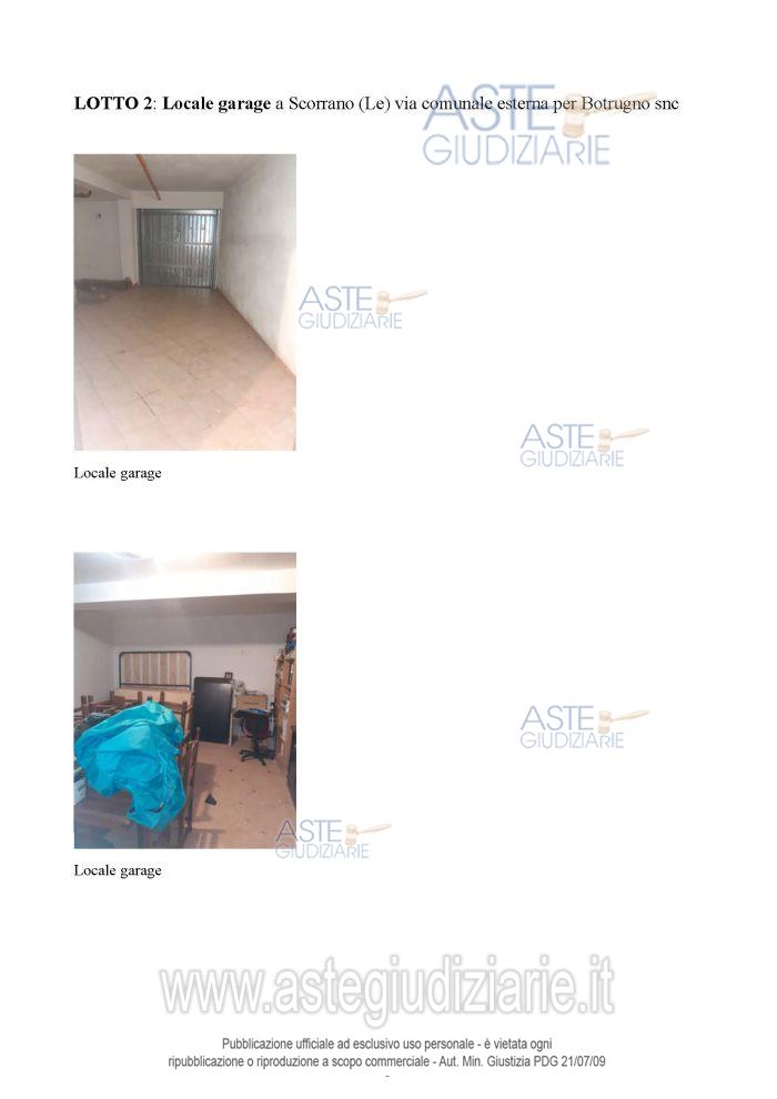 Vendita all'asta Competitiva, con gara telematica asincrona - LOTTO 2: Locale garage in SCORRANO (LE) via Comunale per Botrugno snc della superficie commerciale di 78,00mq piena proprietà della quota di 1/1. Il garage è costituito da n. 2 vani principali, con spazio di manovra condominiale antistante. È dotato di tutti i servizi primari. Identificazione catastale: NCEU del comune di Scorrano – Catasto Fabbricati – al Foglio 9 particella 787 sub 22, categoria C/6, classe 3, mq 63,00, sup. catastale mq. 78,00, posto al piano S1 (seminterrato), occupato dalla proprietaria. Prezzo base € 19.252,50 (offerta minima € 14.440,00). Data inizio operazioni di vendita: 15/01/2026 ore 10:00. Professionista delegato alla vendita Dott. Lucia Paglione - Email "luciapaglione@libero.it"; Cell. 3471360243. Rif. Tribunale di Lecce - Liquidazione controllata(cci) n. 12/2023