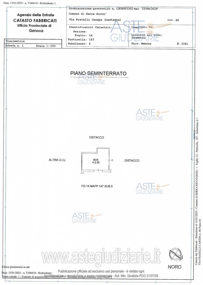 Vendita all'asta Senza incanto, con gara telematica sincrona mista - LOTTO 8: PIENA PROPRIETA' DI MAGAZZINO ACCATASTATO COME BOX AUTO (CAT. C/6) A SERRA RICCO' (GE) IN VIA FRATELLI CANEPA CIV. 48 A AL PIANO SEMINTERRATO. SUPERFICIE CATASTALE 24 MQ . Prezzo base € 14.861,00 (offerta minima € 11.145,75). Data vendita 10/12/2025 ore 12:00. Professionista delegato alla vendita Avv. Elio Sbisa - Email "elio.sbisa1@gmail.com"; Cell. 3395666960. Custode Giudiziario Ivg Sovemo Srl - Email "visitegenova@sovemo.com"; Tel. 0105299253. Rif. Tribunale di Genova - Esecuzione immobiliare post legge 80 n. 520/2024