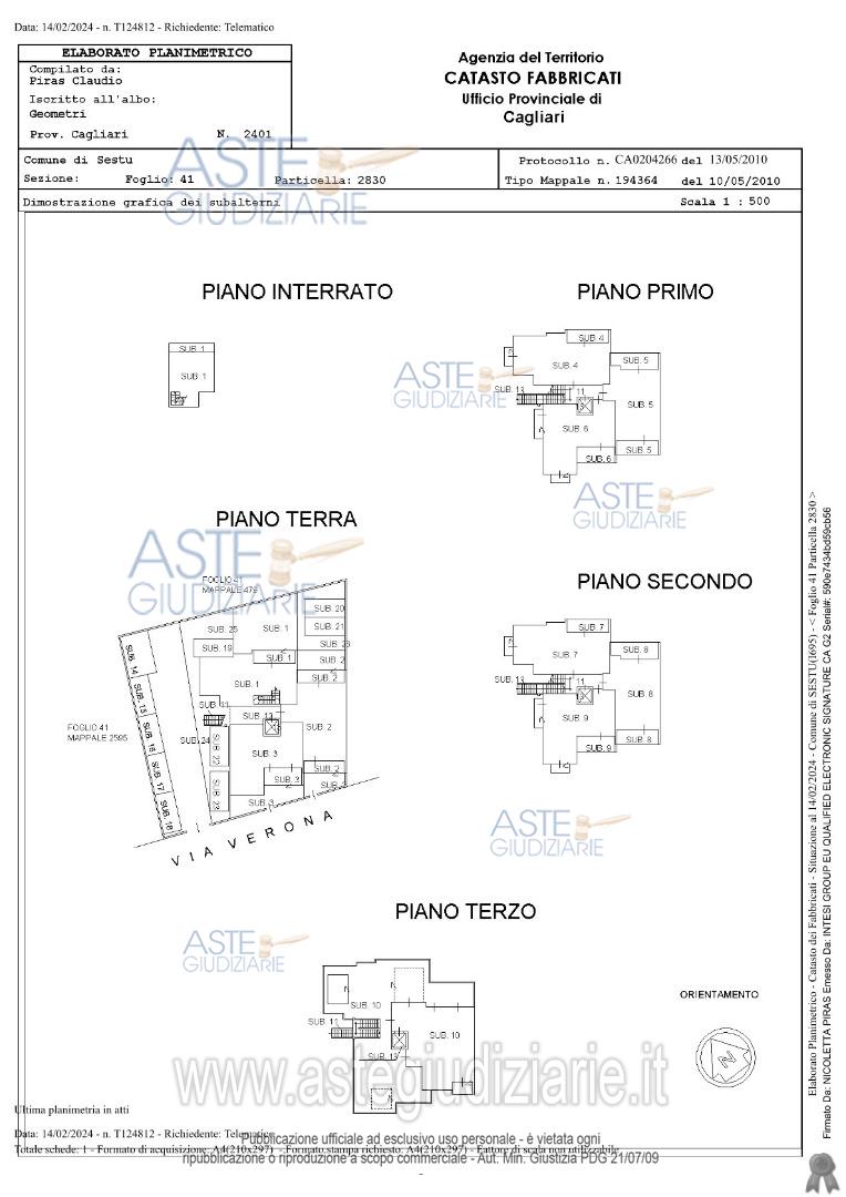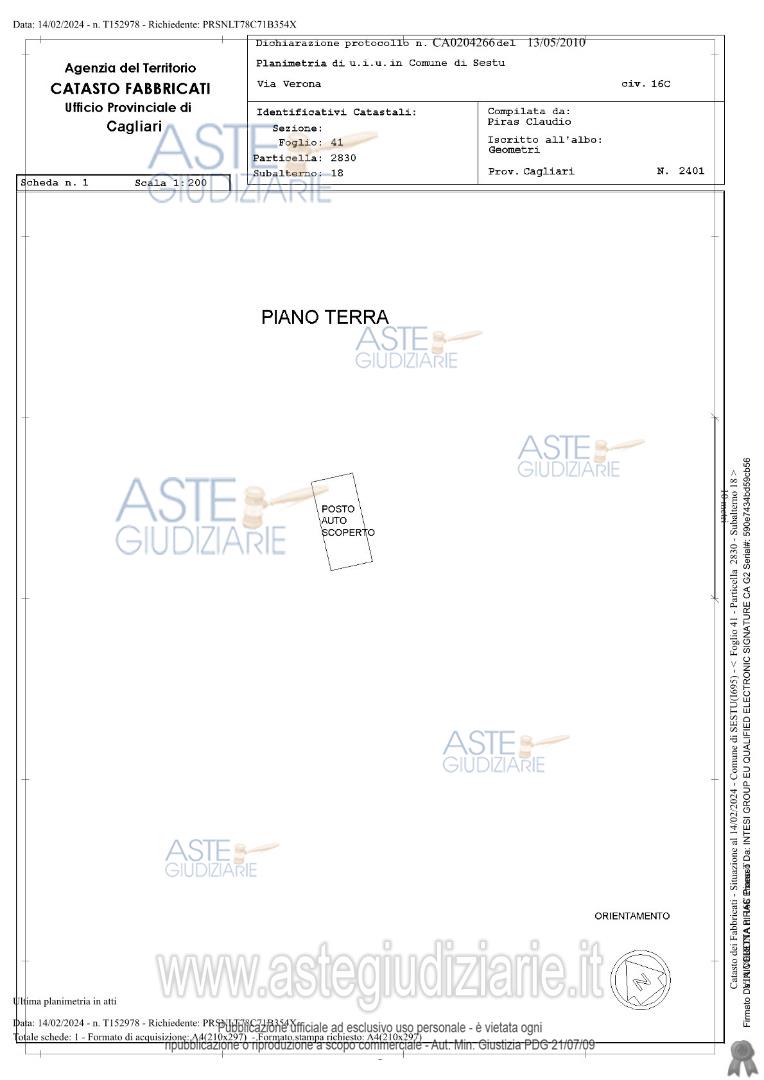 Vendita all'asta Senza incanto, con gara telematica asincrona - LOTTO 3: Sestu, quota pari a 1/1 del diritto di proprietà di unità immobiliare sita in Via Verona n° 16/c, facente parte di maggior fabbricato sviluppato su quattro piani fuori terra, costituita da posto auto scoperto, superficie catastale 12 mq. (categoria C/6). Prezzo base € 1.763,00 (offerta minima € 1.323,00). Data inizio operazioni di vendita: 23/10/2025 ore 11:00. Giudice Silvia Cocco. Professionista delegato alla vendita Dott. Edoardo Sanna - Email "studioedoardosanna@gmail.com"; Tel. 070490790. Custode Giudiziario Ivg Di Cagliari - Email "ivg.visiteimmobili@tiscali.it"; Tel. 0702299036. Rif. Tribunale di Cagliari - Esecuzione immobiliare post legge 80 n. 706/2011