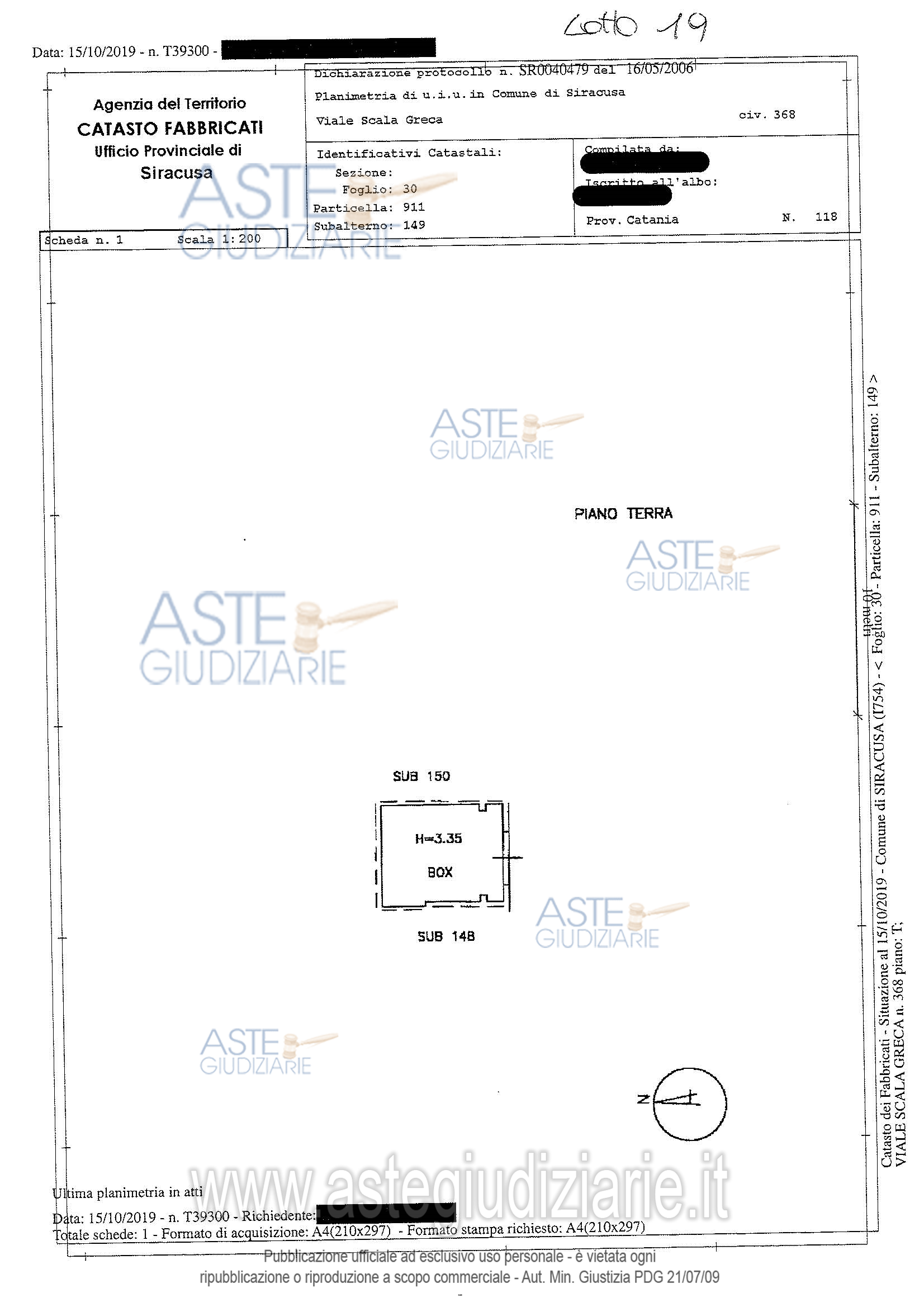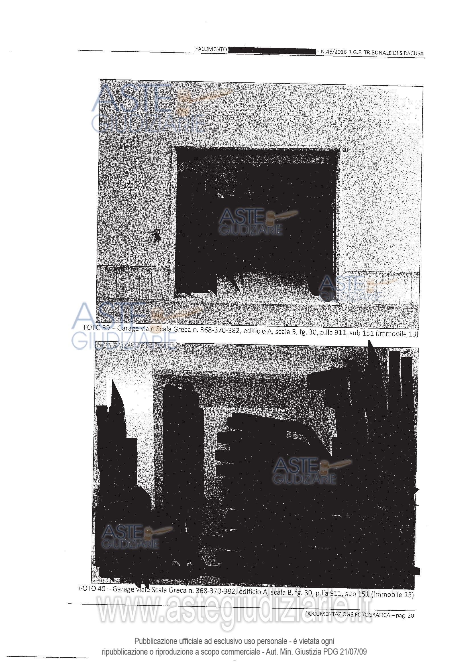Vendita all'asta Competitiva, con gara telematica sincrona mista - LOTTO 19: Piena proprietà del Garage sito in Siracusa, viale Scala Greca nn.368,370, 382, int. 12, piano terra, distinto al catasto fabbricati del Comune di Siracusa al fg. 30, p.lla 911 sub 149 (categoria C/6, classe 4, consistenza 29 mq). Prezzo base € 13.415,63 (offerta minima € 13.415,63). Data vendita 14/05/2026 ore 10:00. Giudice Nicoletta Rusconi. Curatore Avv. Simona Matarazzo - Email "avv.simona.matarazzo@gmail.com"; Tel. 0931096234. Rif. Tribunale di Siracusa - Fallimentare (nuovo rito) n. 46/2016