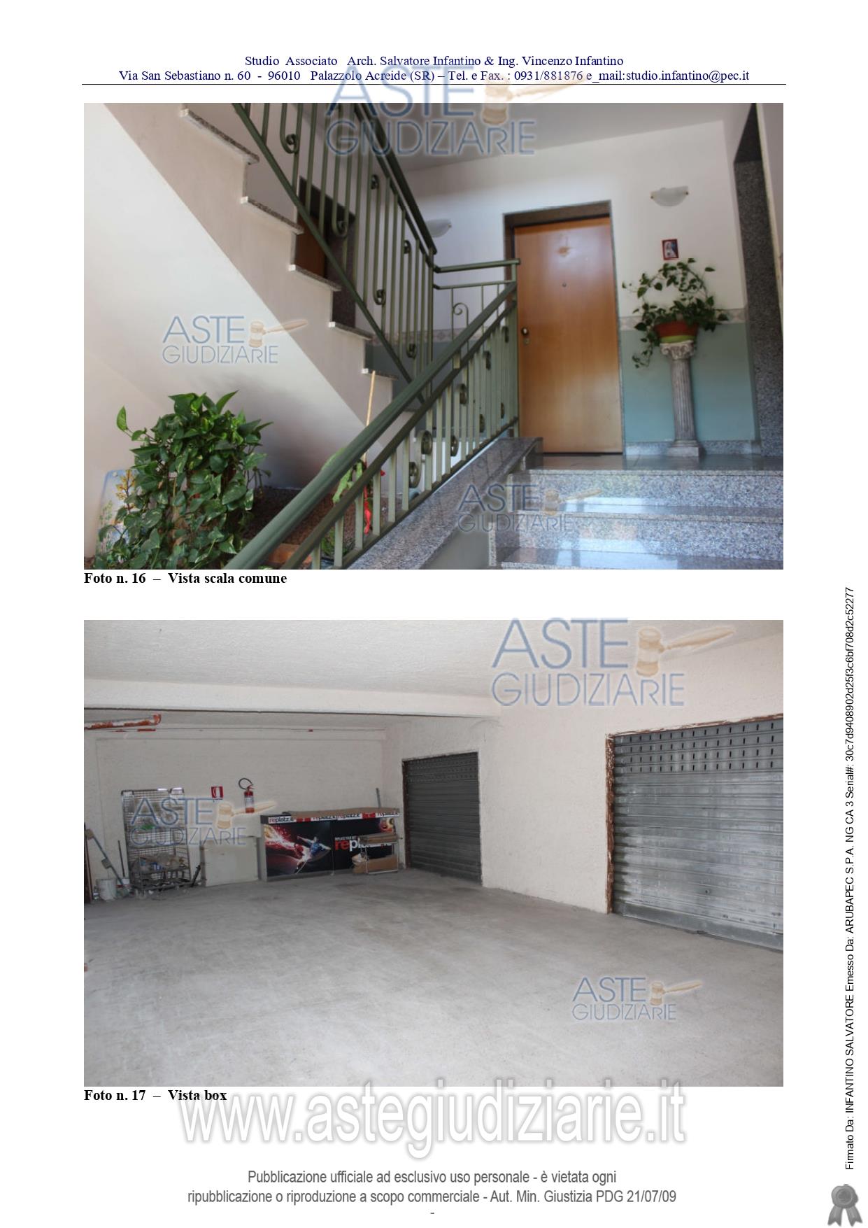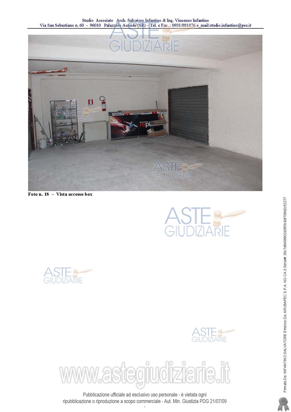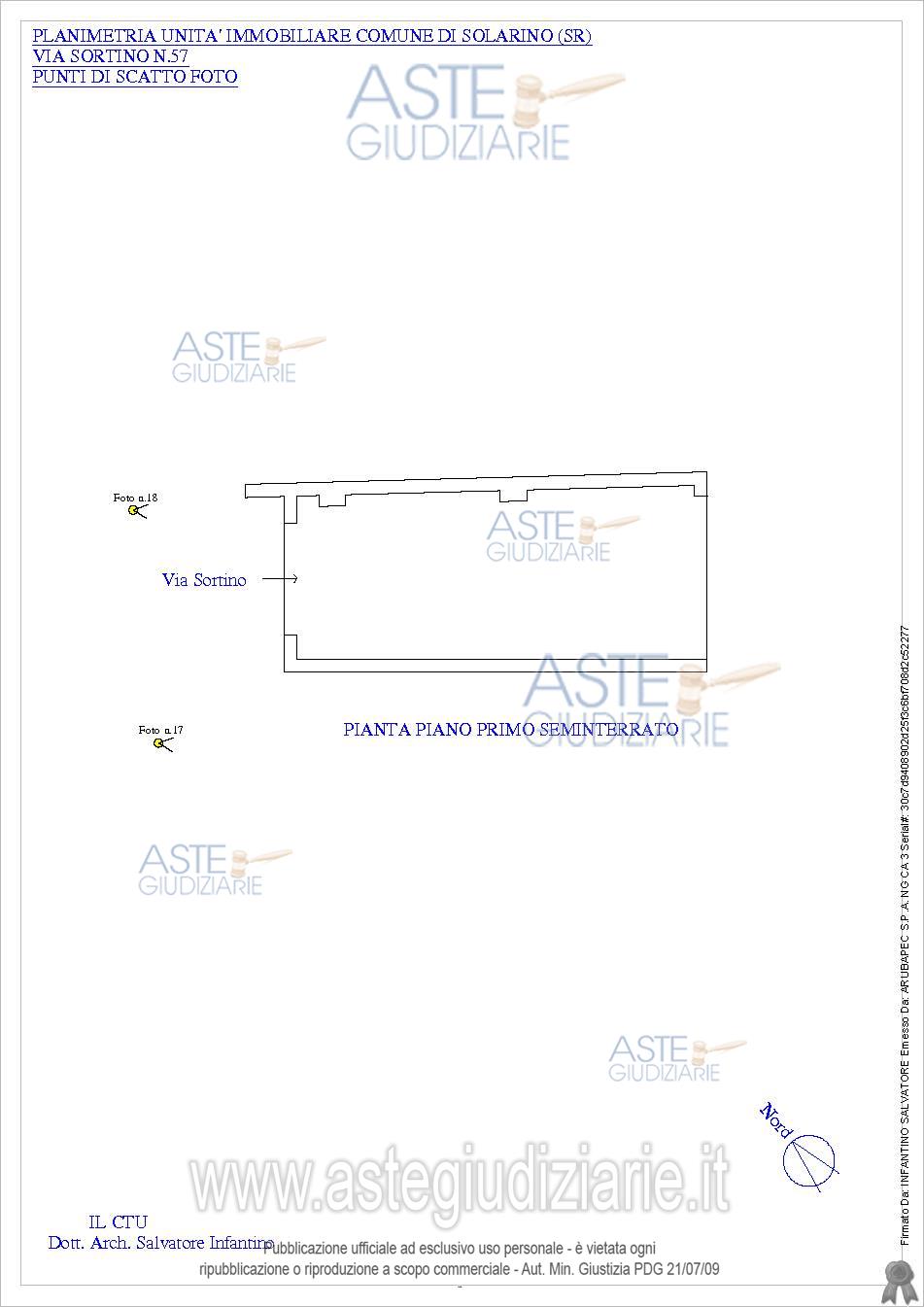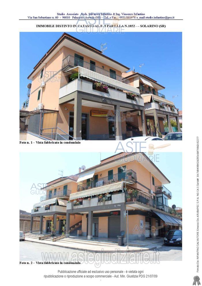 Vendita in attesa dell'emissione del nuovo bando d'asta. LOTTO UNICO: Piena proprietà garage sito in Solarino posto al primo piano seminterrato di un piccolo condominio con ingresso da via Sortino n.57, identificato al Catasto fabbricati di Solarino al foglio 9 particella 1852 sub 33 categoria C/6 classe 3 consistenza 35 mq superficie catastale 43 mq rendita catastale euro 92,19. Ultimo prezzo base € 4.154,00 (offerta minima € 3.116,00). Professionista delegato alla vendita Avv. Marco Rodante - Email "rodantemarco2@gmail.com"; Cell. 3385850497; Tel. 3385850497. Custode Giudiziario Avv. Marco Rodante - Email "rodantemarco2@gmail.com"; Cell. 3385850497; Tel. 3385850497. Rif. Tribunale di Siracusa - Esecuzione immobiliare post legge 80 n. 210/2021