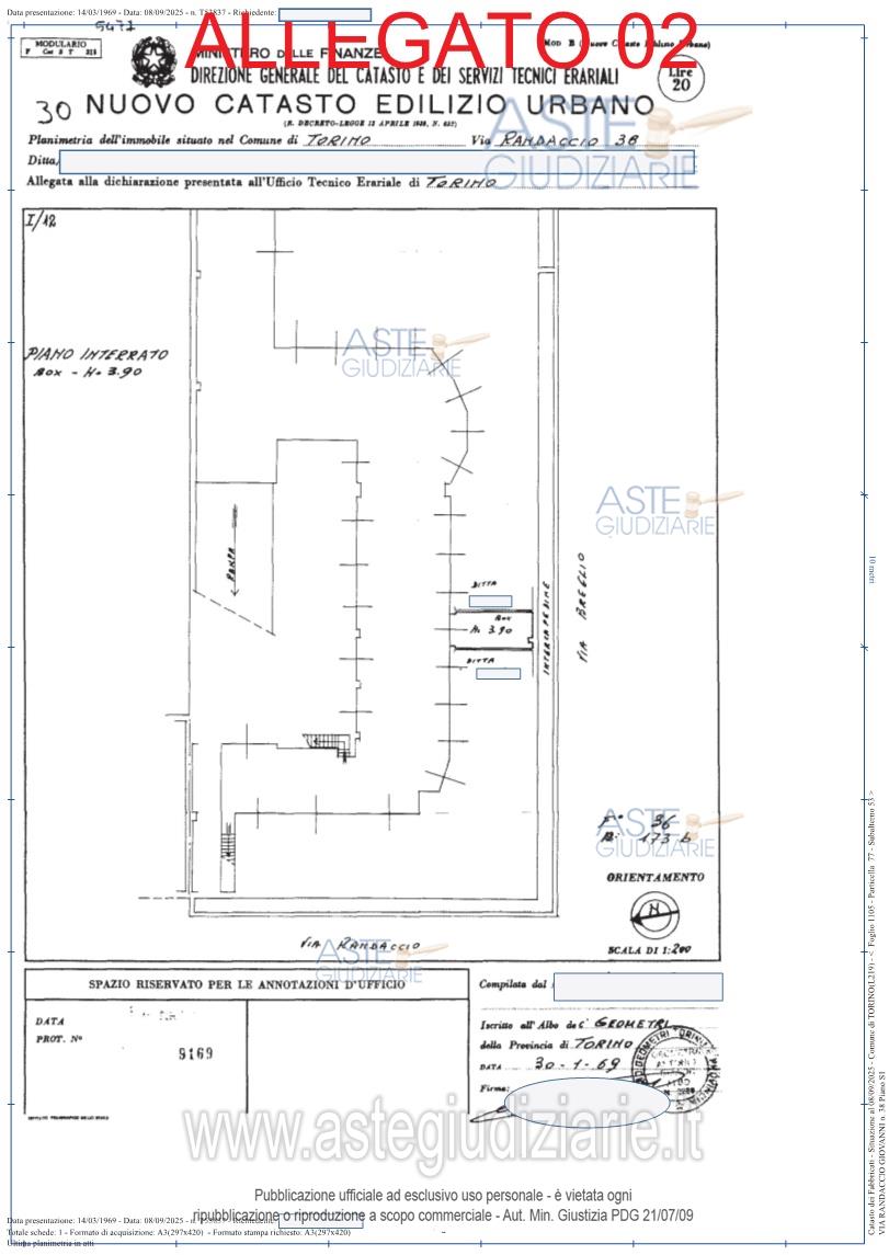 Vendita all'asta Senza incanto, con gara telematica asincrona - LOTTO UNICO: In Torino, via Randaccio n. 38, locale ad uso autorimessa privata (box auto), posto al piano interrato del complesso condominiale comprendente i fabbricati di Via Randaccio n. 38 – Via Breglio n. 16 – 18 e distinto con il numero 12 nella planimetria del relativo piano, allegata al Regolamento di condominio, alle coerenze: autorimessa n. 11, intercapedine su via Breglio, autorimessa n. 13 e area di manovra condominiale. Prezzo base € 9.000,00 (offerta minima € 6.750,00). Data inizio operazioni di vendita: 21/04/2026 ore 09:00. Giudice Rossella D'addato. Professionista delegato alla vendita Avv. Laura Borgo Avvocato - Email "borgo.laura@libero.it"; Cell. 0117650645; Tel. 0117650645. Custode Giudiziario Istituto Vendite Giudiziarie Ivg Vigone - Email "richieste.visite@ivgpiemonte.it"; Cell. 011482822; Tel. 011482822. Rif. Tribunale di Torino - Espropriazione immobiliare (cartabia) n. 227/2025
