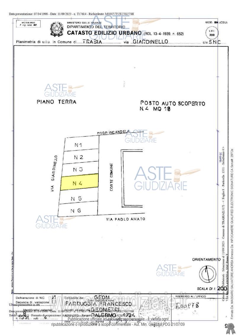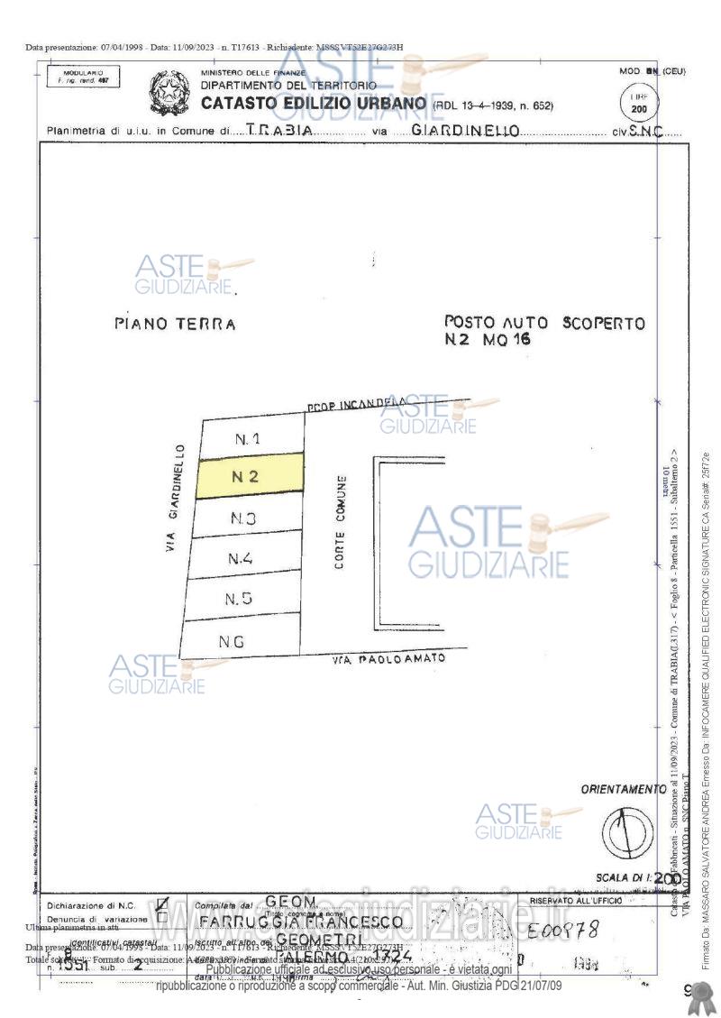Vendita all'asta Senza incanto, con gara telematica sincrona - LOTTO 07: LOTTO 7Bene N° 9 - Posto auto ubicato a Trabia (PA) - Via Giardinello, snc (Fg. 8 part 1551 sub 2), piano Terra Posto auto scoperto e privo di confini materializzati, posto lungo la via Giardinello, snc (angolo Via Paolo Amato) identificato in catasto fabbricati al Fg 8 particella 1551 sub 2, cat. C/6, consistenza mq. 16 Identificato al catasto Fabbricati - Fg. 8, Part. 1551, Sub. 2, Categoria C6. Prezzo base € 3.547,68 (offerta minima € 2.660,76). Data vendita 14/04/2026 ore 10:00. Professionista delegato alla vendita Avv. Maria Teresa D'asaro - Email "mtdasaro@gmail.com"; Cell. 3274544640. Custode Giudiziario Avv. Maria Teresa D'asaro - Email "mtdasaro@gmail.com"; Cell. 3274544640. Rif. Tribunale di Termini Imerese - Esecuzione immobiliare post legge 80 n. 47/2023