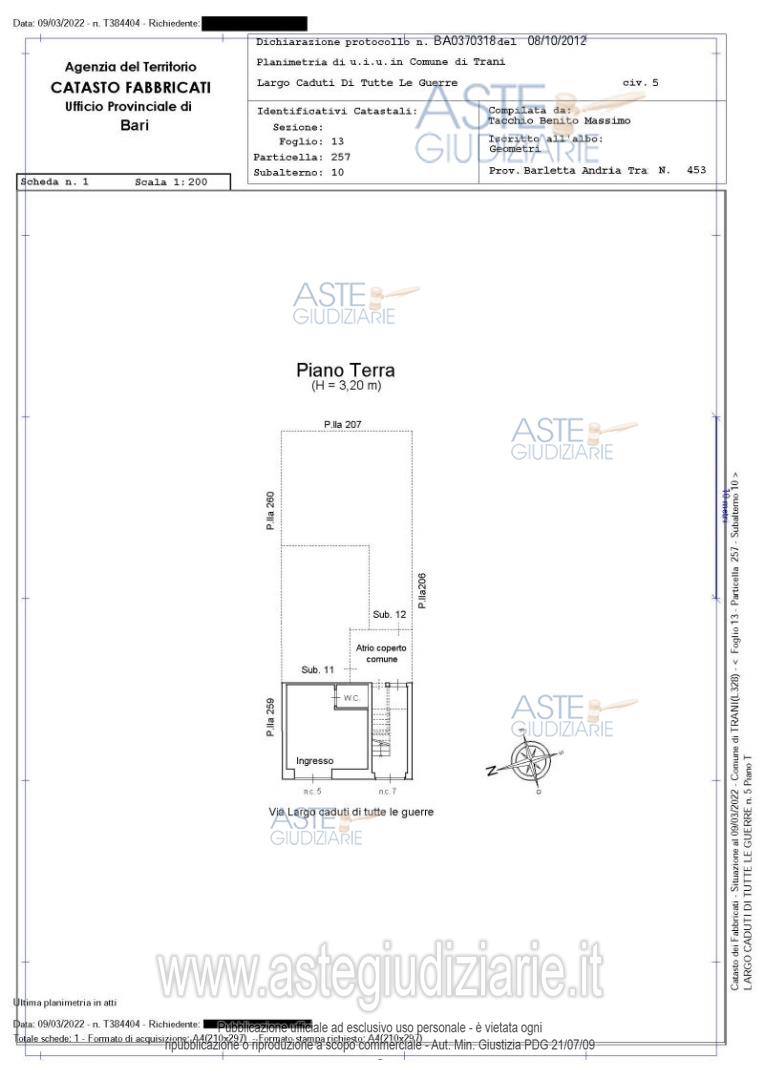 Vendita all'asta Senza incanto, con gara telematica sincrona - LOTTO UNICO: Piena proprietà per la quota di 1/1 di ampio box auto sito in Trani alla via Giacinto Francia n. 5 della superficie commerciale di mq 134,00.L’ampio box auto ha accesso dalla discesa di via Giacinto Francia n.5.Il box è completamente chiuso da una serranda in alluminio ed ha un’altezza interna di 3,11 mt.Al suo interno sono stati ricavati due bagni.L’immobile in cui è ubicato il box auto è collocato in posizione semicentrale del Comune di Trani. Prezzo base € 74.100,00 (offerta minima € 55.575,00). Data vendita 09/04/2026 ore 09:00. Giudice Margherita Valeriani. Professionista delegato alla vendita Avv. Avv. Nicoletta Stellatelli - Email "nicolettastellatelli@libero.it"; Cell. 3470780413. Custode Giudiziario Avv. Avv. Nicoletta Stellatelli - Email "nicolettastellatelli@libero.it"; Cell. 3470780413. Rif. Tribunale di Trani - Esecuzione immobiliare post legge 80 n. 218/2020