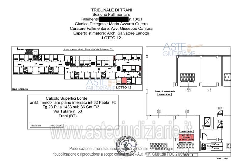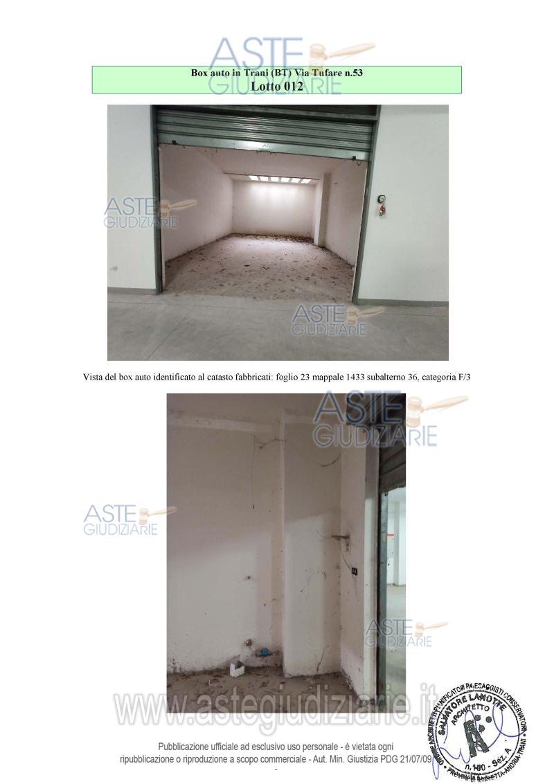 Vendita all'asta Senza incanto, con gara telematica sincrona - LOTTO 12: Piena proprietà, per la quota di 1000/1000, di box sito in Trani (BT) alla via delle Tufare n.53, posto al piano PS1 sviluppa una superficie lorda complessiva di circa mq 30,90, identificato al catasto fabbricati al foglio 23, mappale 1433, subalterno 36, categoria F/3. Prezzo base € 13.853,81 (offerta minima € 10.390,36). Data vendita 07/11/2025 ore 10:30. Giudice Maria Azzurra Guerra. Curatore Avv. Giuseppe Canfora - Email "studiolegalebarcan@gmail.com"; Tel. 0883331596. Rif. Tribunale di Trani - Fallimentare (nuovo rito) n. 18/2021
