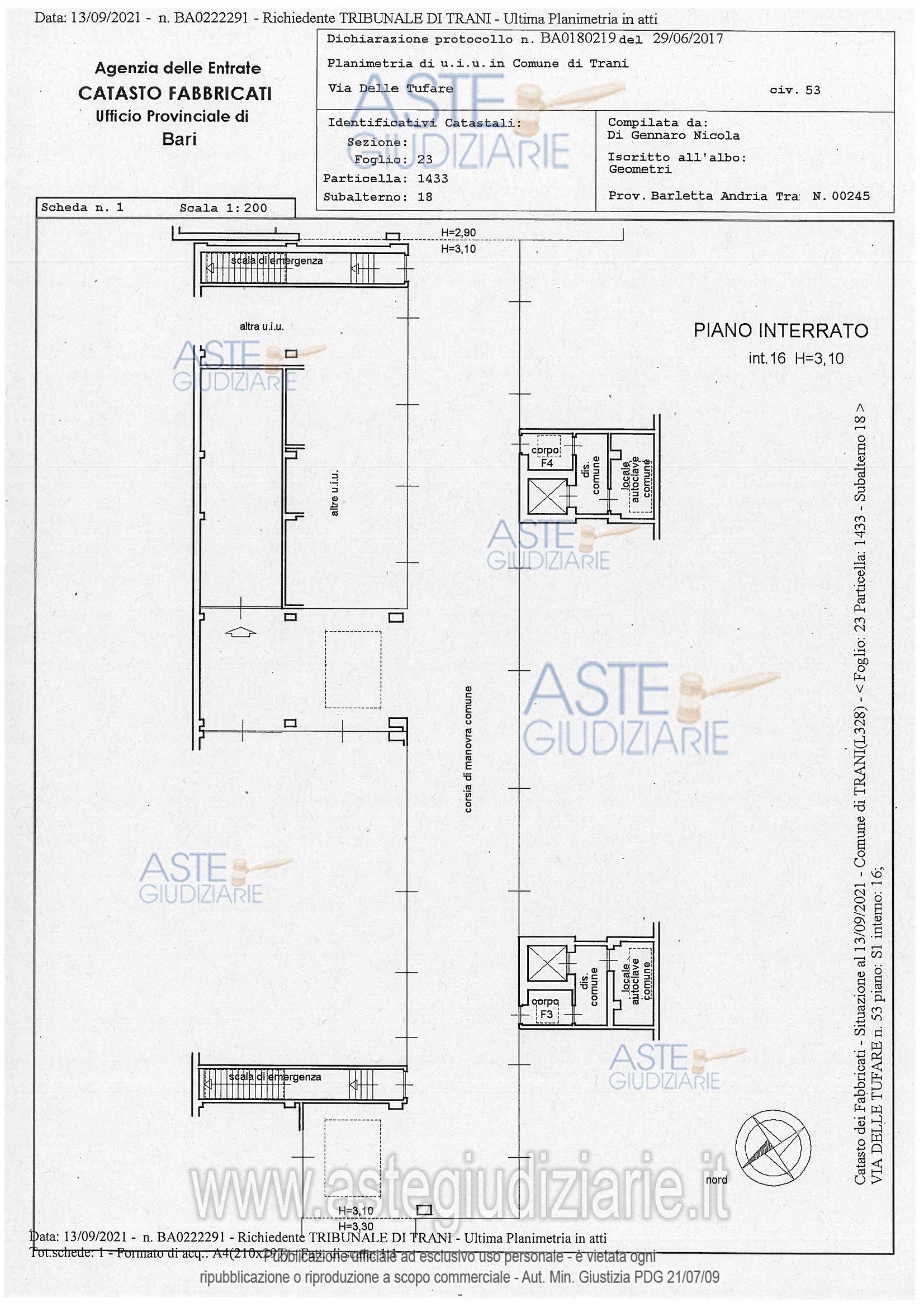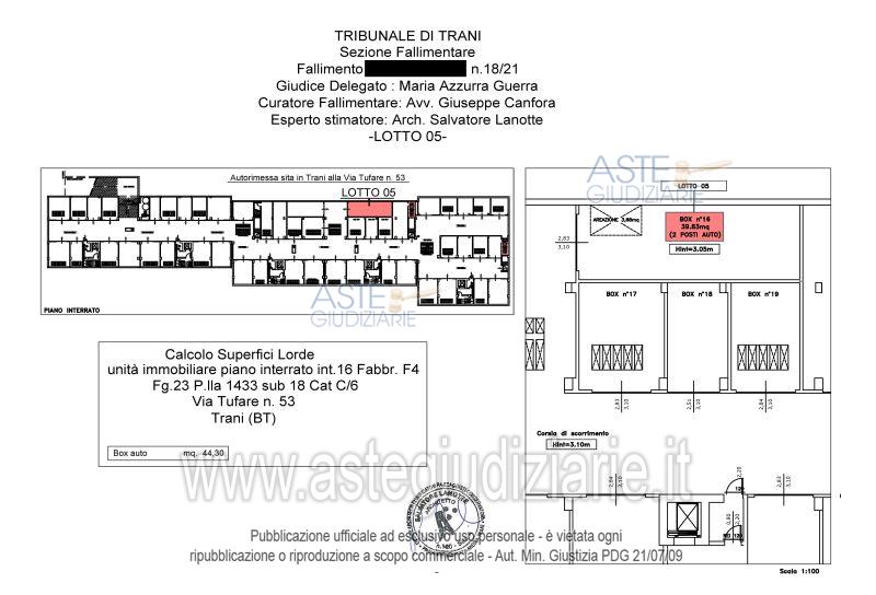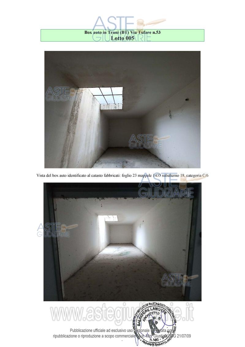 Vendita all'asta Senza incanto, con gara telematica sincrona - LOTTO 5: Piena proprietà, per la quota di 1000/1000, di box sito in Trani (BT) alla via delle Tufare n.53, posto al piano PS1 sviluppa una superficie lorda complessiva di circa mq 44,3, identificato al catasto fabbricati al foglio 23, mappale 1433, subalterno 18, categoria C/6, classe 2, consistenza 40 mq, superficie catastale 45 mq, posto al piano S1, rendita € 61,97. Prezzo base € 20.184,19 (offerta minima € 15.138,14). Data vendita 07/11/2025 ore 10:30. Giudice Maria Azzurra Guerra. Curatore Avv. Giuseppe Canfora - Email "studiolegalebarcan@gmail.com"; Tel. 0883331596. Rif. Tribunale di Trani - Fallimentare (nuovo rito) n. 18/2021