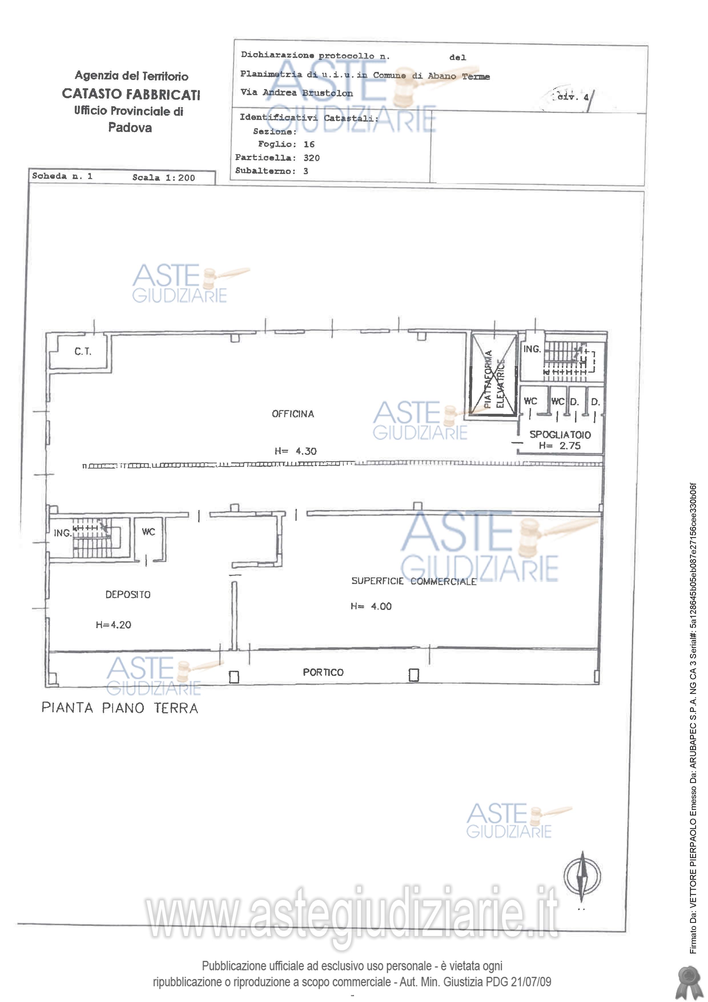 Vendita all'asta Senza incanto, con gara telematica sincrona - LOTTO 1: Lotto 1 - piena proprietà di porzione immobiliare sita in Comune di Abano Terme (PD), Via Brustolon n. 4 facente parte del fabbricato a destinazione mista, artigianale-commerciale, al piano terra: officina dotata di zona spogliatoi, servizi e locale montacarichi; una zona commerciale per vendita auto, dotata di ampia vetrata con portico antistante; al piano primo: locale ad uso magazzino; oltre alla quota indivisa pari ad 1/2 di una porzione di area cortilizia pertinenziale di mq. 50. Libero. Prezzo base € 524.000,00 (offerta minima € 393.000,00). Data vendita 10/03/2026 ore 14:15. Giudice Rossi. Professionista delegato alla vendita Dott. Francesco Mario Roberto Savio - Email "visiteimmobili@fsst.it"; Tel. 0498762588. Custode Giudiziario Dott. Francesco Mario Roberto Savio - Email "visiteimmobili@fsst.it"; Tel. 0498762588. Rif. Tribunale di Padova - Esecuzione immobiliare post legge 80 n. 39/2023
