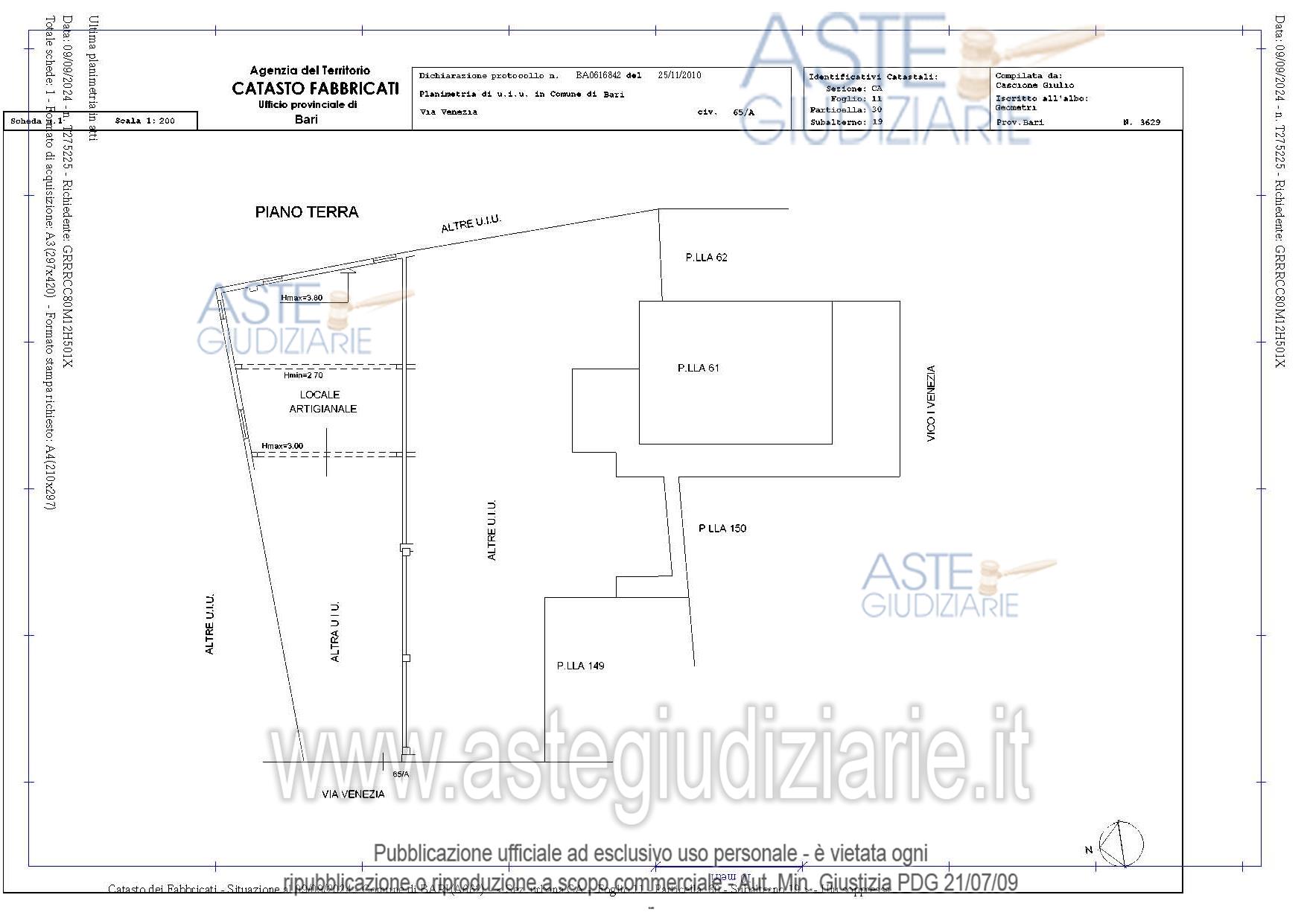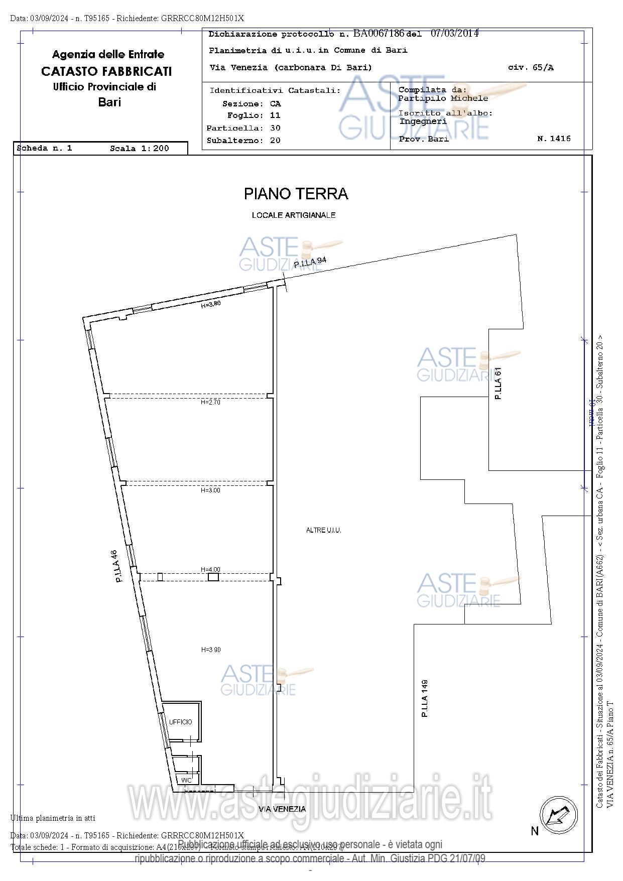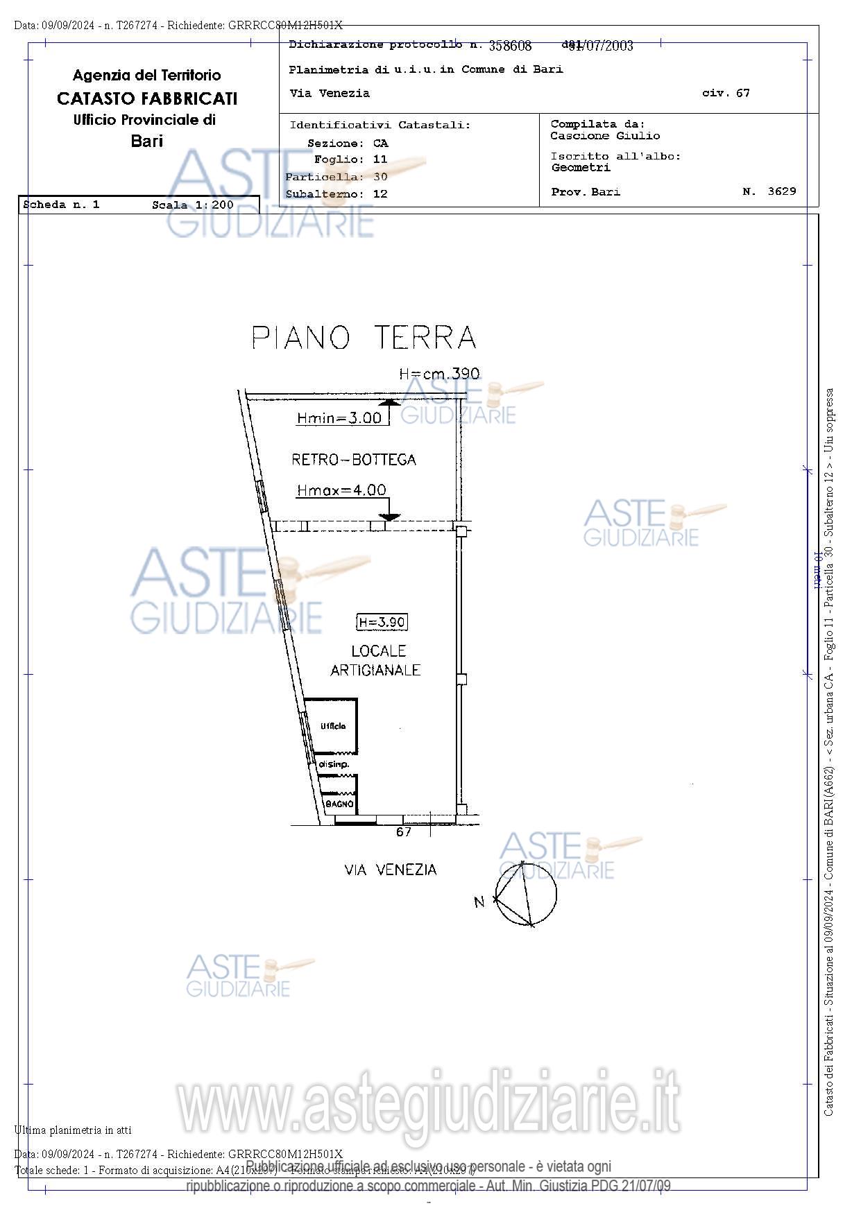 Vendita all'asta Senza incanto, con gara telematica asincrona - LOTTO UNICO: Immobile costituito da locale ad uso laboratorio posto a piano terra di un fabbricato su due livelli. E’ dotato di vetrina con porta d’ingresso e saracinesca prospiciente la via Venezia. Si sviluppa su pianta allungata ed è costituito da un grande locale deposito, una stanza ad uso ufficio, due servizi, un locale tecnico e un’area espositiva sull’ingresso. Prezzo base € 167.000,00 (offerta minima € 125.250,00). Data inizio operazioni di vendita: 17/06/2026 ore 16:30. Giudice Dott. Antonio Ruffino. Professionista delegato alla vendita Avv. Vittorio Brattelli - Email "v.brattelli@pantaleoebrattelli.it". Custode Giudiziario Avv. Vittorio Brattelli - Email "v.brattelli@pantaleoebrattelli.it". Rif. Tribunale di Bari - Espropriazione immobiliare (cartabia) n. 504/2023
