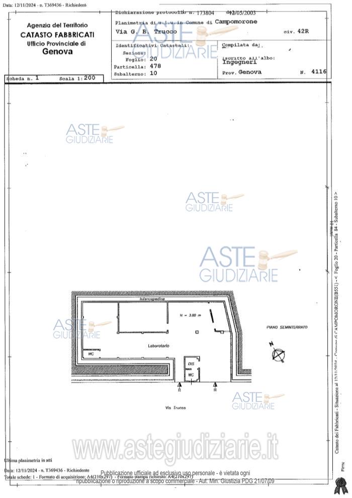 Vendita all'asta Senza incanto, con gara telematica sincrona mista - LOTTO 1: Immobile ubicato a Campomorone (GE) - Via Battista Trucco, edificio 42 R, piano Seminterrato. Prezzo base € 15.444,00 (offerta minima € 11.583,00). Data vendita 26/03/2026 ore 16:00. Giudice Tommaso Sdogati. Professionista delegato alla vendita Avv. Barbara Zacchini - Email "barbarazacchini@gmail.com"; Tel. 010590905. Custode Giudiziario Dott. Renata Boilini - Email "visitegenova@sovemo.com"; Tel. 0105299253. Rif. Tribunale di Genova - Esecuzione immobiliare post legge 80 n. 367/2024