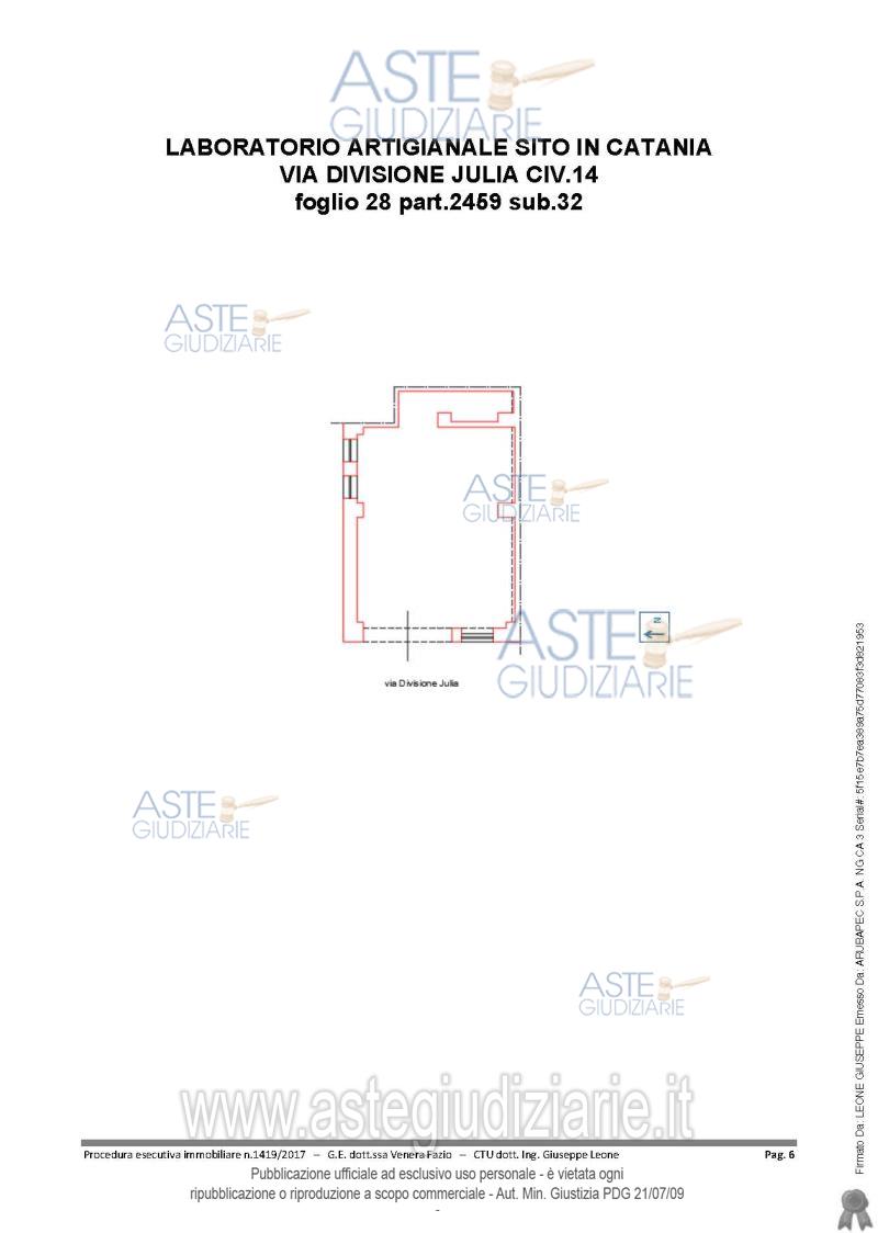 Vendita all'asta Senza incanto, con gara telematica sincrona mista - LOTTO 2: piena proprietà locale piano terra Via Divisione julia n. 14 (catastalmente laboratorio per arti e mestieri) costituito da unico ambiente con piccolo vano retrostante .Superficie MQ46. Occupato. Prezzo base € 12.000,00 (offerta minima € 9.000,00). Data vendita 23/12/2025 ore 12:30. Giudice Venera Fazio. Professionista delegato alla vendita Avv. Bennati Marianna - Email "tbenn@tin.it". Custode Giudiziario Avv. Bennati Marianna - Email "tbenn@tin.it". Rif. Tribunale di Catania - Esecuzione immobiliare post legge 80 n. 1419/2017