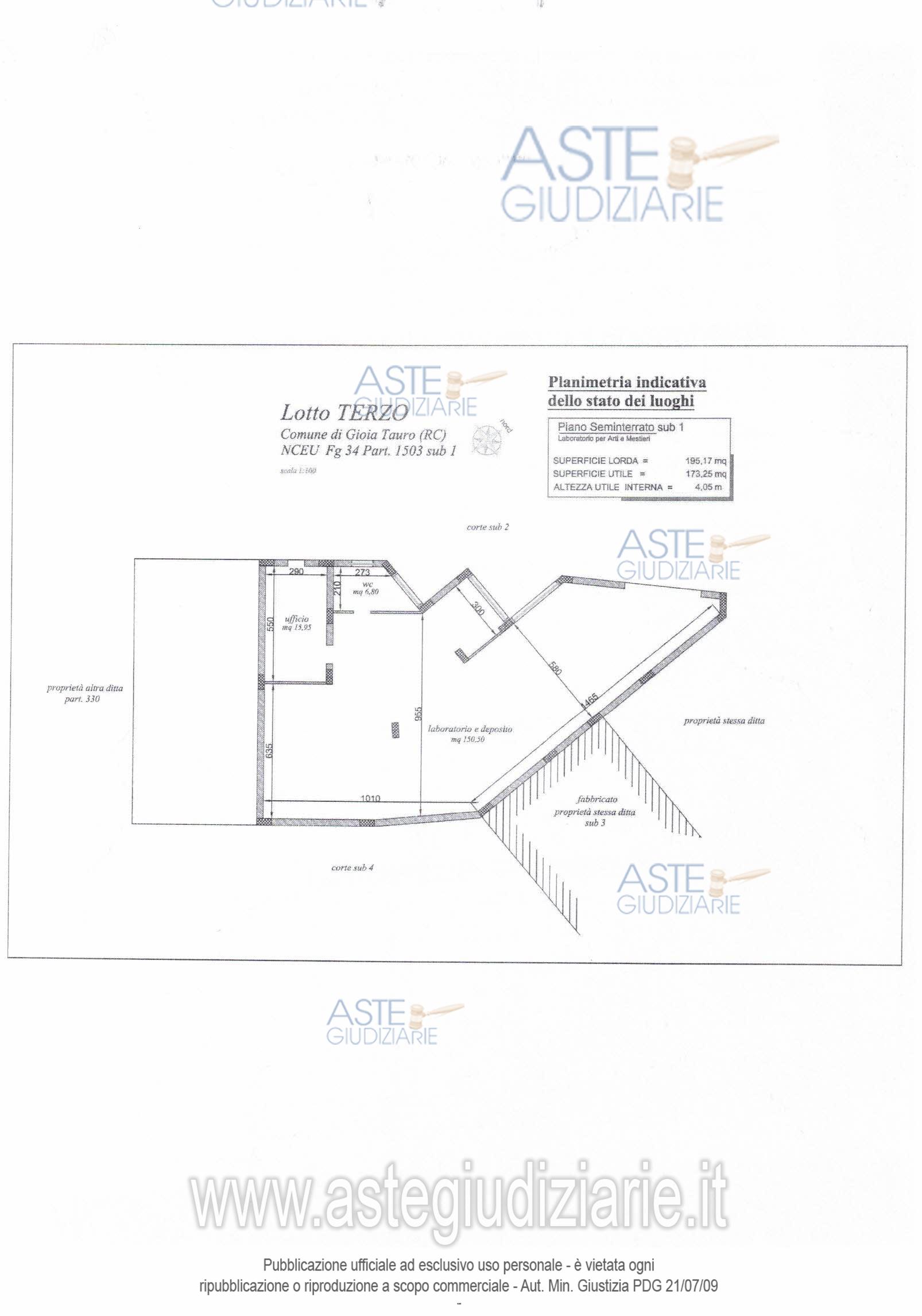 Vendita all'asta Senza incanto, con gara telematica asincrona - LOTTO 3: Laboratorio di arti e Mestieri di recente costruzione. Il laboratorio costituente il presente lotto di vendita è ubicato al PS1. Si articola su un unico piano ed è composto da un unico grande ambiente, in parte soppalcato, da ufficio, servizio igienico, mq 195,17; superficie utile laboratorio è mq 173,25. Immobile con vincolo paesaggistico. Cat. C/3, cl. 2, 165 mq, sup. cat. Totale 198 mq. Prezzo base € 13.307,55 (offerta minima € 9.980,66). Data inizio operazioni di vendita: 08/01/2026 ore 17:00. Giudice Dott. Marta Caineri. Professionista delegato alla vendita Dott. Angela Speranza - Email "dott_angelasperanza@libero.it"; Cell. 3395731808; Tel. 0966614976. Custode Giudiziario Dott. Angela Speranza - Email "dott_angelasperanza@libero.it"; Cell. 3395731808; Tel. 0966614976. Rif. Tribunale di Palmi - Esecuzione immobiliare post legge 80 n. 27/2021