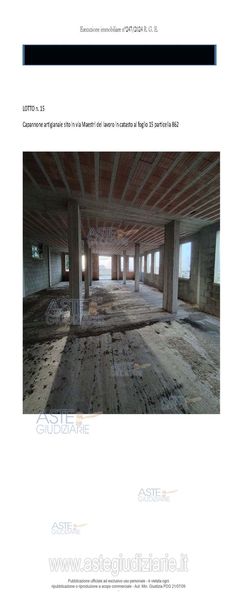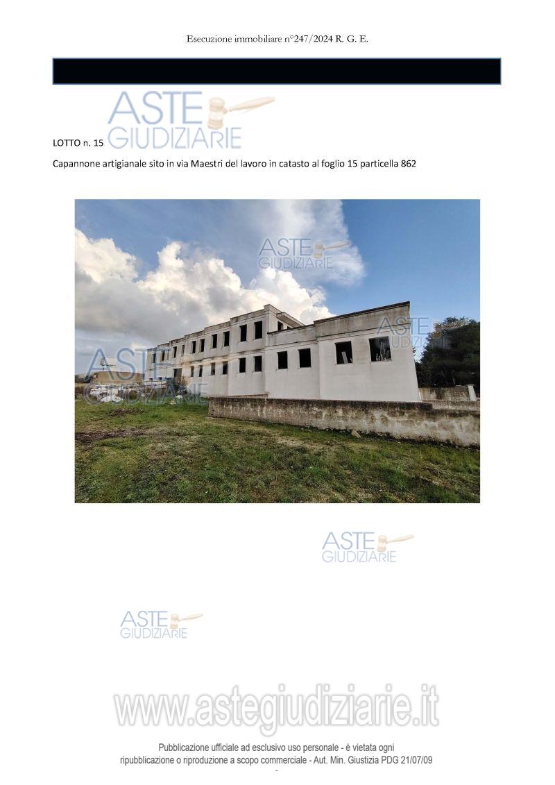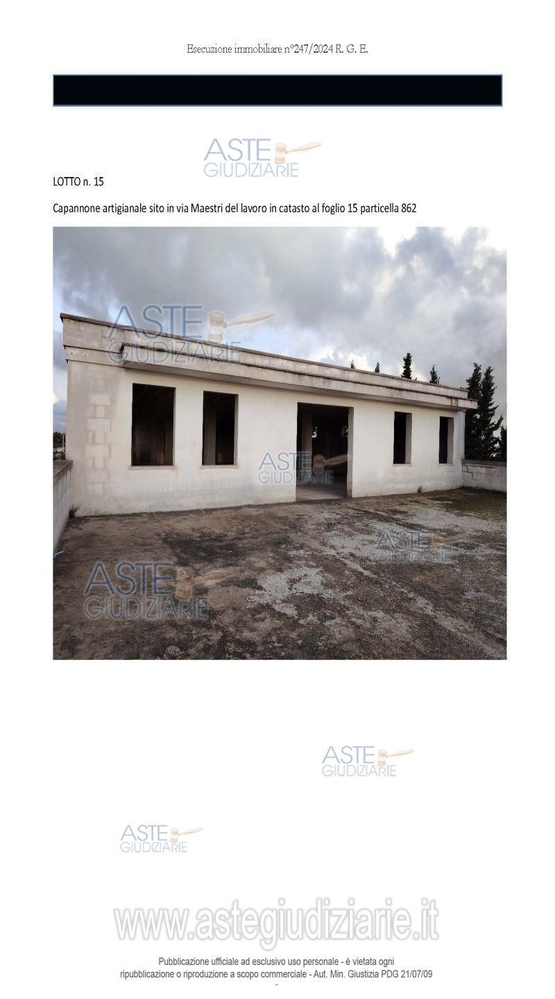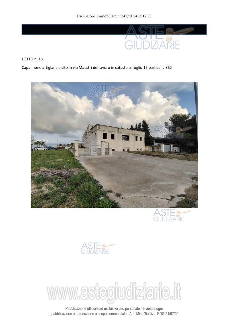 Vendita all'asta Senza incanto, con gara telematica asincrona - LOTTO 15: Capannone artigianale sito a Matino in via Maestri Del Lavoro, della superficie commerciale di 1.415,60 mq per la quota di 1/1 di piena proprietà. Prezzo base € 362.775,00 (offerta minima € 272.081,25). Data inizio operazioni di vendita: 06/05/2026 ore 12:00. Giudice Dott. Anna Francesca Capone. Professionista delegato alla vendita Avv. Gabriele Toma - Tel. 3493932555 - 3928274. Custode Giudiziario Avv. Gabriele Toma - Tel. 3493932555 - 3928274. Rif. Tribunale di Lecce - Esecuzione immobiliare n. 247/2024
