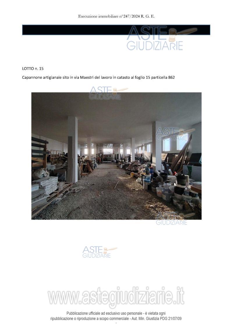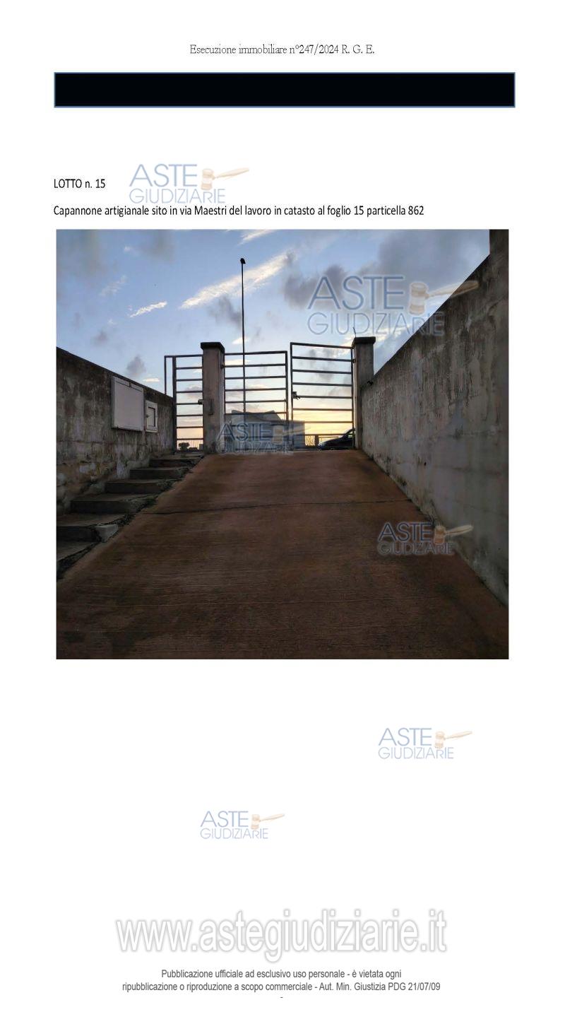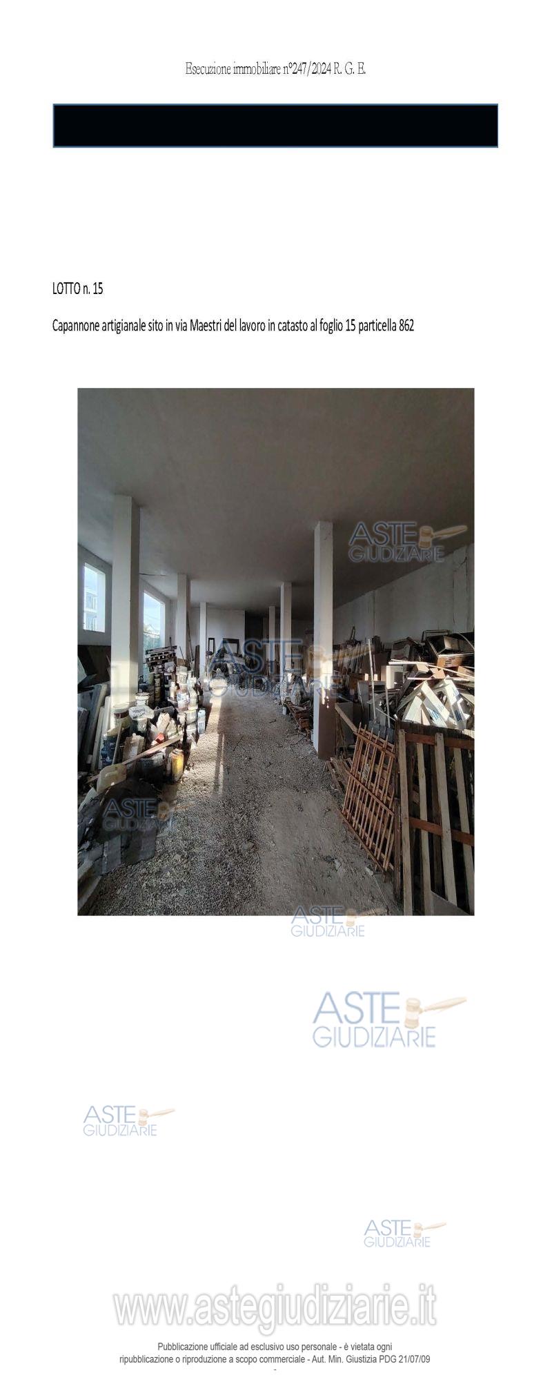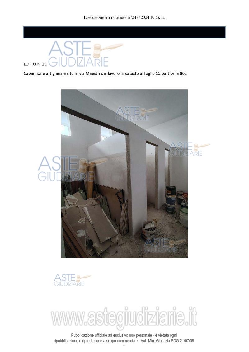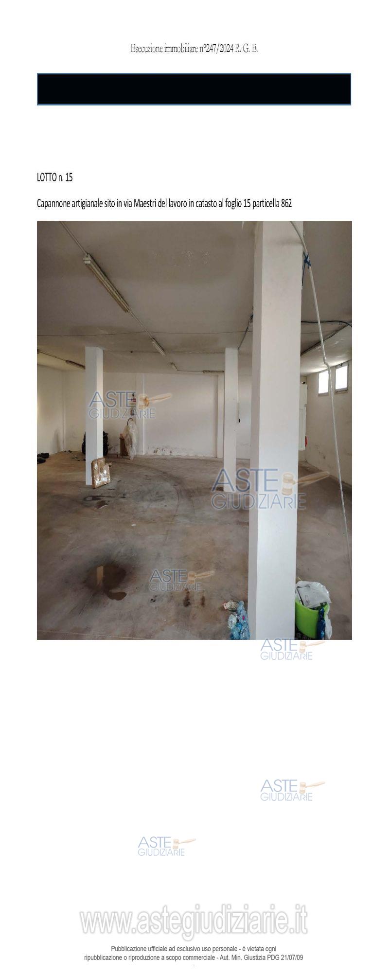 Vendita all'asta Senza incanto, con gara telematica asincrona - LOTTO 15: Capannone artigianale sito a Matino in via Maestri Del Lavoro, della superficie commerciale di 1.415,60 mq per la quota di 1/1 di piena proprietà. Prezzo base € 362.775,00 (offerta minima € 272.081,25). Data inizio operazioni di vendita: 06/05/2026 ore 12:00. Giudice Dott. Anna Francesca Capone. Professionista delegato alla vendita Avv. Gabriele Toma - Tel. 3493932555 - 3928274. Custode Giudiziario Avv. Gabriele Toma - Tel. 3493932555 - 3928274. Rif. Tribunale di Lecce - Esecuzione immobiliare n. 247/2024