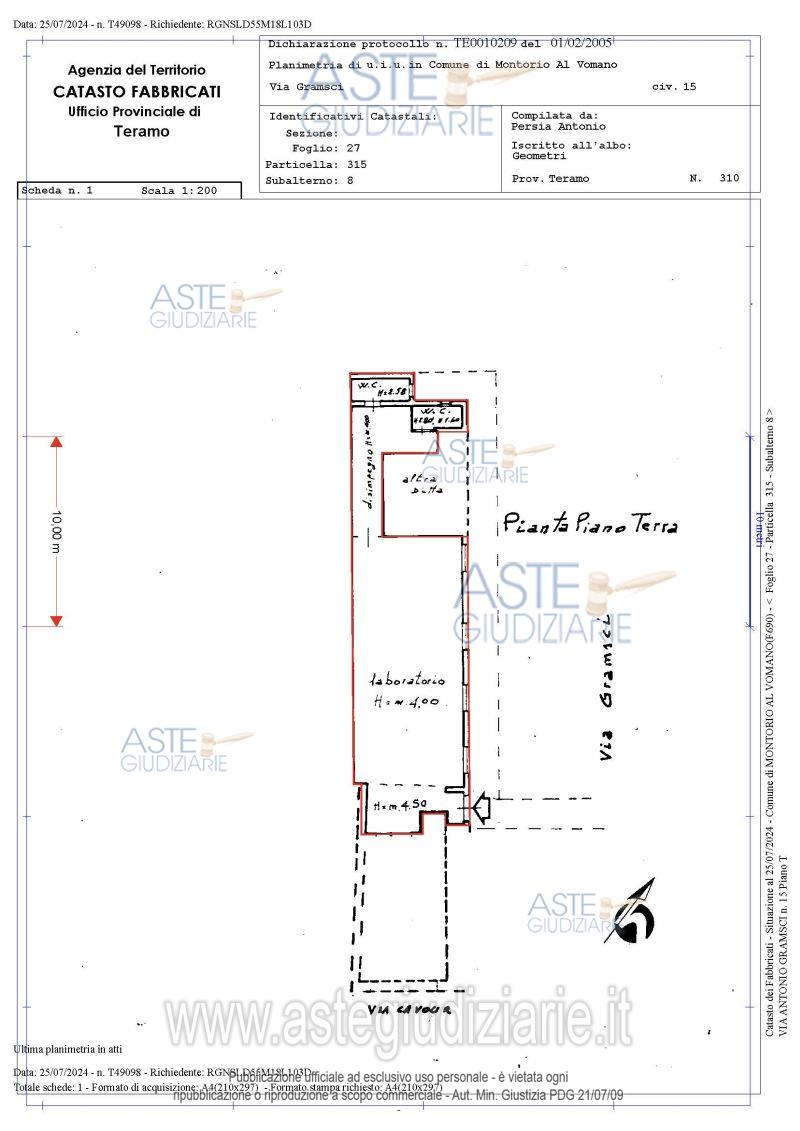 Vendita all'asta Senza incanto, con gara telematica asincrona - LOTTO UNICO: Diritti pari ad 1/1 della piena proprietà su un laboratorio artigianale ed adiacente locale commerciale disposti su unico livello, posti al piano terra, composti rispettivamente da unico locale con servizi il tutto sito nel Comune di Montorio (TE) in Via Cavour n. 7 e Via Gramsci n. 15. Prezzo base € 33.750,00 (offerta minima € 25.313,00). Data inizio operazioni di vendita: 16/12/2025 ore 16:00. Professionista delegato alla vendita Roberto Faragalli - Email "roberto.faragalli@rcmdataservice.it"; Cell. 3313598609. Custode Giudiziario Roberto Faragalli - Email "roberto.faragalli@rcmdataservice.it"; Cell. 3313598609. Rif. Tribunale di Teramo - Espropriazione immobiliare (cartabia) n. 25/2024