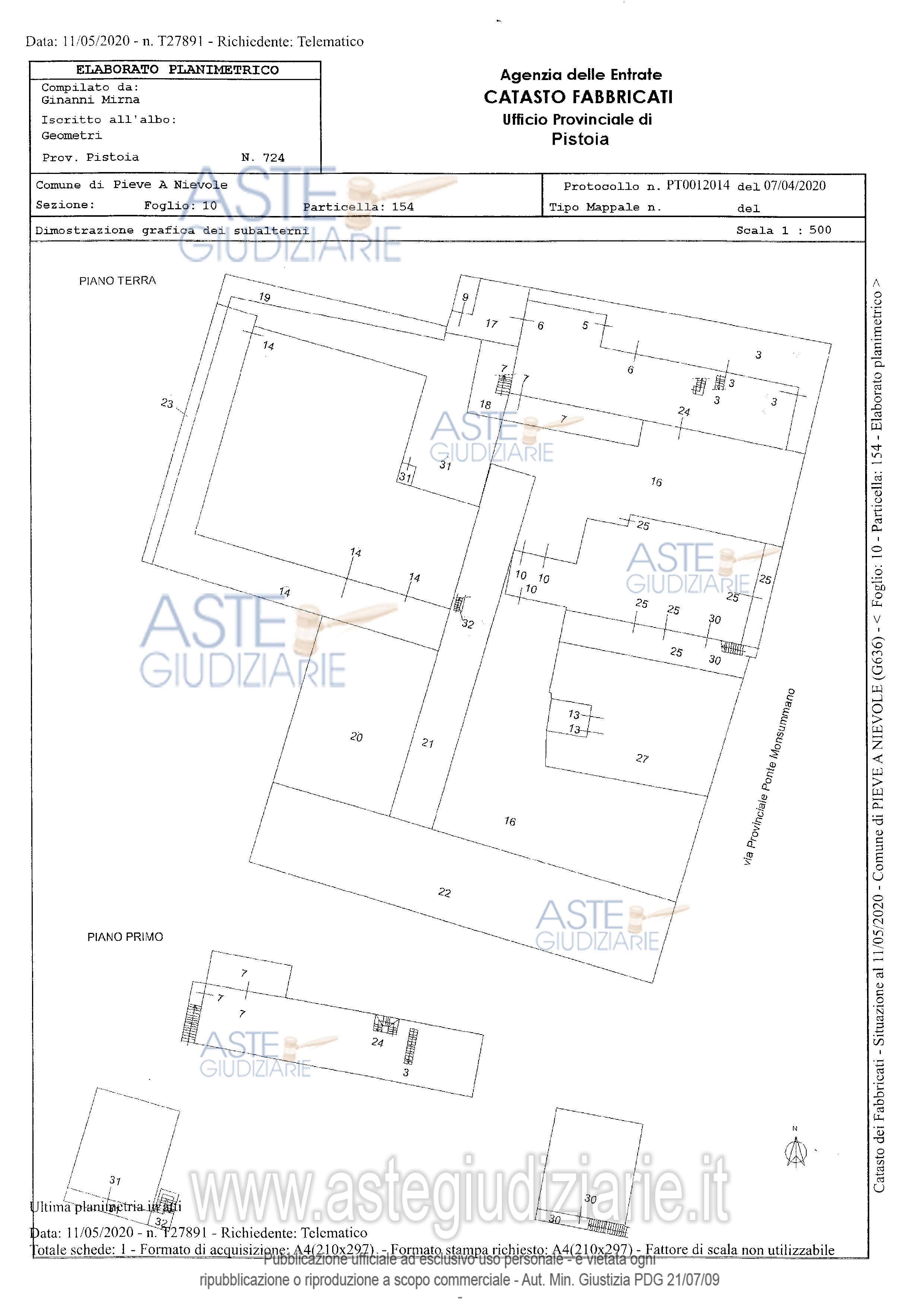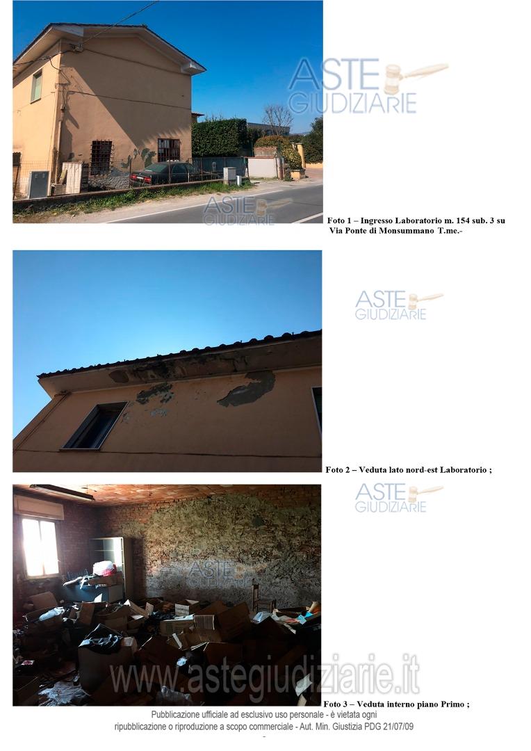 Vendita all'asta Senza incanto, con gara telematica asincrona - LOTTO 1: Unità immobiliare ad uso di laboratorio artigianale in condizioni di manutenzione econservazione sufficienti, salvo infiltrazioni acque meteoriche dal tetto. Detta unità è dislocatasu due piani fuori terra ed affacciante con il lato est sulla via Provinciale Ponte Monsummano.Tale unità è corredata da modeste resedi pertinenziali esclusive di cui, quella a nord, viene adessere gravata da servitù di passo a favore di quei beni posti nella parte ovest del fabbricato. Prezzo base € 32.730,00 (offerta minima € 24.550,00). Data inizio operazioni di vendita: 19/03/2026 ore 12:00. Professionista delegato alla vendita Avv. Marco Labate - Cell. 3387512585. Custode Giudiziario Geom. Luca Santiloni - Email "lucasantiloni@hsmail.it"; Cell. 3483328725. Rif. Tribunale di Pistoia - Esecuzione immobiliare post legge 80 n. 135/2009