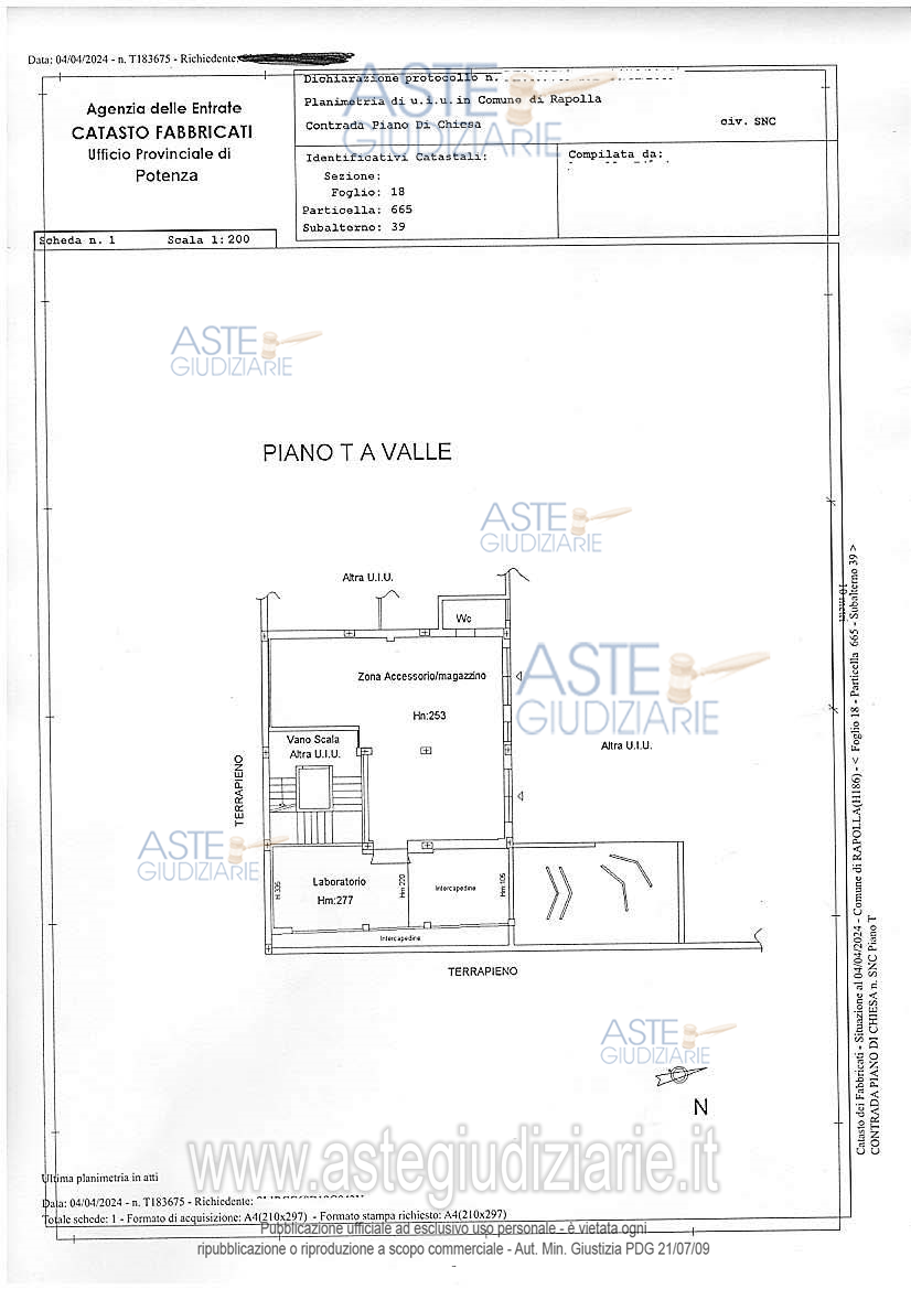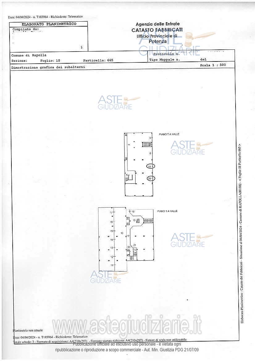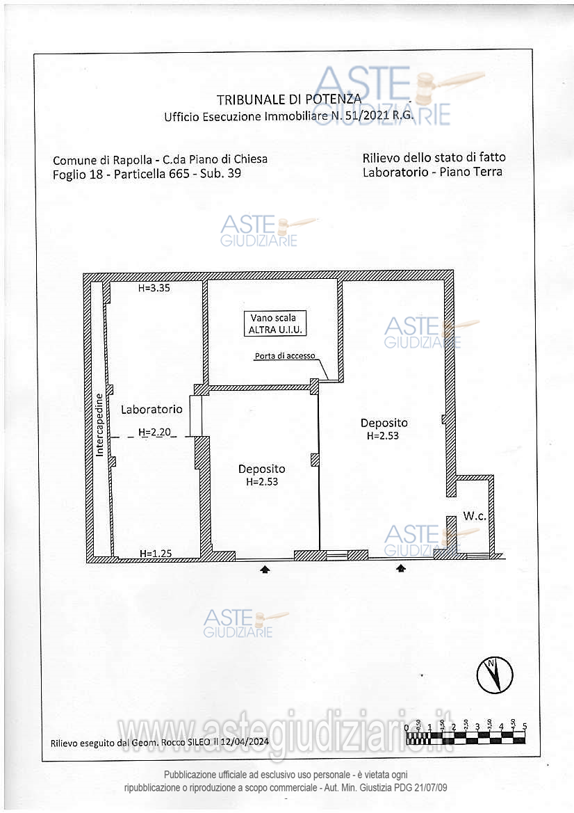 Vendita all'asta Senza incanto, con gara telematica asincrona - LOTTO UNICO: 1/1 proprietà di laboratorio ubicato nel Comune di Rapolla (PZ) alla C/da Piano di Chiesa n. 80, sito al piano terra,composto da due locali depositi di altezza pari a mt. 2,53, ciascuno con ingresso autonomo, e un wc, da un deposito si accede al locale laboratorio che ha un’altezza variabile da mt. 3,35 e mt. 1,25; censito nel C. F. di detto Comune al fg. 18,part. 665,sub. 39, cat.C/3, cl.2, cons. 129 mq., rendita € 199,87; intercluso;. Prezzo base € 34.050,00 (offerta minima € 25.537,50). Data inizio operazioni di vendita: 26/05/2026 ore 10:00. Professionista delegato alla vendita Avv. Michele Mascolo - Email "michelemascolo@tiscali.it"; Cell. 3286953907; Tel. 3286953907. Custode Giudiziario Avv. Michele Mascolo - Email "michelemascolo@tiscali.it"; Cell. 3286953907; Tel. 3286953907. Rif. Tribunale di Potenza - Esecuzione immobiliare post legge 80 n. 51/2021