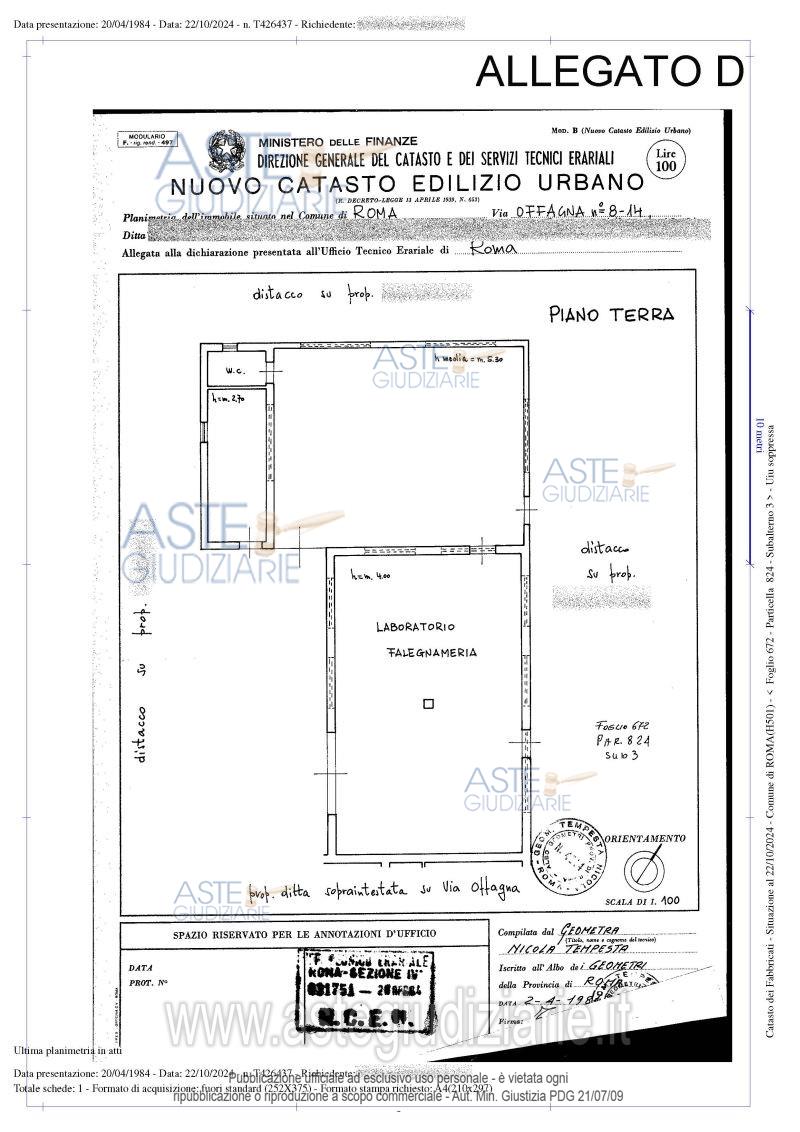 Vendita all'asta Senza incanto, con gara telematica asincrona - LOTTO UNICO: Laboratorio in Roma Via Offagna, piano terra con accesso carraio dal civico 12 e pedonale dal civico 8, per una superficie convenzionale complessiva di mq. 101,64 circa (comprensiva dell’ampia area esterna di carico e scarico agevolmente fruibile in comproprietà con gli altri subalterni dell’edificio). Prezzo base € 62.000,00 (offerta minima € 46.500,00). Data inizio operazioni di vendita: 13/05/2026 ore 10:00. Giudice Lauropoli. Professionista delegato alla vendita Avv. Roberto Tartaglia. Custode Giudiziario Ivg Di Roma Srl - Email "pvp@visiteivgroma.it"; Tel. 0689569801. Rif. Tribunale di Roma - Espropriazione immobiliare (cartabia) n. 318/2024