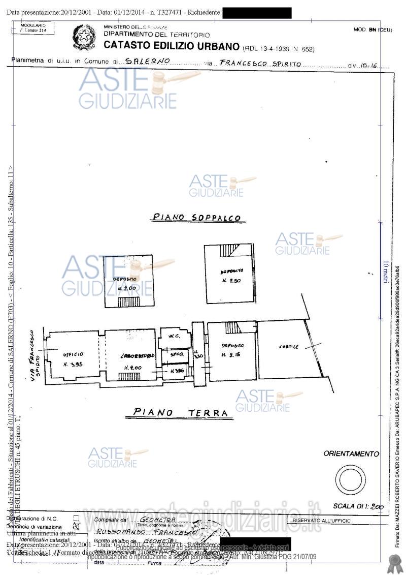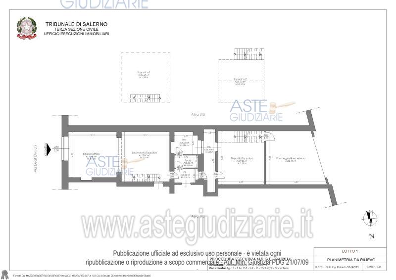 Vendita all'asta Senza incanto, con gara telematica asincrona - LOTTO 1: Piena proprietà di locale terraneo ad uso laboratorio con accesso principale dal civico 45 di via degli Etruschi in località Matierno del Comune di Salerno. L'unità immobiliare si articola in tre vani principali oltre ai locali adibiti a WC e spogliatoio, disimpegno e due soppalchi, per una superficie utile complessiva di circa 151 mq, oltre area esterna esclusiva di 32 mq adibita a parcheggio, con accesso pedonale dal locale e carrabile da strada secondaria. Prezzo base € 50.496,00 (offerta minima € 37.872,00). Data inizio operazioni di vendita: 21/04/2026 ore 16:00. Giudice Enza Faracchio. Professionista delegato alla vendita Avv. Rossella Ferrucci. Custode Giudiziario Avv. Rossella Ferrucci - Email "rossella.ferrucci@libero.it"; Cell. 3287545213; Tel. 0813931855. Rif. Tribunale di Salerno - Esecuzione immobiliare post legge 80 n. 394/2014