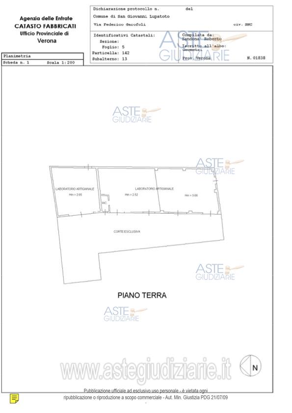 Vendita all'asta Senza incanto, con gara telematica sincrona mista - LOTTO UNICO: LOTTO UNICO - In Comune San Giovanni Lupatoto (VR) Via Federico Garofoli 180, ingresso pedonale e carraio da stradello interno, traversa dell’arteria stradale principale, piena proprietà di laboratorio artigianale per l’attività di falegnameria, ubicato all’interno di una corte in un corpo di fabbrica isolato al piano terra di circa 171 mq commerciali con corte esclusiva di 140 mq circa, oltre alla proporzionale quota di comproprietà sulle parti comuni in particolare sulla corte m.n. 142 sub 11 BCNC. Prezzo base € 127.000,00 (offerta minima € 95.250,00). Data vendita 18/06/2026 ore 14:00. Giudice Paola Salmaso. Professionista delegato alla vendita Not. Elena Marangoni - Email "notes@notariato.it"; Tel. 0458006661. Custode Giudiziario Dott. Tatiana Bianchetti - Email "tbianchetti@gmail.com"; Tel. 0458002630. Rif. Tribunale di Verona - Contenzioso civile n. 2650/2025