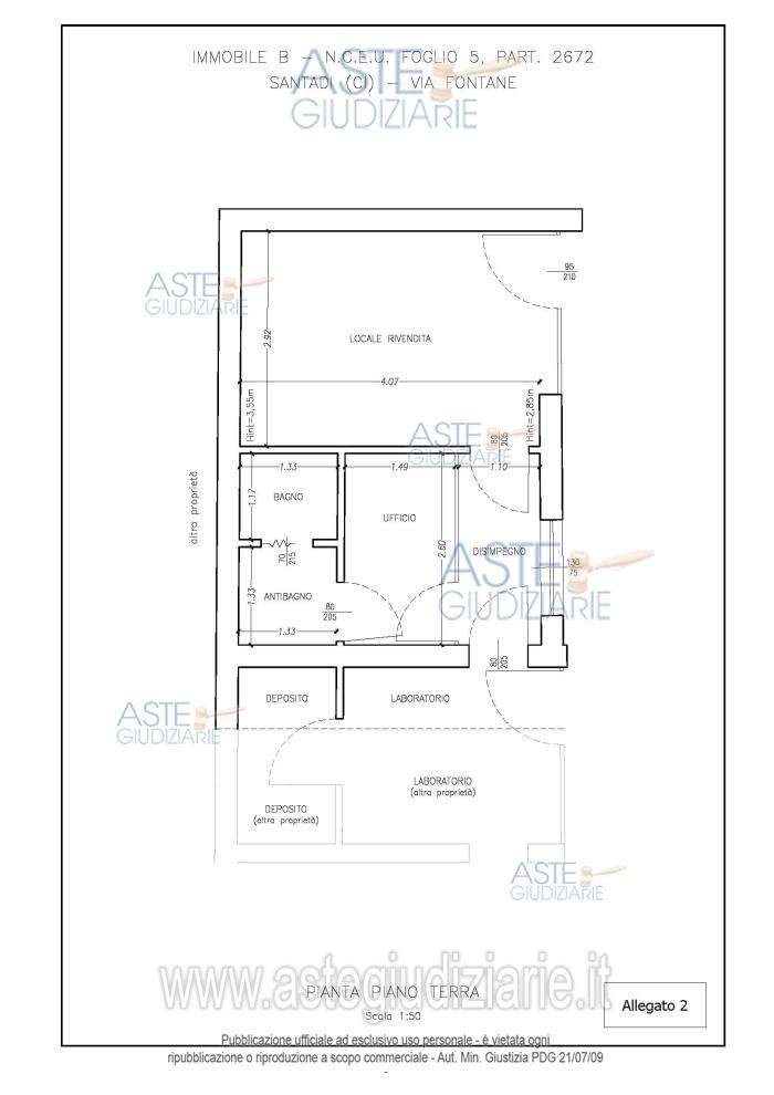 Vendita in attesa dell'emissione del nuovo bando d'asta. LOTTO 2: Quota pari a 1/1 del diritto di proprietà su unità immobiliare a destinazione laboratorio artigianale, sita in Comune di Santadi, Via Fontane, piano terra (nella visura catastale aggiornata al 22/11/2023 è indicato il civico n.81) identificata al Catasto Fabbricati del Comune di Santadi alla Sezione Urbana E, Foglio 5, Particella 2672, Cat. C/1, Classe 8, Consistenza 33 mq, rendita catastale € 395,40, . Ultimo prezzo base € 19.745,98 (offerta minima € 14.809,48). Giudice Dott. Valentina Frongia. Professionista delegato alla vendita Rag. Maria Gabriella Curto - Email "curtogabri@tiscali.it"; Tel. 0702058710. Rif. Tribunale di Cagliari - Esecuzione immobiliare post legge 80 n. 285/2012