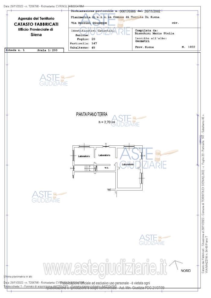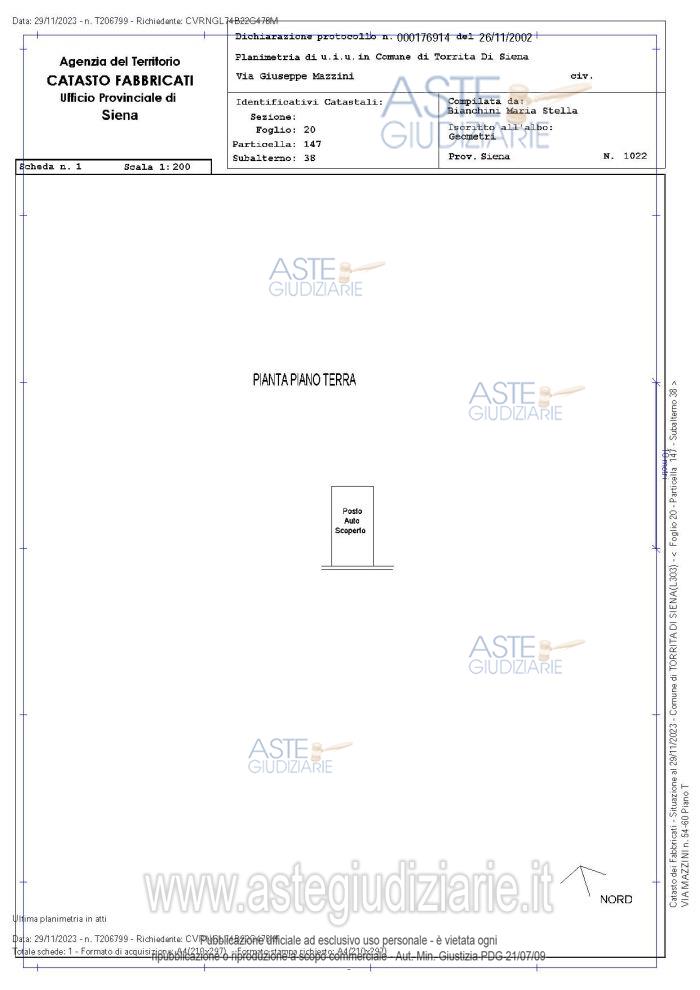 Vendita all'asta Senza incanto, con gara telematica asincrona - LOTTO UNICO: Diritto di piena proprietà per la quota di 1/1 su laboratorio e due posti auto in Comune di Torrita di Siena (SI), via G. Mazzini n. 54 e Via Luretana n. 2. Il Laboratorio si trova al piano terra dell’edificio e presenta una superficie utile netta pari a circa mq 68,00. Vi si accede dalla pubblica via attraverso la corte che circonda il fabbricato. La divisione interna è la seguente: ingresso, due vani, un bagno. Prezzo base € 48.000,00 (offerta minima € 36.000,00). Data inizio operazioni di vendita: 19/05/2026 ore 10:00. Giudice Marta Dell'unto. Professionista delegato alla vendita Dott. Luca Fatichenti - Email "luca@studio.fatichenti.com"; Tel. 0577779779. Custode Giudiziario Avv. Istituto Vendite Giudiziarie Siena - Email "visite.ivg@gmail.com"; Tel. 0577318111. Rif. Tribunale di Siena - Esecuzione immobiliare post legge 80 n. 47/2023