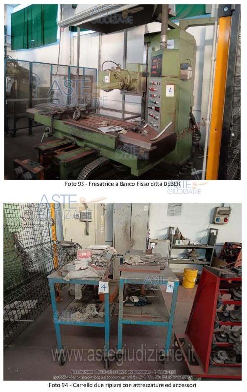 Vendita in attesa dell'emissione del nuovo bando d'asta. LOTTO 4: •Fresatrice a Banco Fisso ditta DEBER Fresatrici Universali sas di Bernardi Giovanni &. Cl, modello FBF – 2000, matricola 08071, anno di fabbricazione 2000 completa di recinzione di protezione;•N.4 Carrello con struttura in metallo a due ripiani con un piano in legno e uno in alluminio con attrezzature ed accessori vari quali chiavi, bulloni, blocchi scanalati ecc.•N.2 Rastrelliere su ruote a forma triangolare di colore rosso con supporti e frese di varie dimensioni e tipologia;•scaffale piccolo con blocco fresa;•armadietto in metallo a una anta;•armadio in metallo a due ante contenente accessori utensili e ricambi frese di varia tipologia e dimensione;•scaffale in metallo a 4 ripiani con attrezzature e supporti vari;•scaffale in metallo a 4 ripiani con morsa da banco;•Carrello con struttura in metallo a due ripiani con un piano in legno e uno in alluminio;•Carrello con struttura in metallo a due ripiani con un piano in legno e uno in alluminio. Ultimo prezzo base € 4.843,50 (offerta minima € 3.632,63). Giudice Dott. Maria Azzurra Guerra. Curatore Avv. Giuseppe Canfora - Email "avv.canforagiuseppe@gmail.com". Rif. Tribunale di Trani - Liquidazione giudiziale(cci) n. 40/2025
