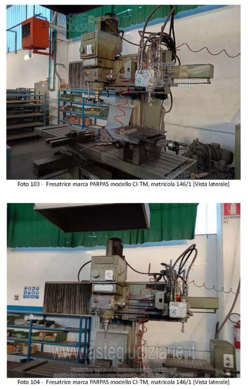 Vendita in attesa dell'emissione del nuovo bando d'asta. LOTTO 5: •Fresatrice marca PARPAS modello CI-TM, matricola 146/1, anno di costruzione 1986, completa di copiatore CONTOUR SCAN modello MCDM-4 cod. 0440064 matricola 8900299;•Scaffale con struttura in metallo a 4 ripiani contenente utensili varia misura e frese complete di supporto mandrino;•Scaffale con struttura in metallo a 5 ripiani contenente contenitori in plastica di colore verde contenente materiale vario per l'assemblaggio delle forme di alluminio;•Armadio in metallo a due ante;•N.20 carrelli con struttura in metallo a 5 e 6 ripiani in legno varie dimensione e altezze. Ultimo prezzo base € 3.532,50 (offerta minima € 2.649,37). Giudice Dott. Maria Azzurra Guerra. Curatore Avv. Giuseppe Canfora - Email "avv.canforagiuseppe@gmail.com". Rif. Tribunale di Trani - Liquidazione giudiziale(cci) n. 40/2025