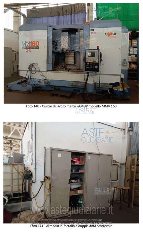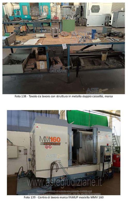 Vendita in attesa dell'emissione del nuovo bando d'asta. LOTTO 9: •Tavolo da lavoro con struttura in metallo e due piani in legno, con doppio cassetto, morsa, piano di acciaio e attrezzi e accessori vari;•Centro di lavoro marca FAMUP modello MMV 160 Matricola 16001601 anno di fabbricazione 2001;•Armadio in metallo a doppia anta scorrevole contenete accessori, attrezzature ed utensili vari;•Armadio in metallo a doppia anta scorrevole contenete accessori, e materiale di vario genere;•Vasca contenitrice sversamento liquidi e cisternetta;•N.2 Vasche contenitrici sversamento liquidi una con cisternetta una con serbatoio in materiale plastico colore nero;•Bidone aspiratutto con aspiratore RIBO modello VS10-479 matricola 39;•Carrello con ruote a 5 ripiani;•Carrello con ruote a 1 ripiano;•Vasca contenitrice sversamento liquidi e tre fusti dotati di pompa manuale per travaso fusti;•Doppio scaffale in metallo a 6 ripiani contenente componenti e attrezzature macchinari obsoleti o non funzionanti;•Scala in metallo fissa a 13 gradini compreso piano di appoggio;•Trapano a colonna marca Famup, tipo TCO PU N, matricola 1861, anno di fabbricazione 1985;•Elettroerosione a tuffo manuale TECNOSPARK A 500, modello 570, matricola 0489920, anno di fabbricazione 1989;•Armadio metallico due ante scorrevoli dim 300x55x180 contenete accessori e minuteria varia. Ultimo prezzo base € 21.063,75 (offerta minima € 15.797,82). Giudice Dott. Maria Azzurra Guerra. Curatore Avv. Giuseppe Canfora - Email "avv.canforagiuseppe@gmail.com". Rif. Tribunale di Trani - Liquidazione giudiziale(cci) n. 40/2025