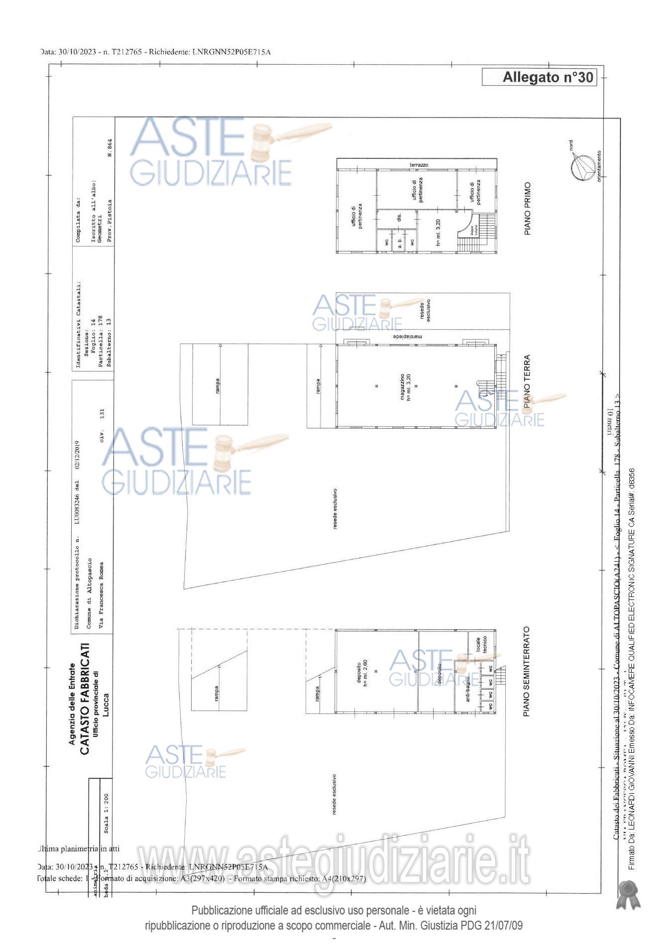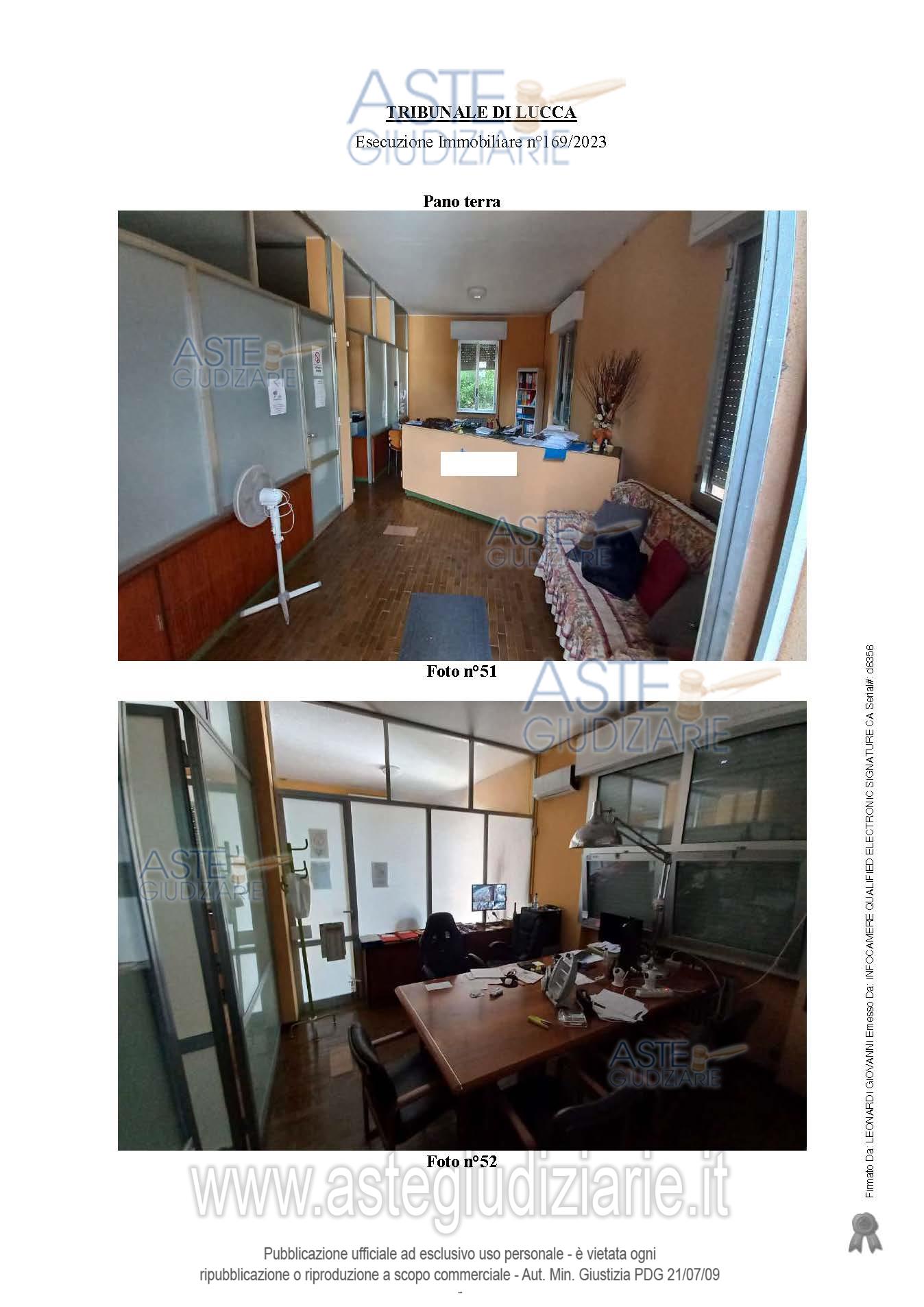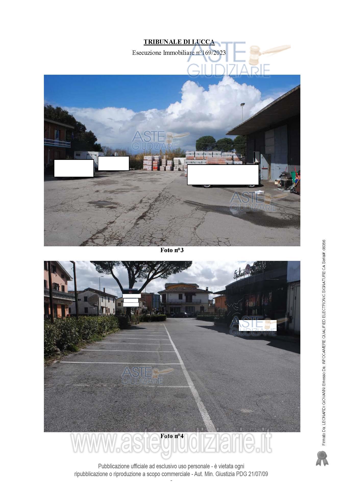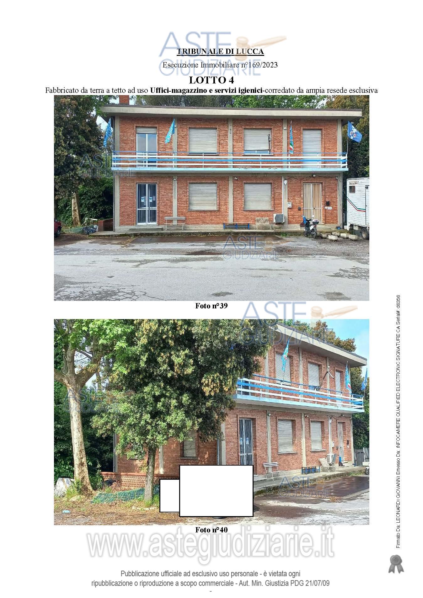 Vendita all'asta Senza incanto, con gara telematica sincrona mista - LOTTO 4: LOTTO QUATTRO La piena proprietà per la quota di 1/1 su fabbricato da terra a tetto ad uso Uffici, magazzino e servizi igienici, elevato su due piani fuori terra, oltre piano seminterrato, corredato da ampia resede esclusiva su due lati, sulla quale insistono le rampe di accesso, nonché piccola resede sul fronte principale dove è collocata la pesa a ponte con bascula interrata, oltre resede comune a servizio anche degli altri immobili che insistono sullo stesso lotto di terreno. Prezzo base € 111.594,38 (offerta minima € 83.695,79). Data vendita 20/01/2026 ore 10:00. Professionista delegato alla vendita Avv. Mario Del Bianco - Email "avv.mariodelbianco@gmail.com"; Tel. 0583490838. Custode Giudiziario Ivg Lucca - Sofir Srl - Email "custodieivg@gmail.com"; Tel. 0583418555. Rif. Tribunale di Lucca - Espropriazione immobiliare (cartabia) n. 169/2023