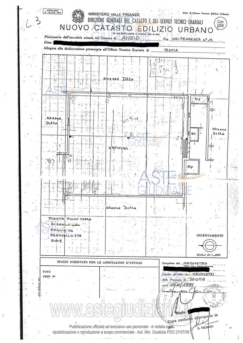Vendita all'asta Senza incanto - LOTTO 3: Locale officina, sito al piano terra con annessi servizi wc e ripostiglio deposito, per una superficie totale di metri quadrati 222,00. Prezzo base € 28.000,00 (offerta minima € 21.000,00). Data vendita 20/05/2026 ore 10:30. Professionista delegato alla vendita Avv. Carlo Annese - Email "avvcarloannese@gmail.com"; Tel. 069631326. Custode Giudiziario Ivg Di Roma - Email "pvp@visiteivgroma.it"; Tel. 0689569801. Rif. Tribunale di Velletri - Esecuzione immobiliare post legge 80 n. 101/2000