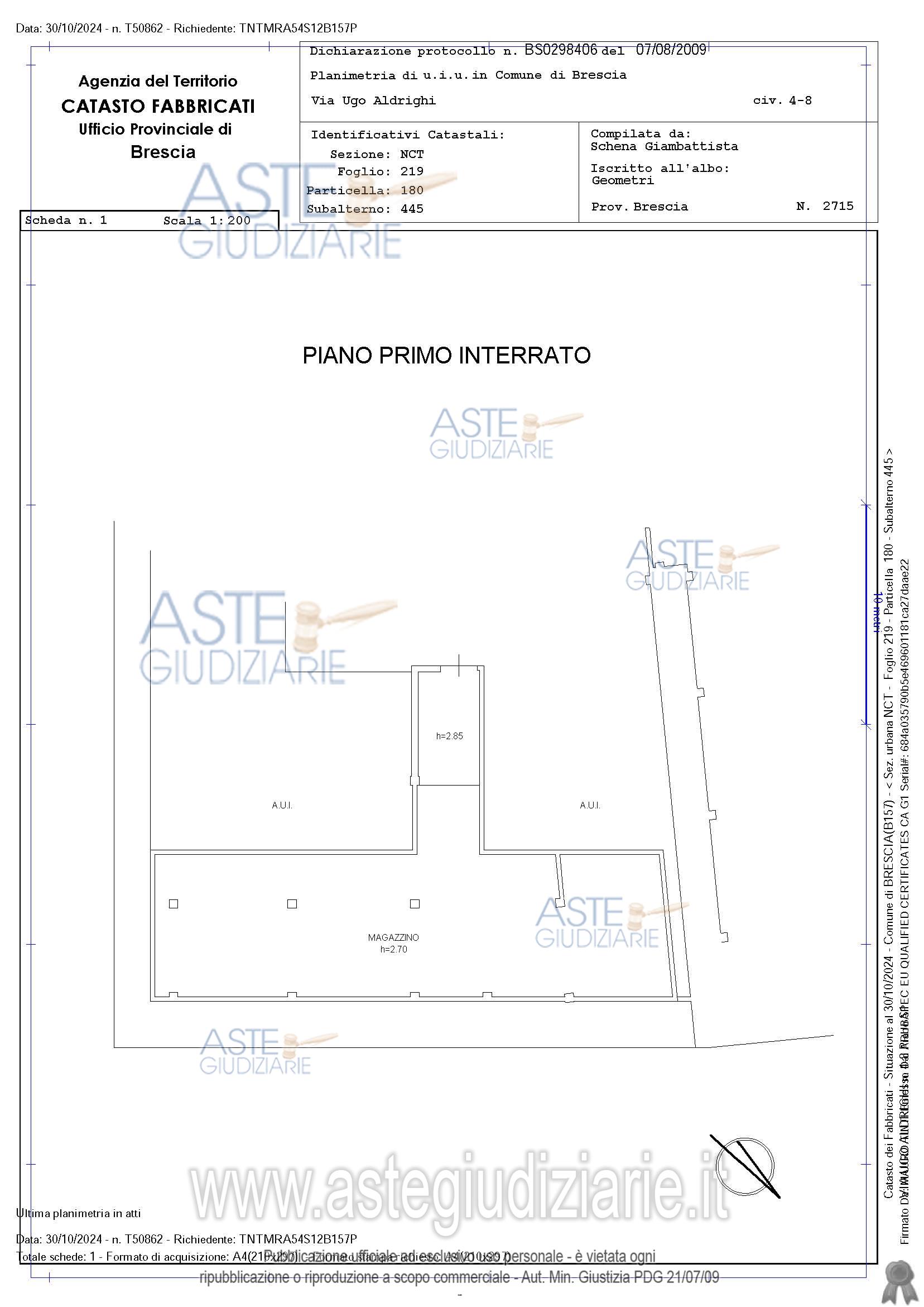 Vendita all'asta Senza incanto, con gara telematica asincrona - LOTTO 58: Piena proprietà. Comune di Brescia (BS), Via Ugo Aldrighi Magazzino parte di complesso immobiliare il tutto censito al Catasto Fabbricati di detto Comune, Sez. NCT Fg. 219. mapp. 180 sub 445 – P. S1 – Z.C. 3 - cat. C/2 - cl. 4 – 174 mq - R.C. Euro 269,59Oltre alle proporzionali quote sulle parti comuni dell’edificio. L’immobile è occupato in forza di contratto di comodato d’uso gratuito. Prezzo base € 63.223,88 (offerta minima € 47.417,91). Data inizio operazioni di vendita: 01/04/2026 ore 11:30. Giudice Dellesecuzione Giudice. Professionista delegato alla vendita Dott. Leonardo Sardini - Email "sardinil@orobianet.it". Custode Giudiziario Dott. Leonardo Sardini - Email "info.bsimmobiliare@gmail.com". Rif. Tribunale di Brescia - Espropriazione immobiliare (cartabia) n. 302/2024
